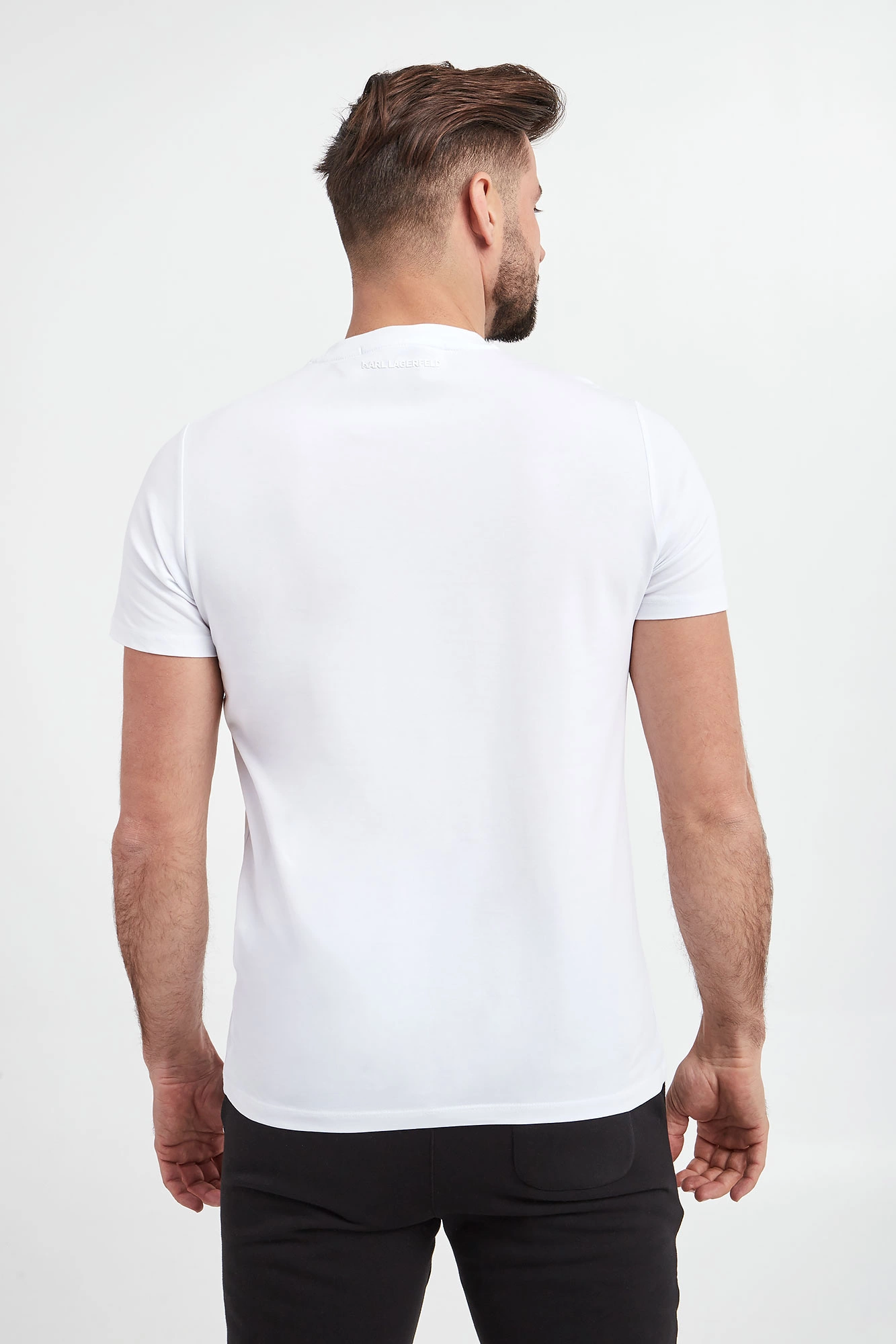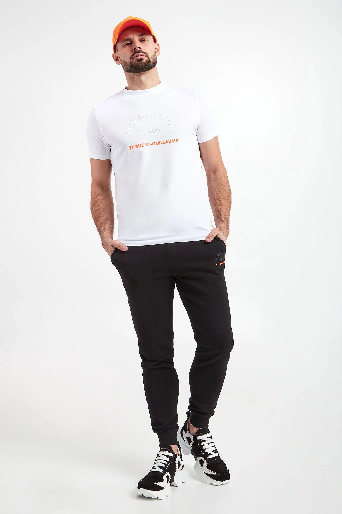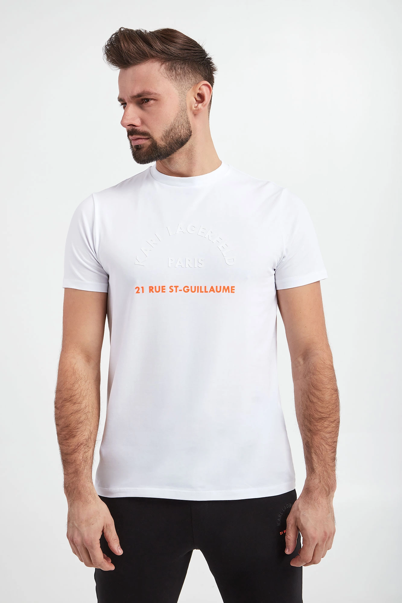 T-shirt marki Karl Lagerfeld w białym kolorze. Wykonany z bawełny domieszką elastycznych włókien. Model pochodzi z linii "Karl Cares", która wspiera zrównoważoną modę. Z przodu gumowany nadruk w postaci nazwy marki w biało-pomarańczowym kolorze. Dekolt typu o-neck wykończony lamówką. Na linii karku gumowany nadruk. Krótkie rękawy wykończone przeszyciem. Fason typu regular.
