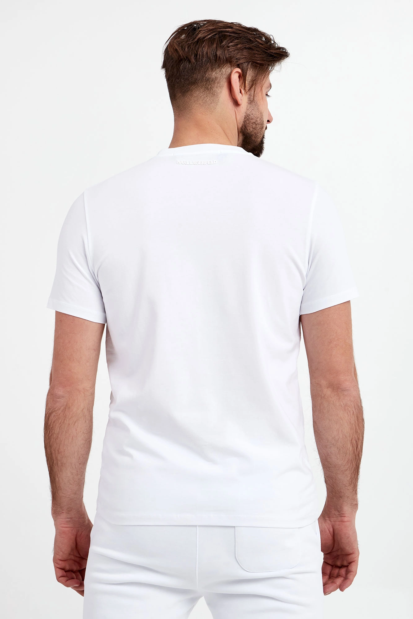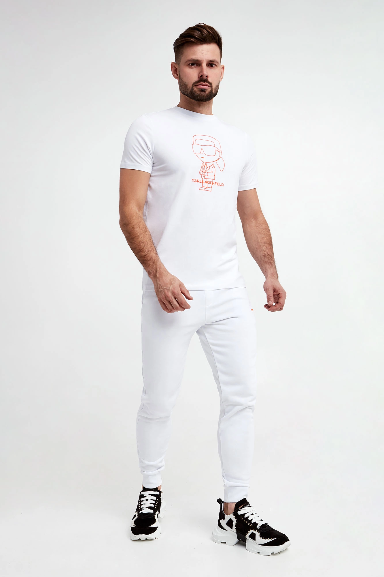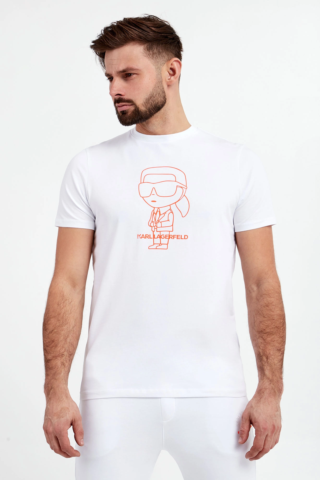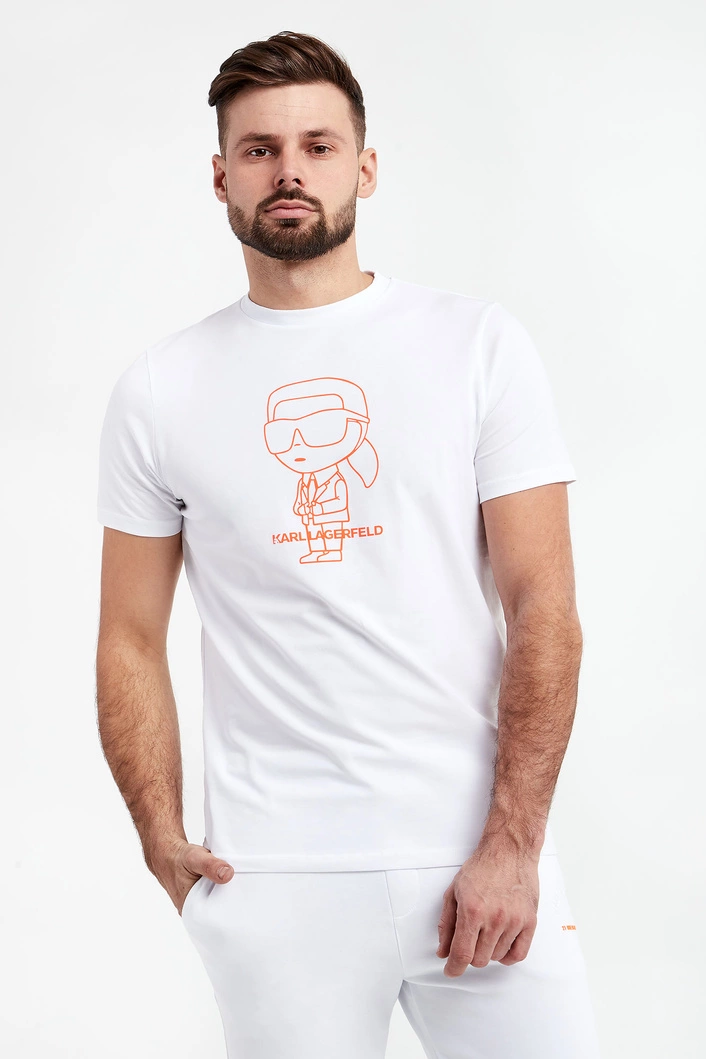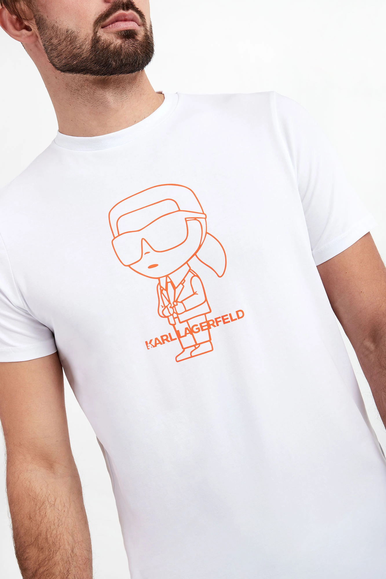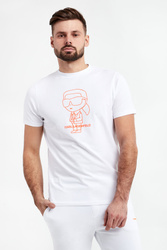T-shirt marki Karl Lagerfeld w białym kolorze. Wykonany z bawełny domieszką elastycznych włókien. Model pochodzi z linii "Karl Cares", która wspiera zrównoważoną modę. Z przodu nadruk w postaci wizerunku założyciela marki w pomarańczowym kolorze. Dekolt typu o-neck wykończony ściągaczem. Na linii karku gumowany nadruk. Krótkie rękawy wykończone przeszyciem. Fason typu slim.