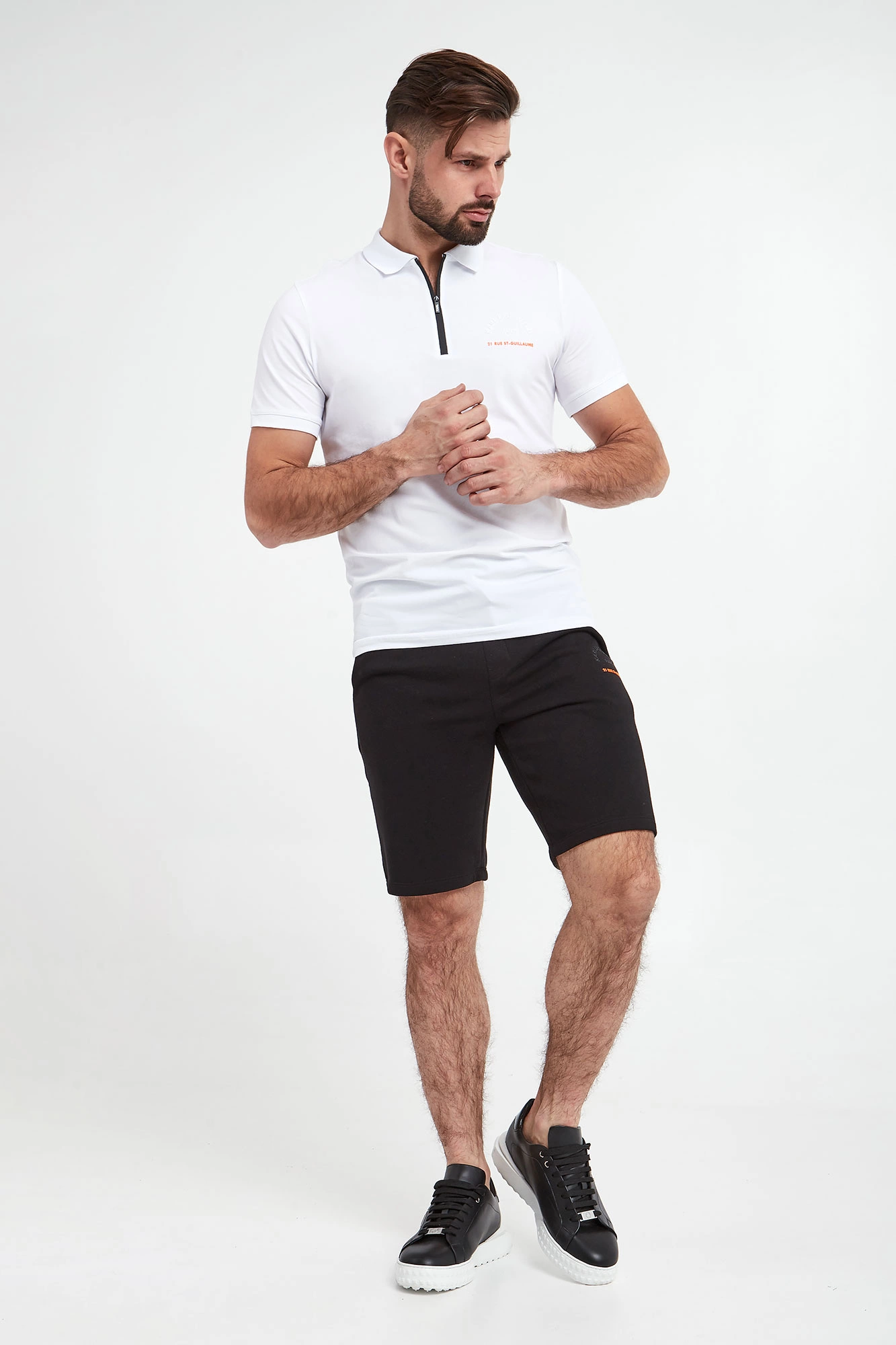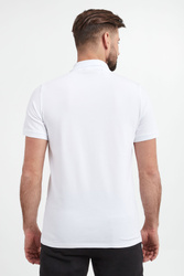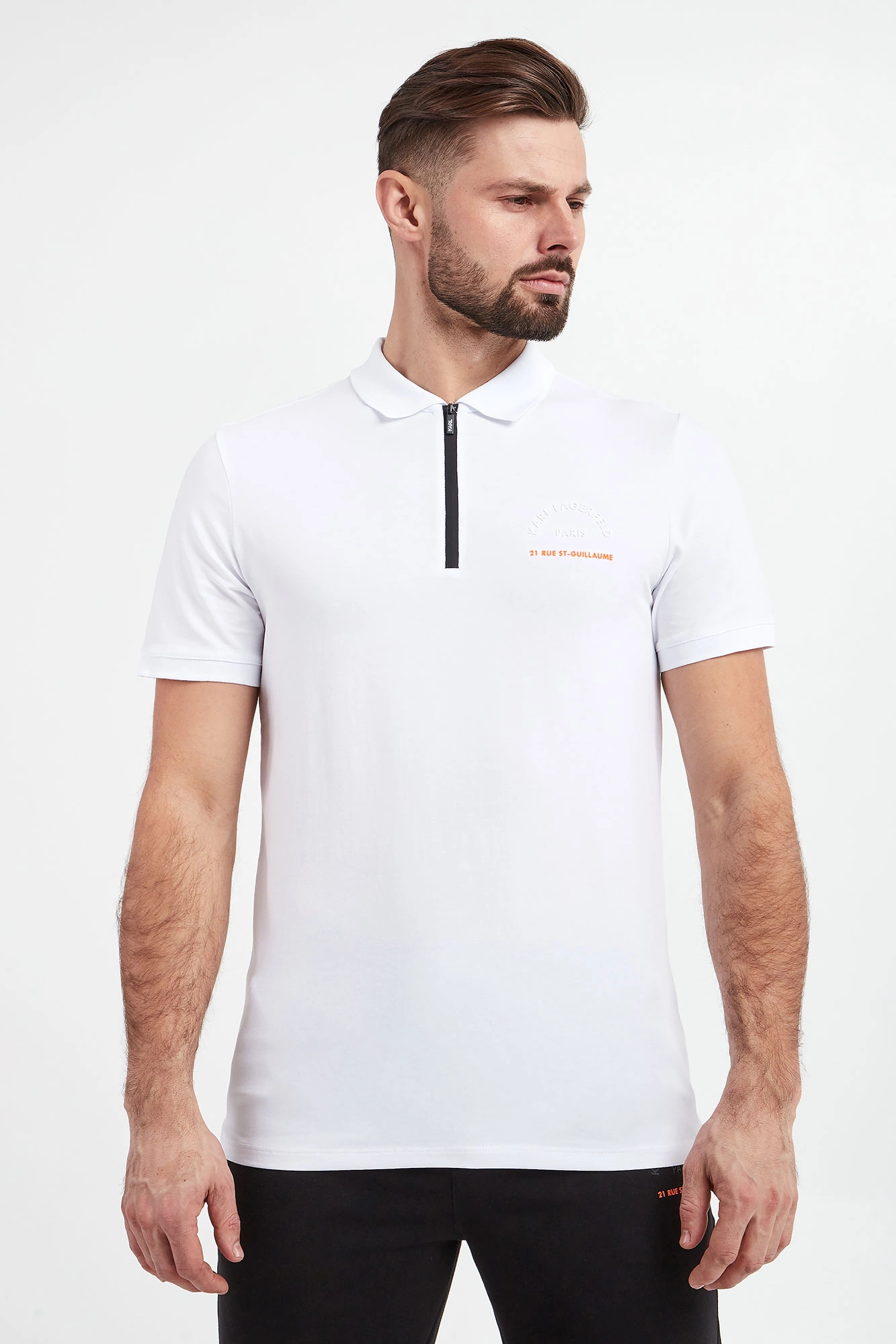 Polo marki Karl Lagerfeld w białym kolorze. Wykonane z bawełny domieszką elastycznych włókien. Model pochodzi z linii "Karl Cares", która wspiera zrównoważoną modę. Fason typu slim. Zapinane za pomocą zamka w czarnym kolorze. Na piersi gumowany nadruk w postaci nazwy marki w biało-pomarańczowym kolorze. Dekolt wykończony klasycznym kołnierzem. Na linii karku nadruk w postaci nazwy marki. Krótkie rękawy wykończone elastycznym ściągaczem.