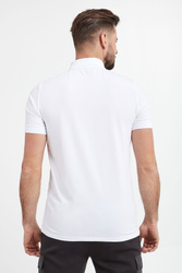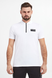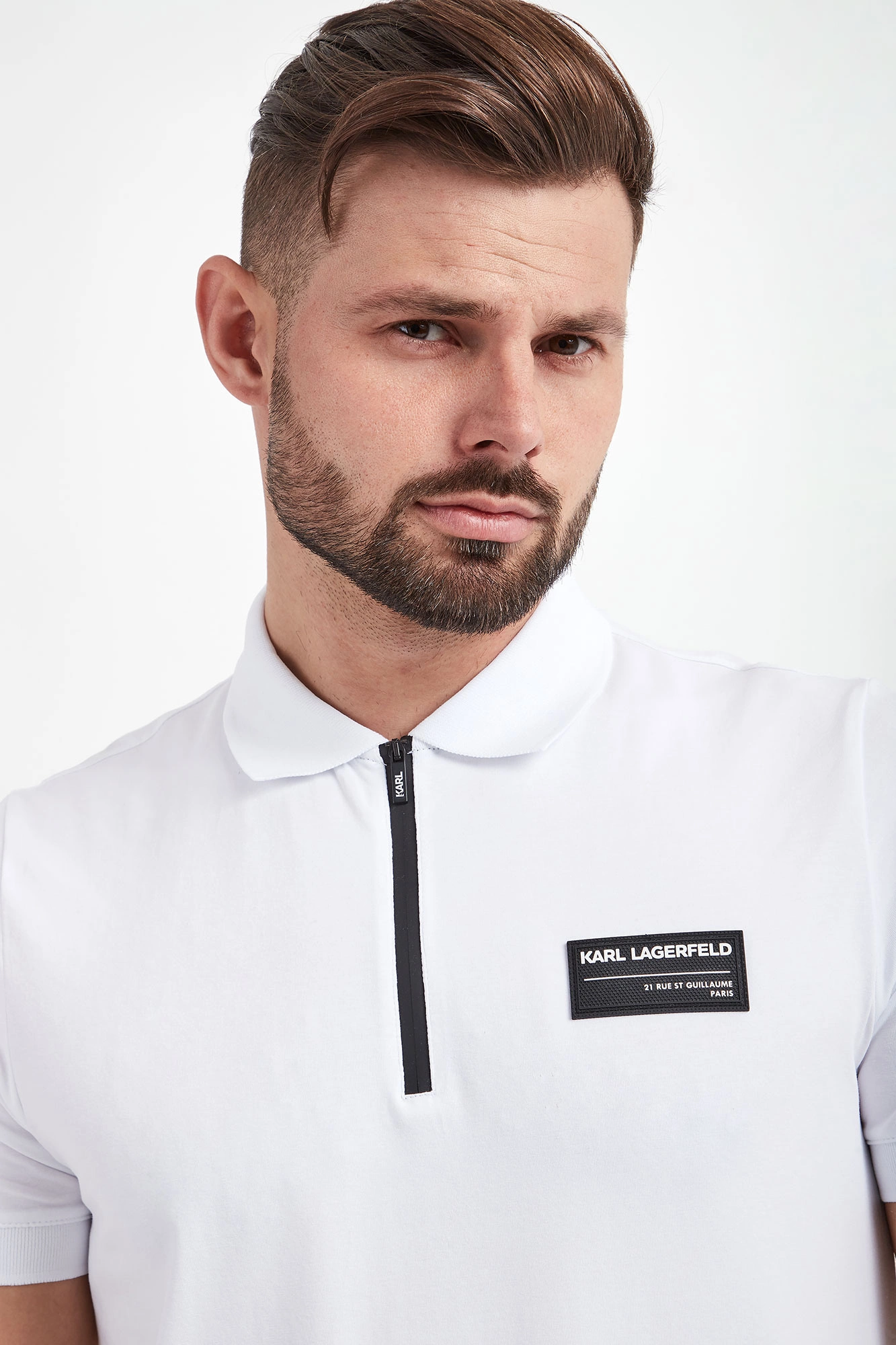 Polo marki Karl Lagerfeld w białym kolorze. Wykonane z bawełny domieszką elastycznych włókien. Fason typu slim. Zapinana za pomocą zamka w kontrastowym, czarnym kolorze. Na piersi gumowana naszywka z tłoczoną nazwą marki. Dekolt wykończony klasycznym kołnierzem. Krótkie rękawy wykończone elastycznym ściągaczem.