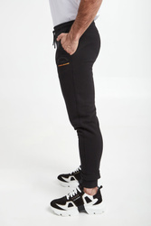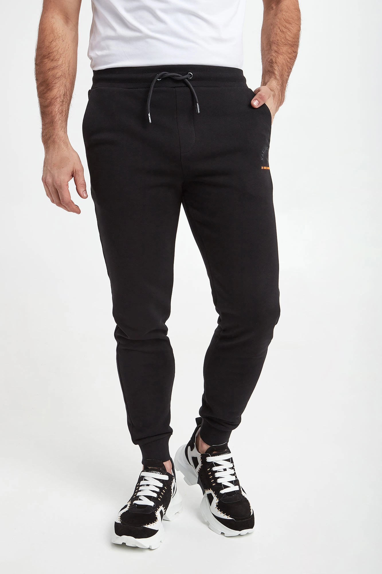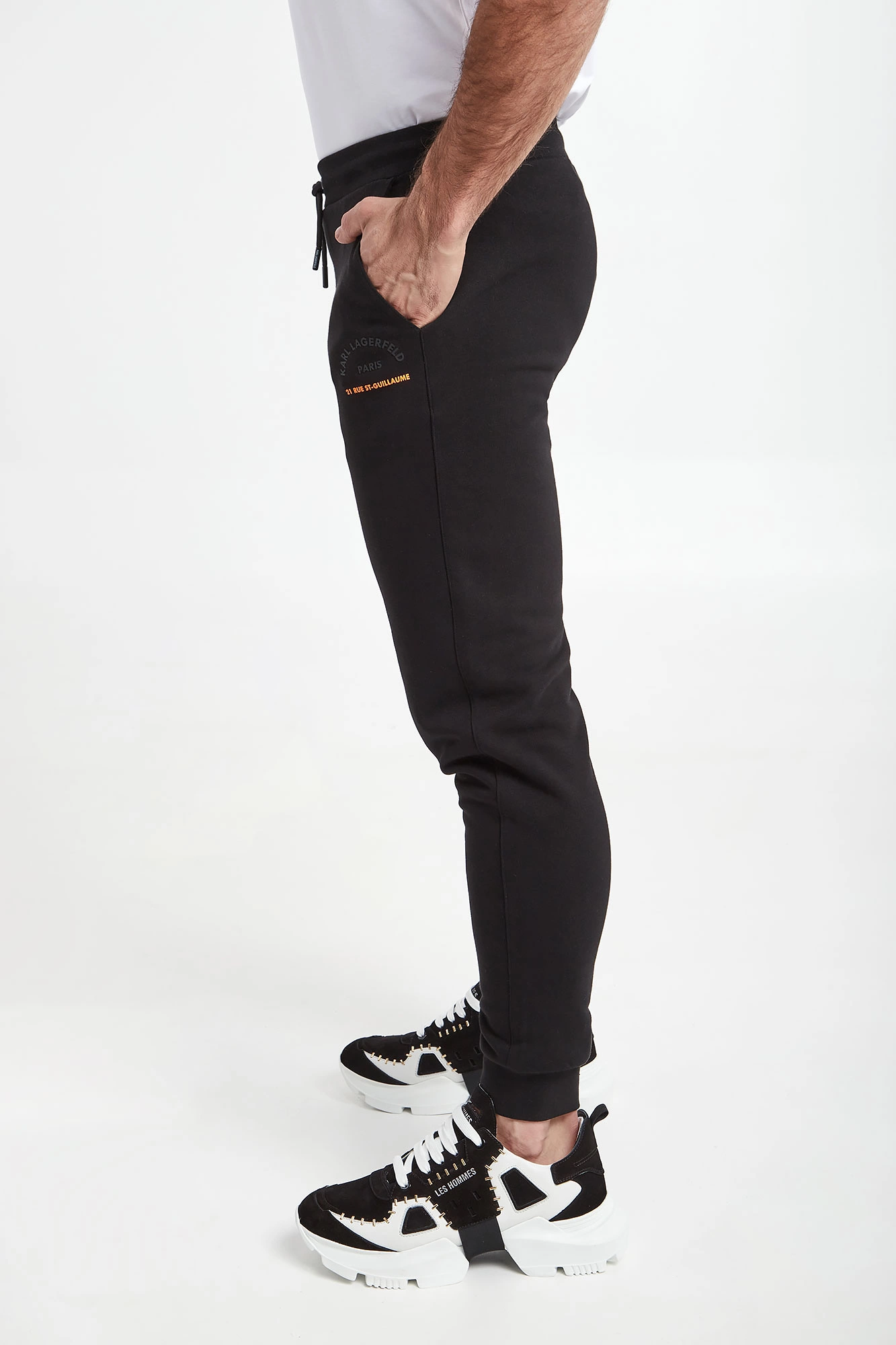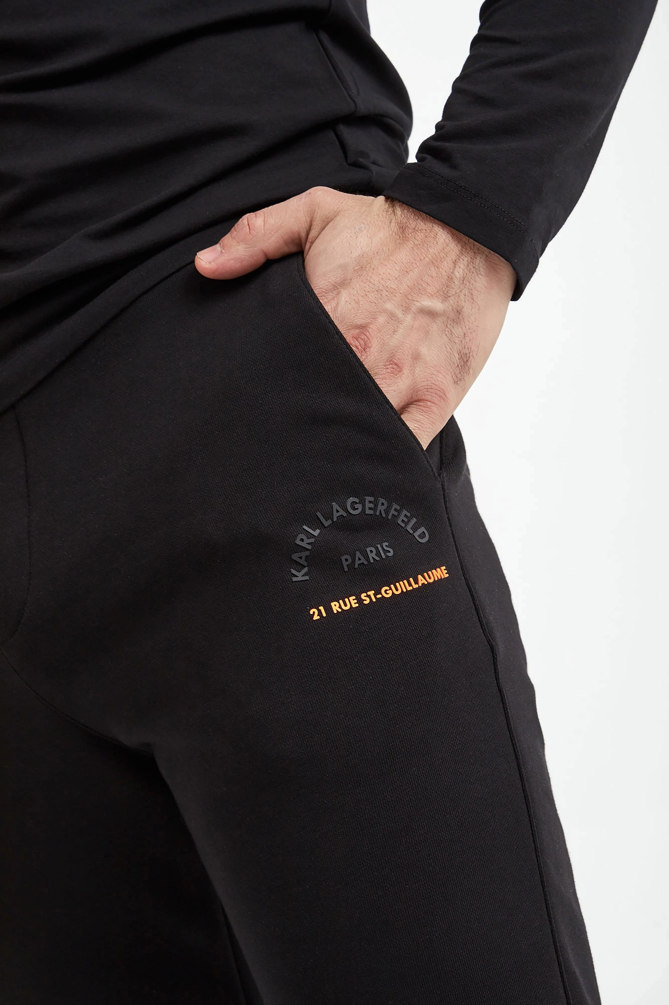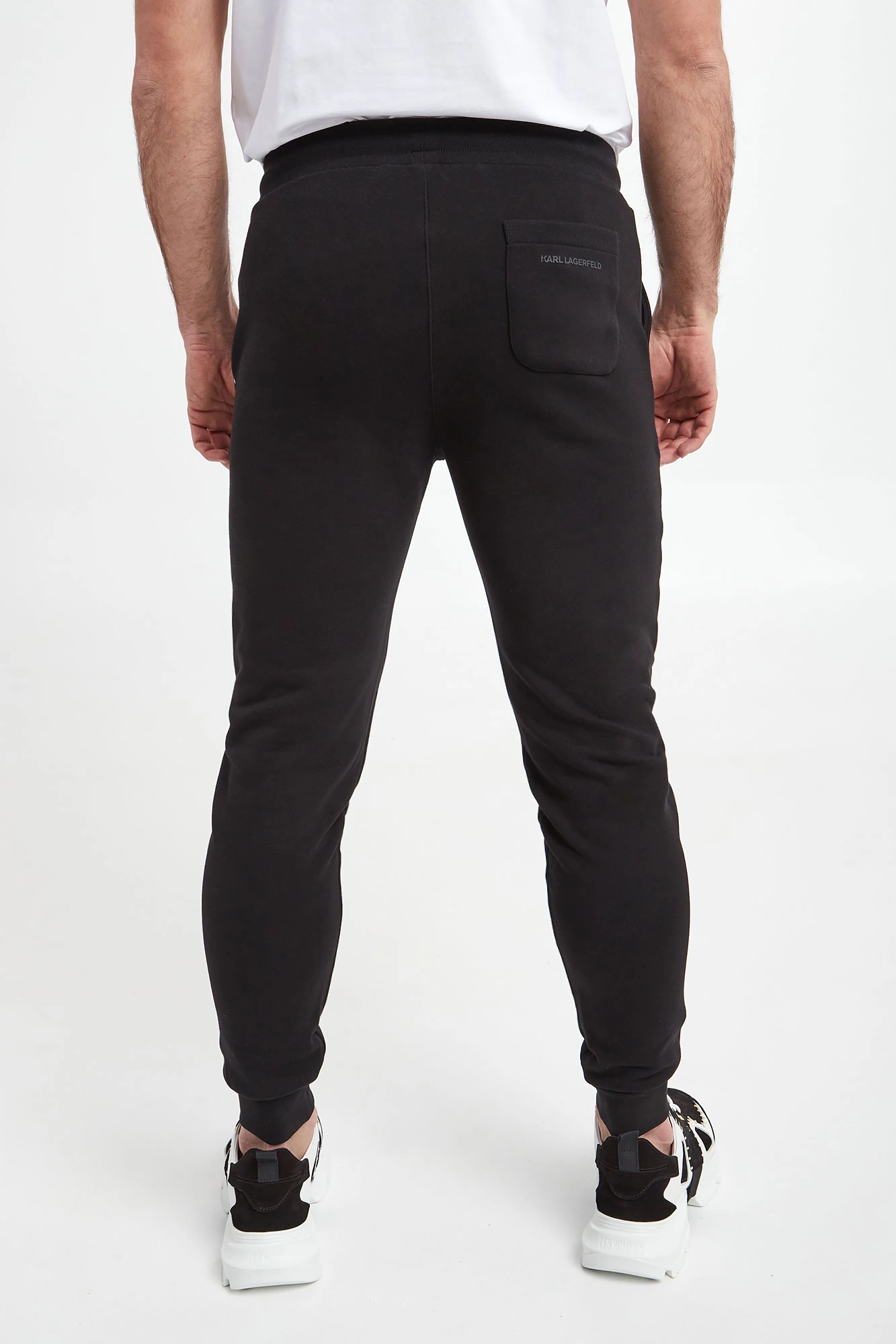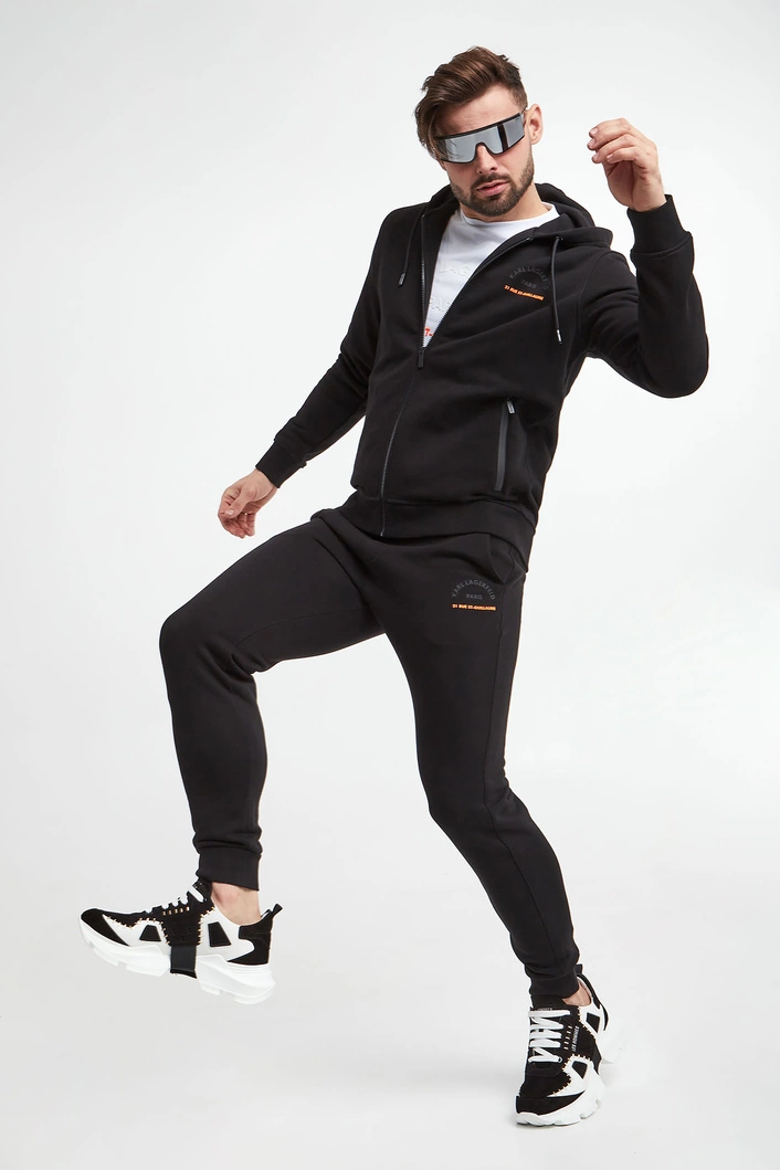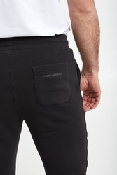Spodnie dresowe marki Karl Lagerfeld w czarnym kolorze. Model pochodzi z linii "Karl Cares", która wspiera zrównoważoną modę. Na lewej nogawce z przodu dwukolorowa gumowa aplikacja z nazwą marki. Fason z trzema kieszeniami. Dwie z przodu i jedna z tyłu. Z tyłu na kieszeni gumowy napis w postaci nazwy marki w białym kolorze. Fason typu jogger.