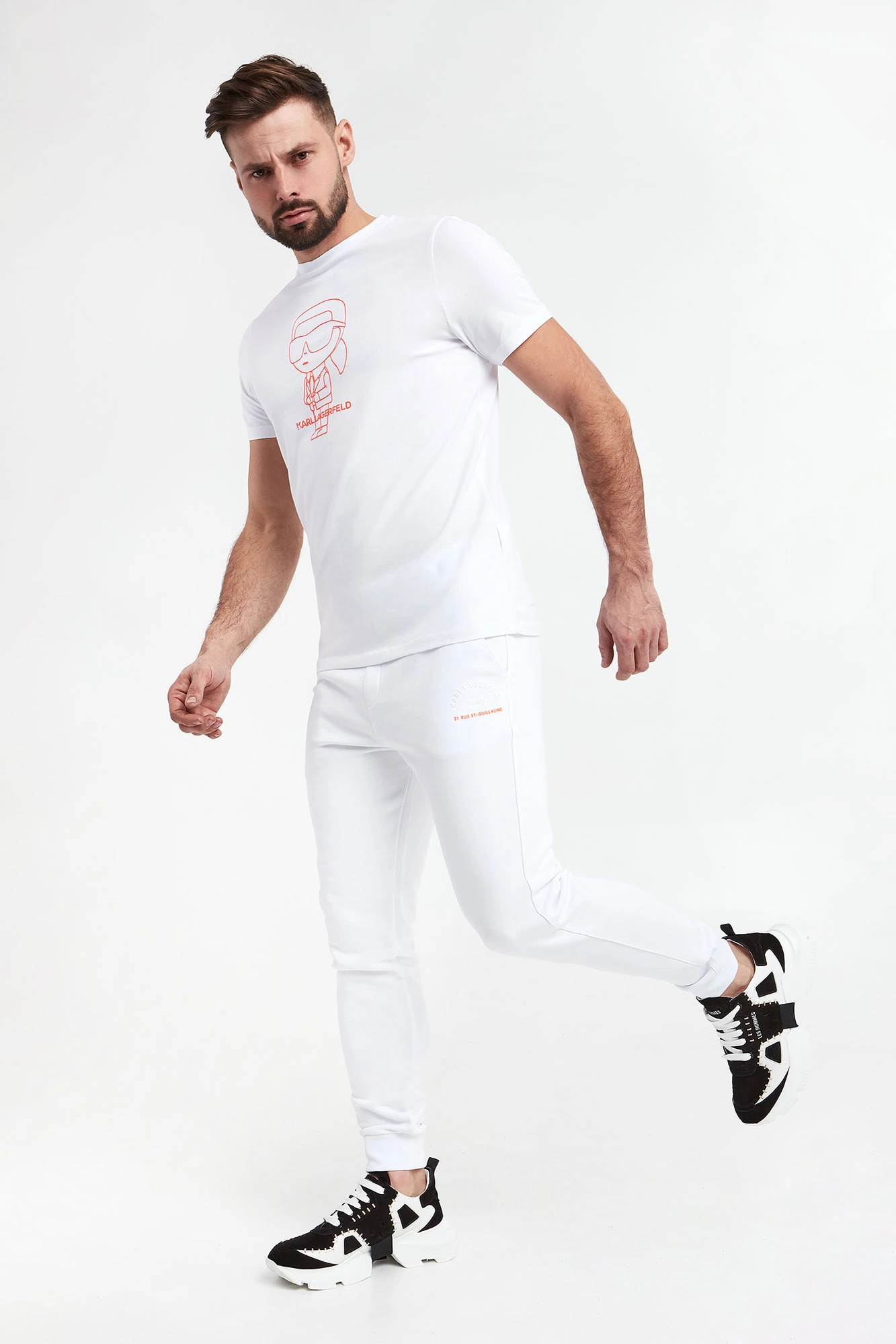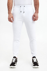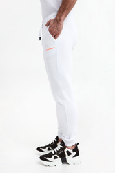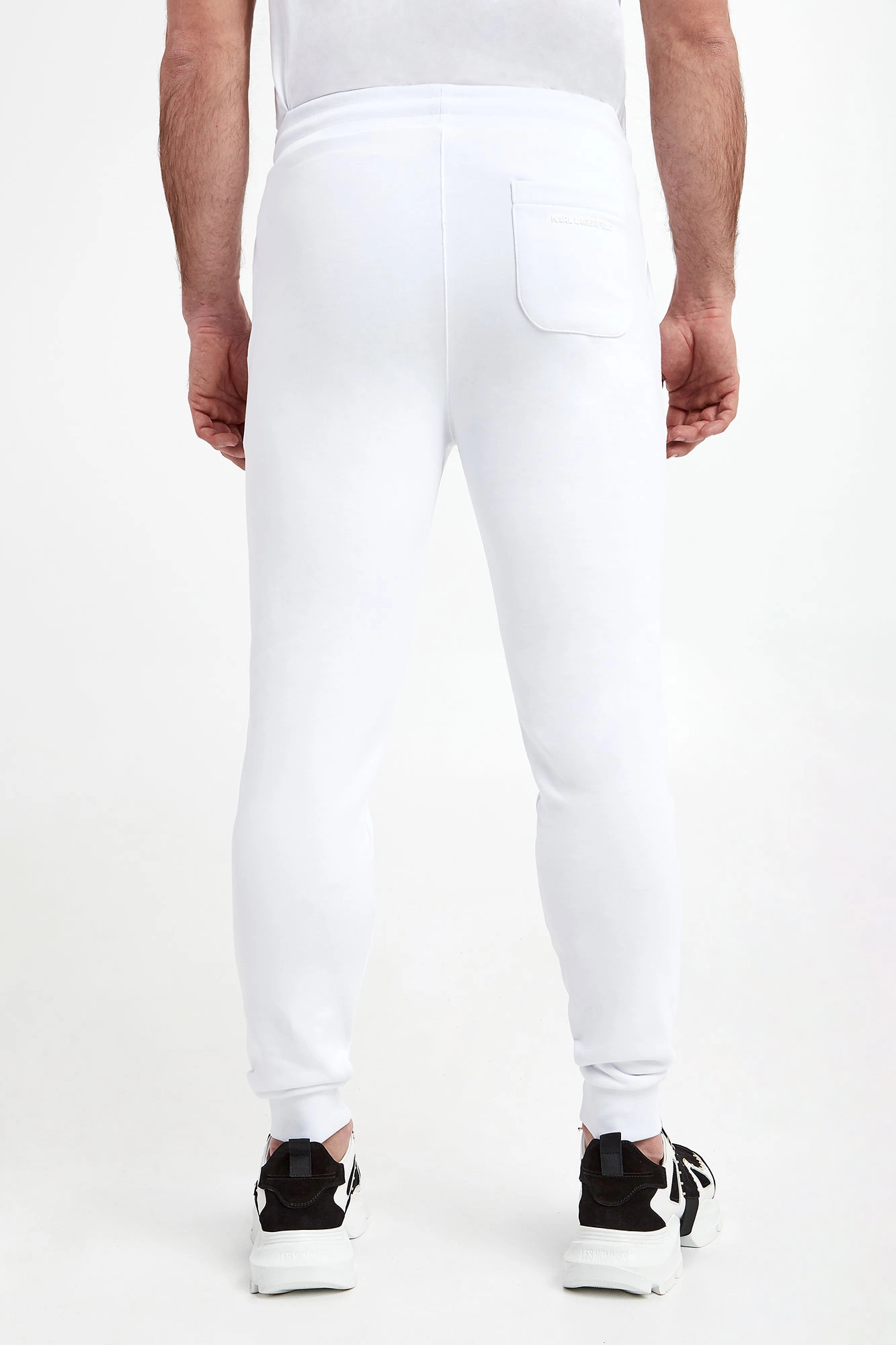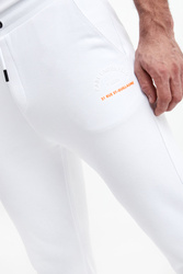 Spodnie dresowe marki Karl Lagerfeld w białym kolorze. Model pochodzi z linii "Karl Cares", która wspiera zrównoważoną modę. Na lewej nogawce z przodu dwukolorowa gumowa aplikacja z nazwą marki. Fason z trzema kieszeniami. Dwie z przodu i jedna z tyłu. Z tyłu na kieszeni gumowy napis w postaci nazwy marki w białym kolorze. Fason typu jogger.