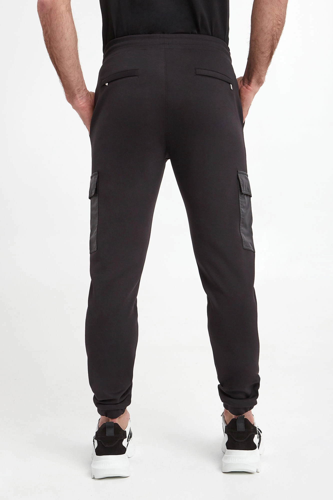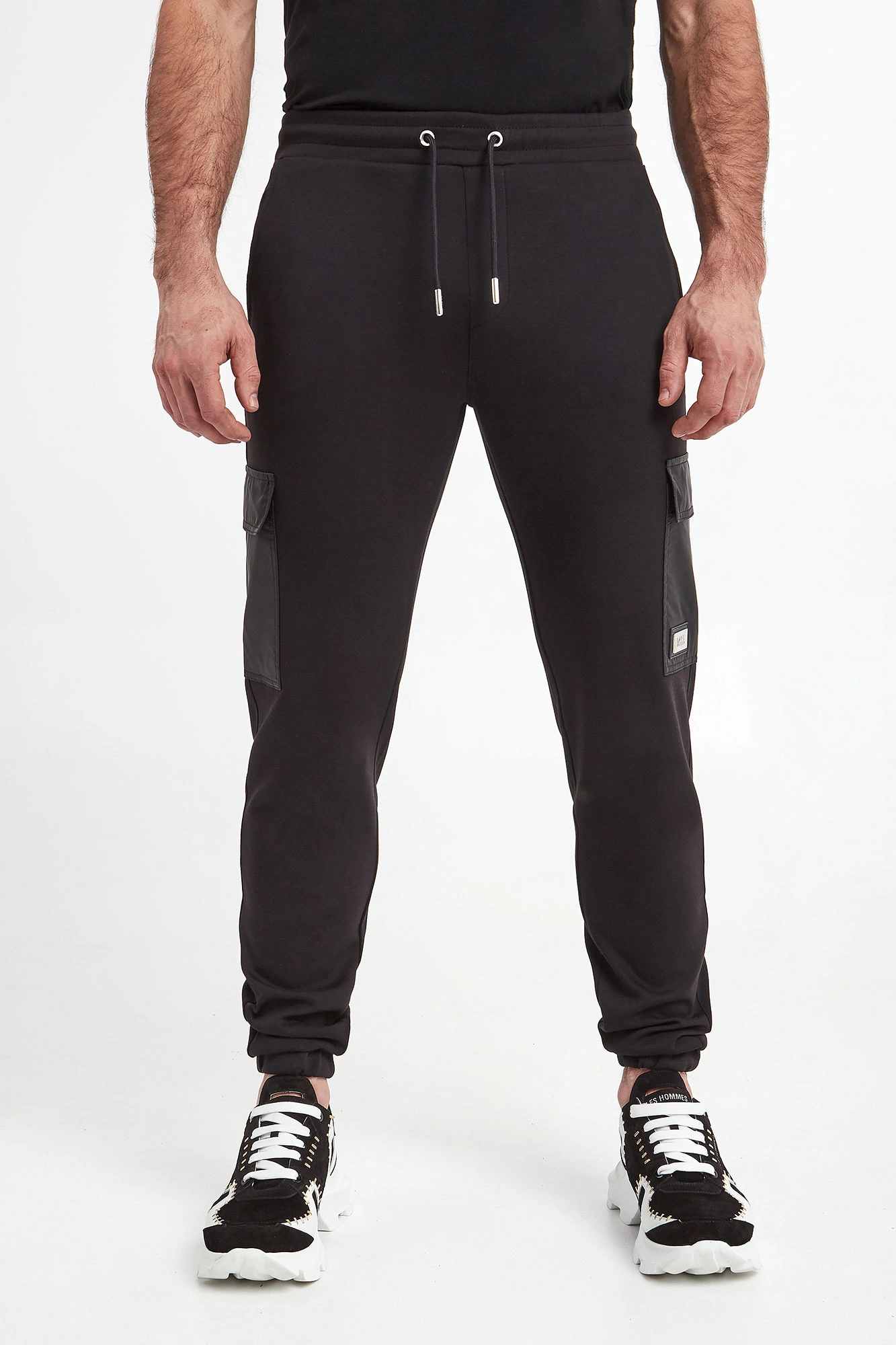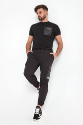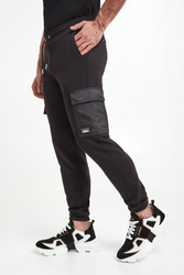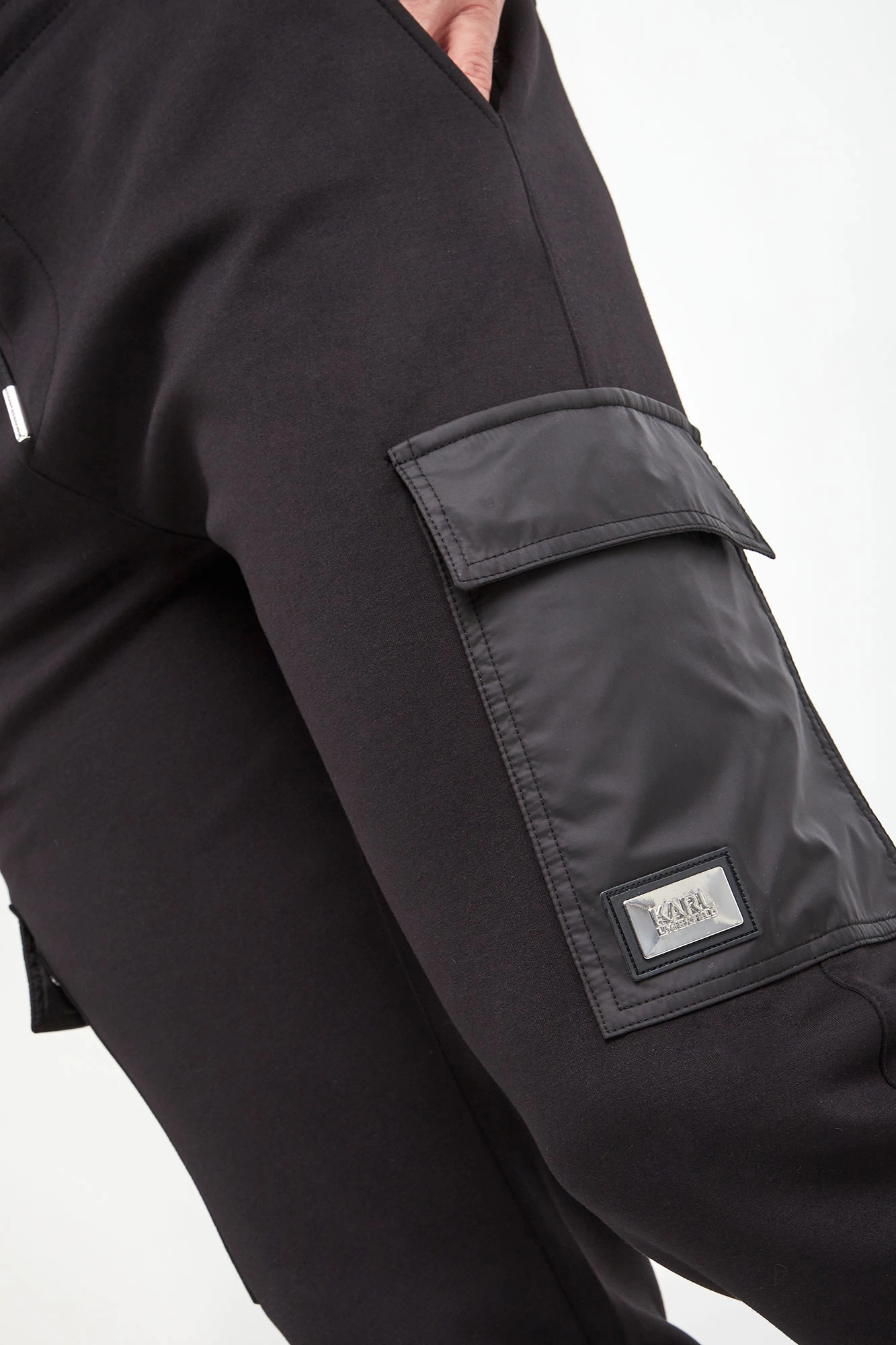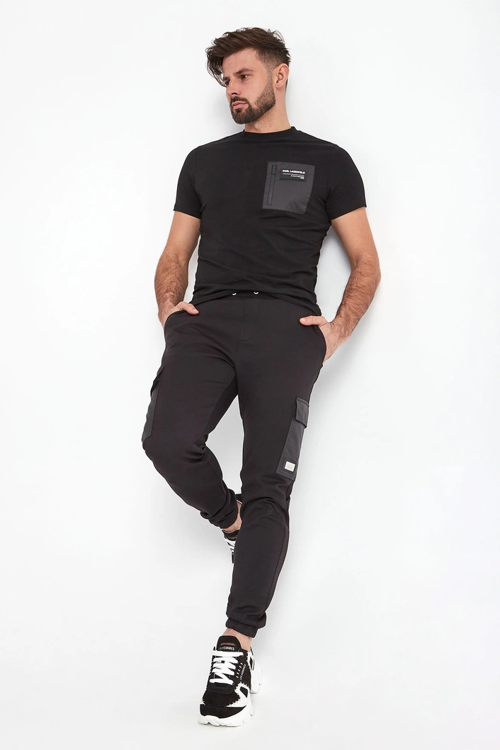 Spodnie marki Karl Lagerfeld w kolorze czarnym. Model z linii "Karl Cares", która wspiera zrównoważoną modę. W pasie szeroki ściągacz z sygnowanymi troczkami do regulacji. Model z sześcioma kieszeniami. Dwie nylonowe naszywane na nogawkach z patkami. Na jednej z nich naszywana metalowa aplikacja z nazwą marki. Dwie kieszenie wpuszczane z przodu, a z tyłu zapinane na zamek. Nogawki zakończone wąskim ścigaczem. Fason typu regular.