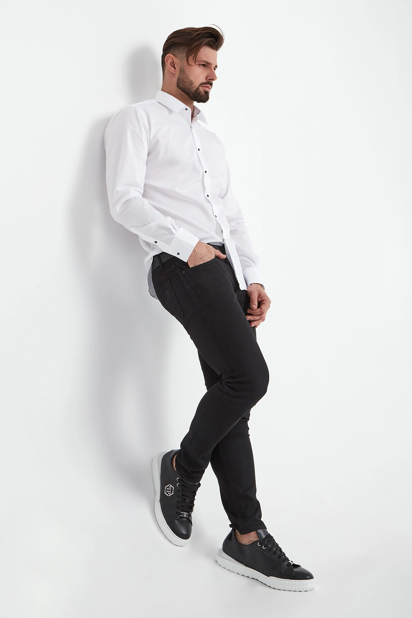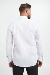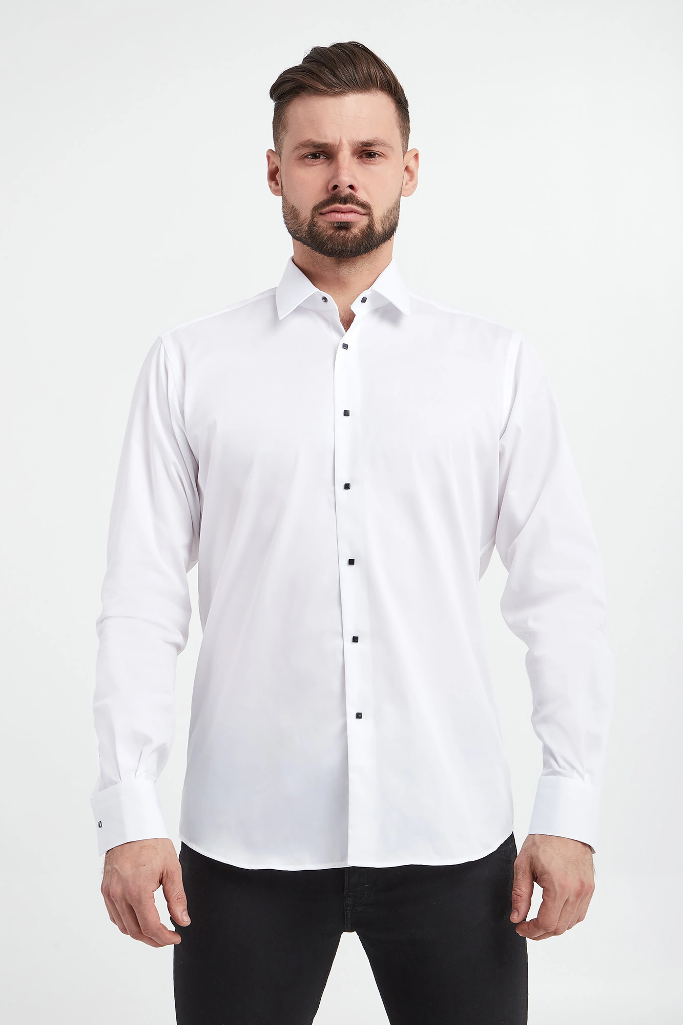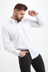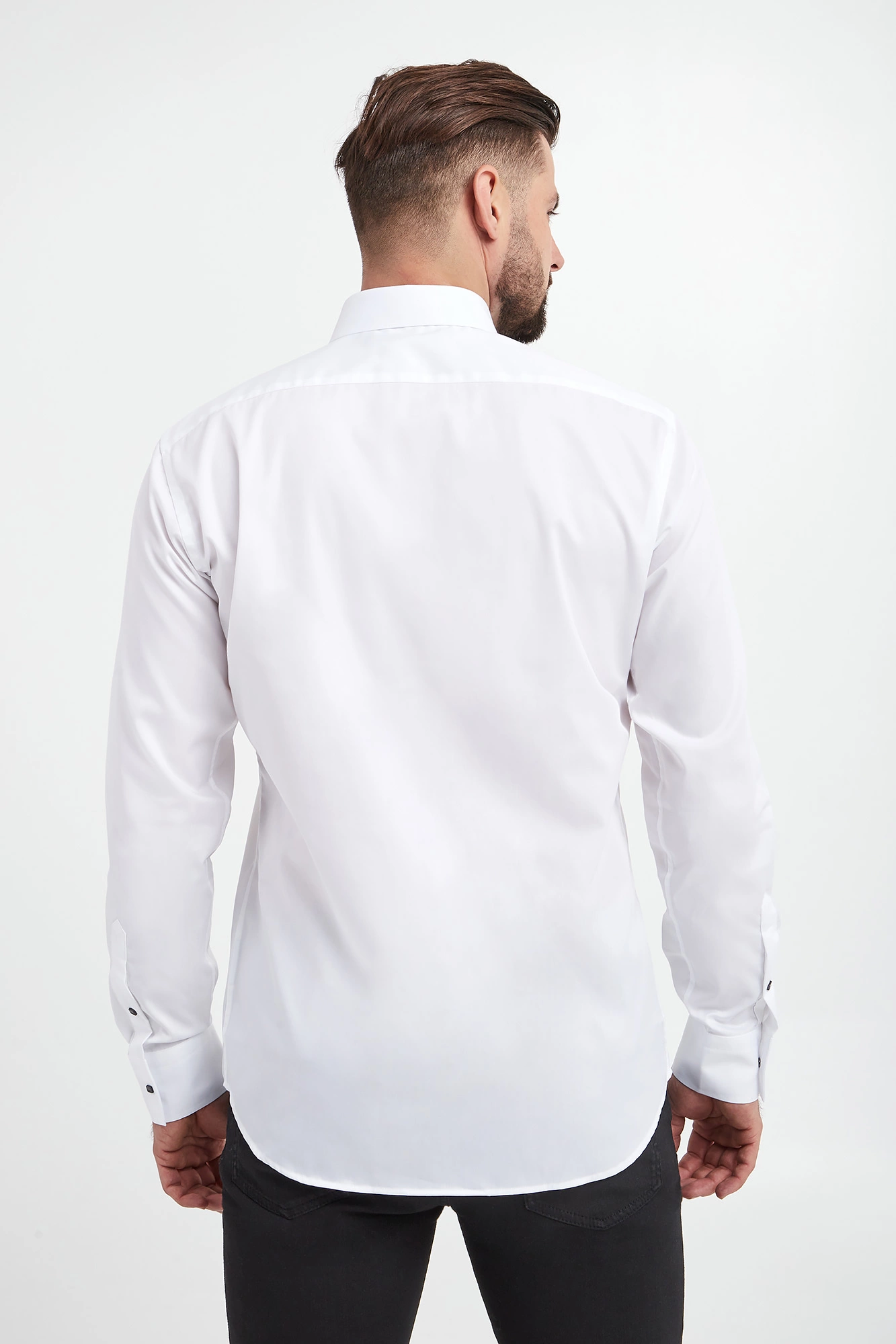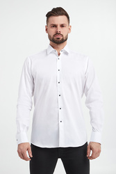 Koszula popelinowa marki Karl Lagerfeld w białym kolorze. Wykonana ze stuprocentowej bawełny. Autorski fason modern fit, który charakteryzuje się dopasowanym krojem. Zapinana za pomocą sygnowanych nap w srebrnym kolorze. Dekolt wykończony klasycznym kołnierzem. Długie rękawy wykończone mankietami, zapinanym za pomocą nap.