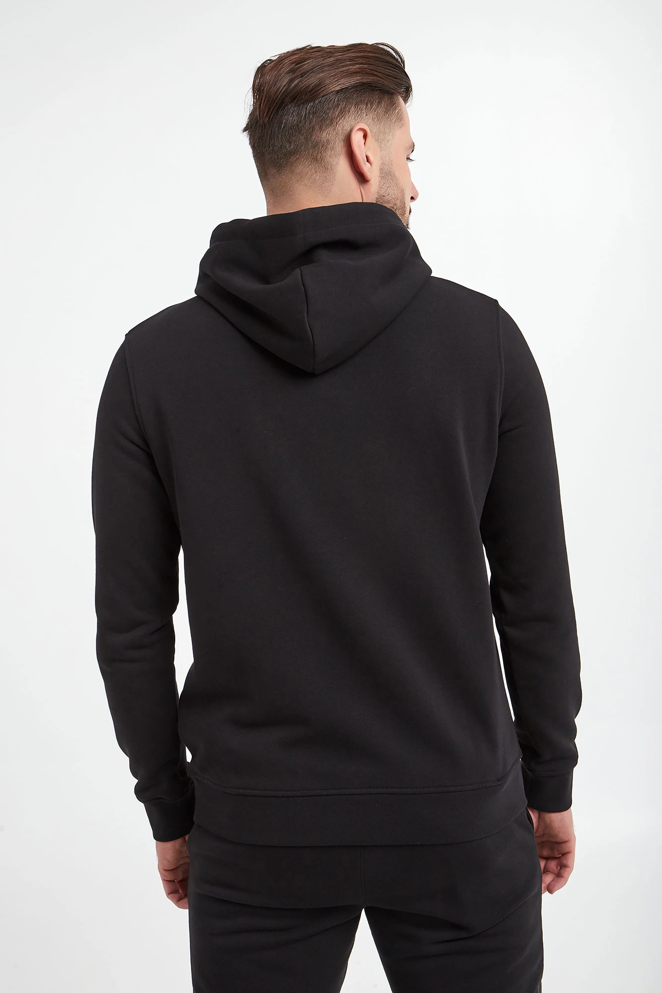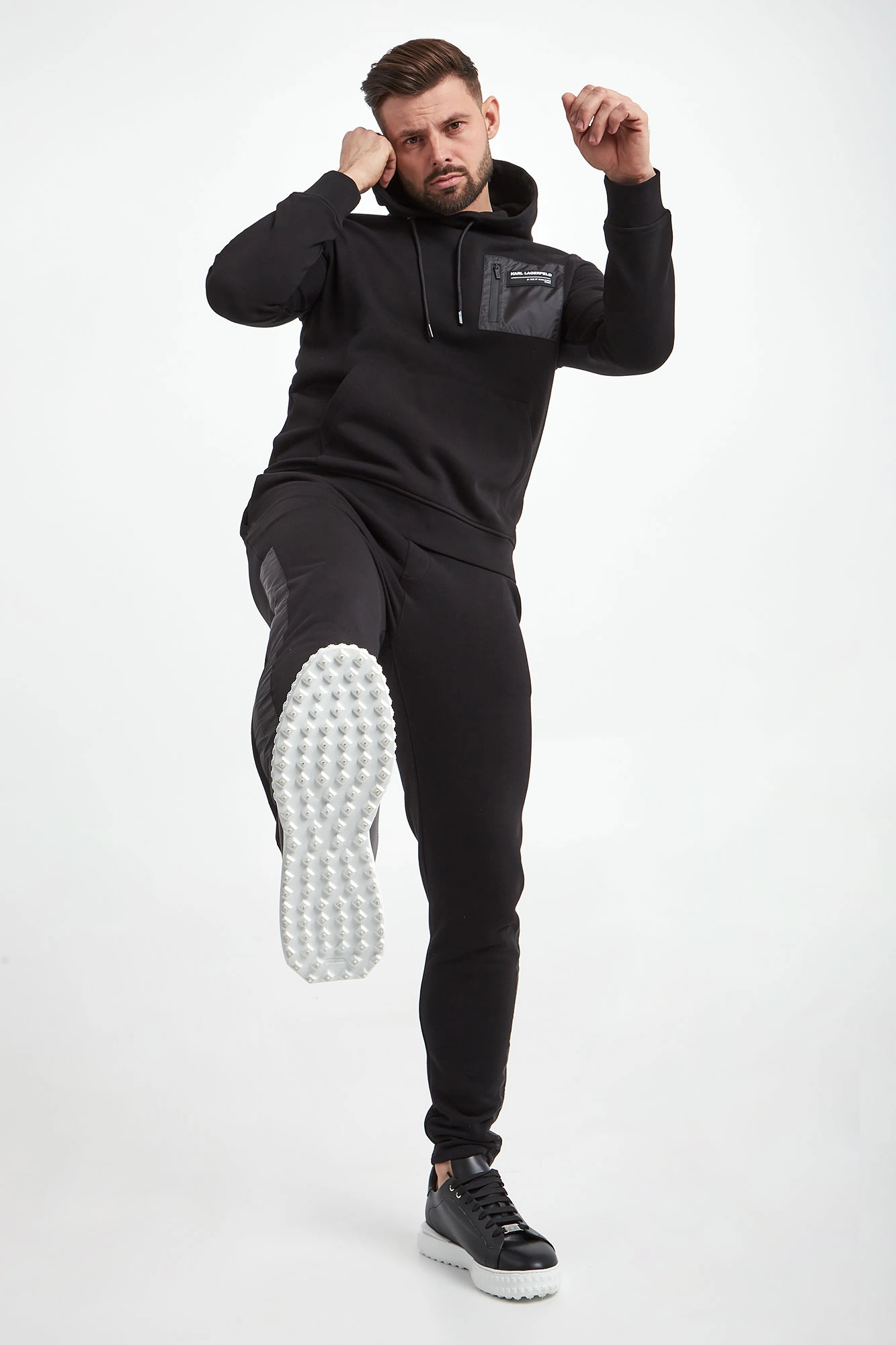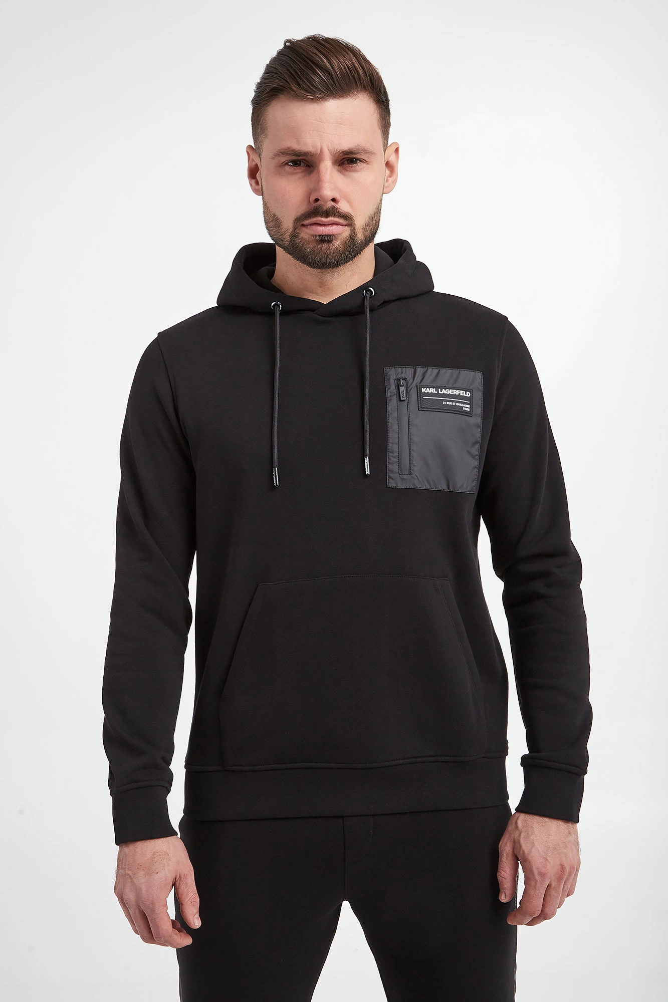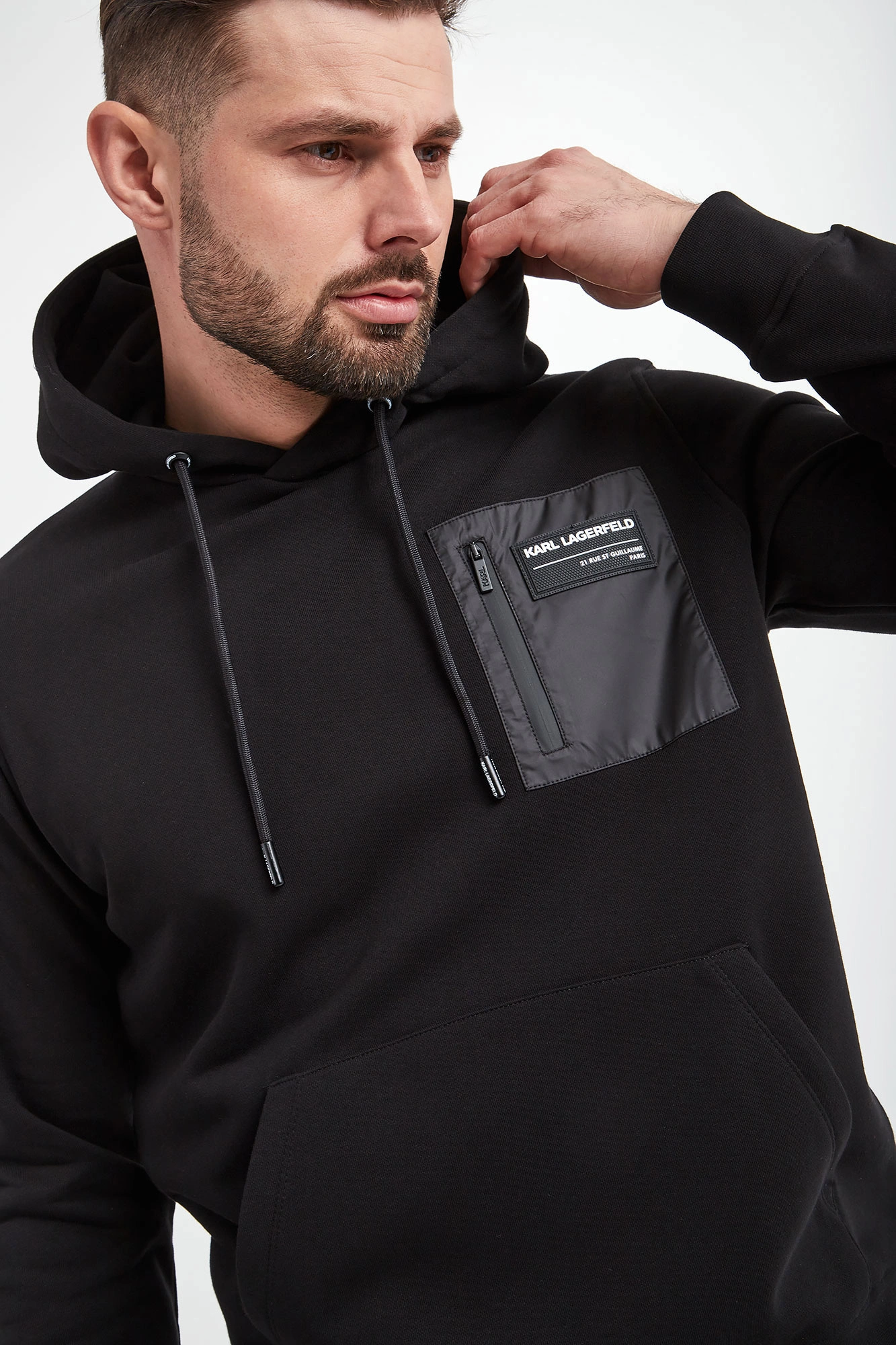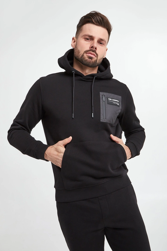 Bluza z kapturem marki Karl Lagerfeld w czarnym kolorze. Wykonana z przyjemnej w dotyku, bawełnianej tkaniny. Model pochodzi z linii "Karl Cares", która wspiera zrównoważoną modę. Kaptur regulowany za pomocą troczków. Na piersi nylonowa kieszeń zamykana na zamek. Na kieszeni gumowa aplikacja z nazwą marki. Z przodu duża kieszeń typu kangurek. Długie rękawy i dół wykończone elastycznym ściągaczem. Fason typu regular.