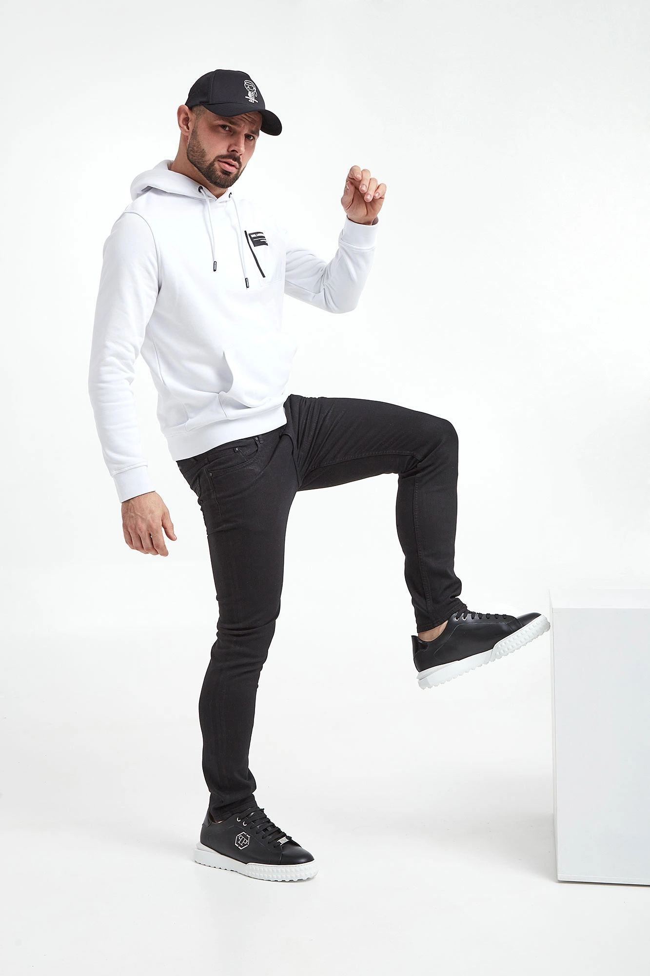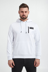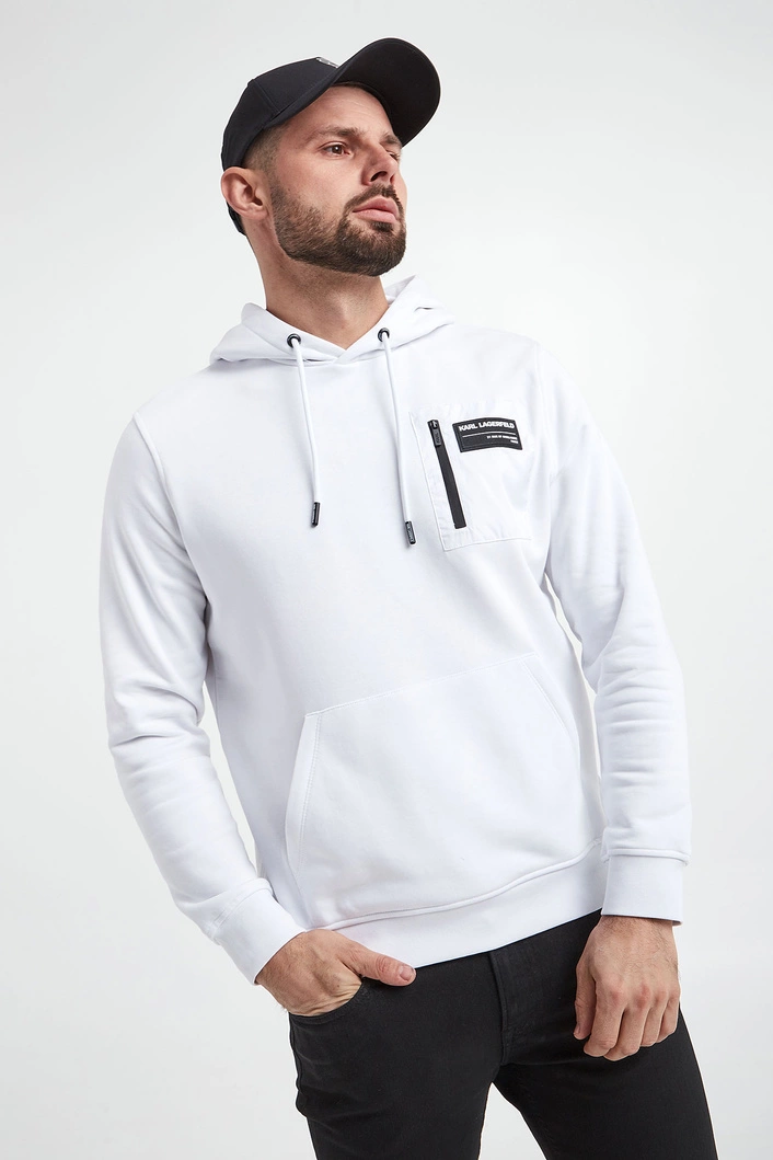 Bluza z kapturem marki Karl Lagerfeld w białym kolorze. Wykonana z przyjemnej w dotyku, bawełnianej tkaniny. Model pochodzi z linii "Karl Cares", która wspiera zrównoważoną modę. Kaptur regulowany za pomocą troczków. Na piersi nylonowa kieszeń zamykana na kontrastowy czarny zamek. Na kieszeni gumowa aplikacja z nazwą marki. Z przodu duża kieszeń typu kangurek. Długie rękawy i dół wykończone elastycznym ściągaczem. Fason typu regular.