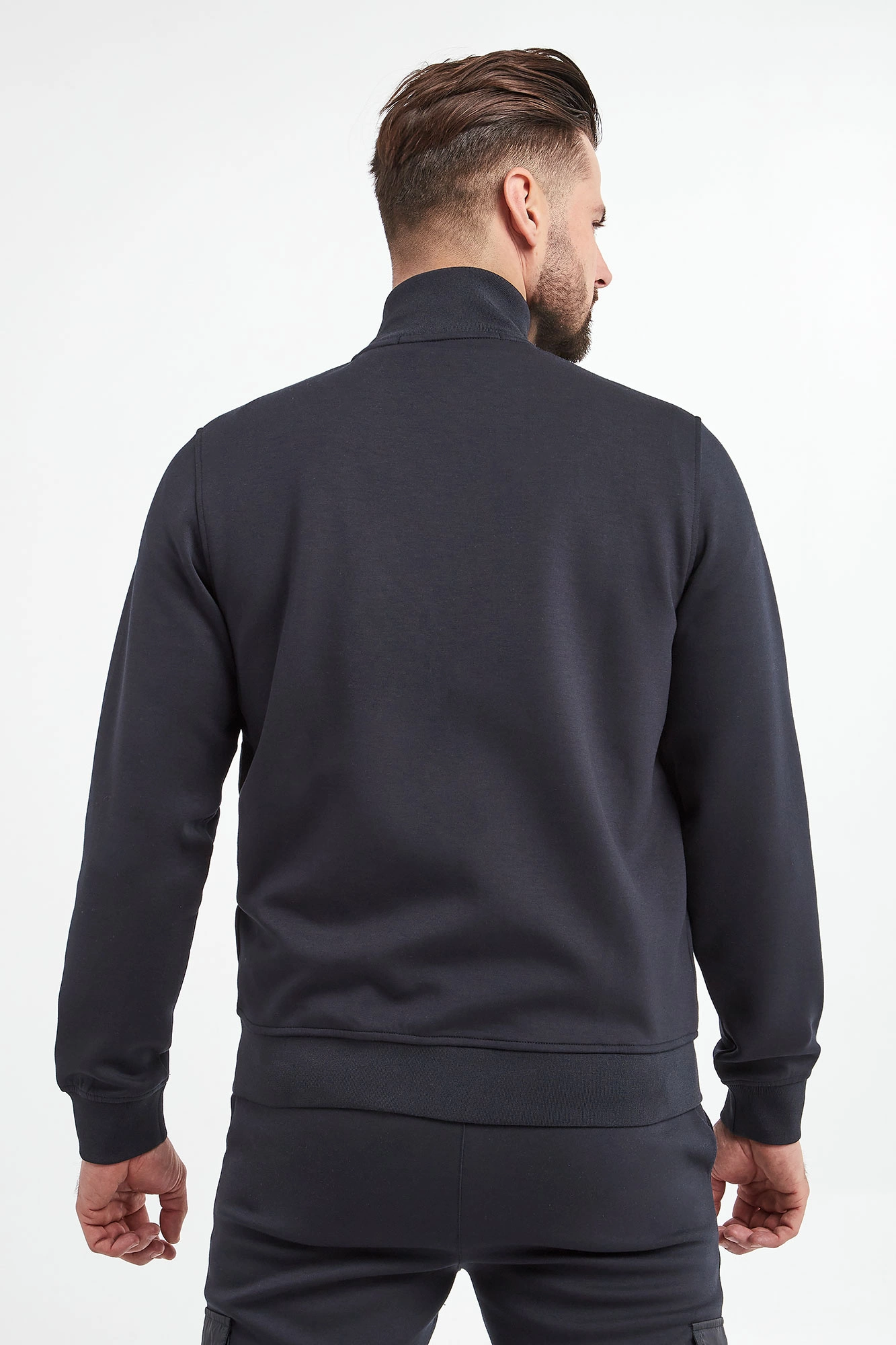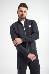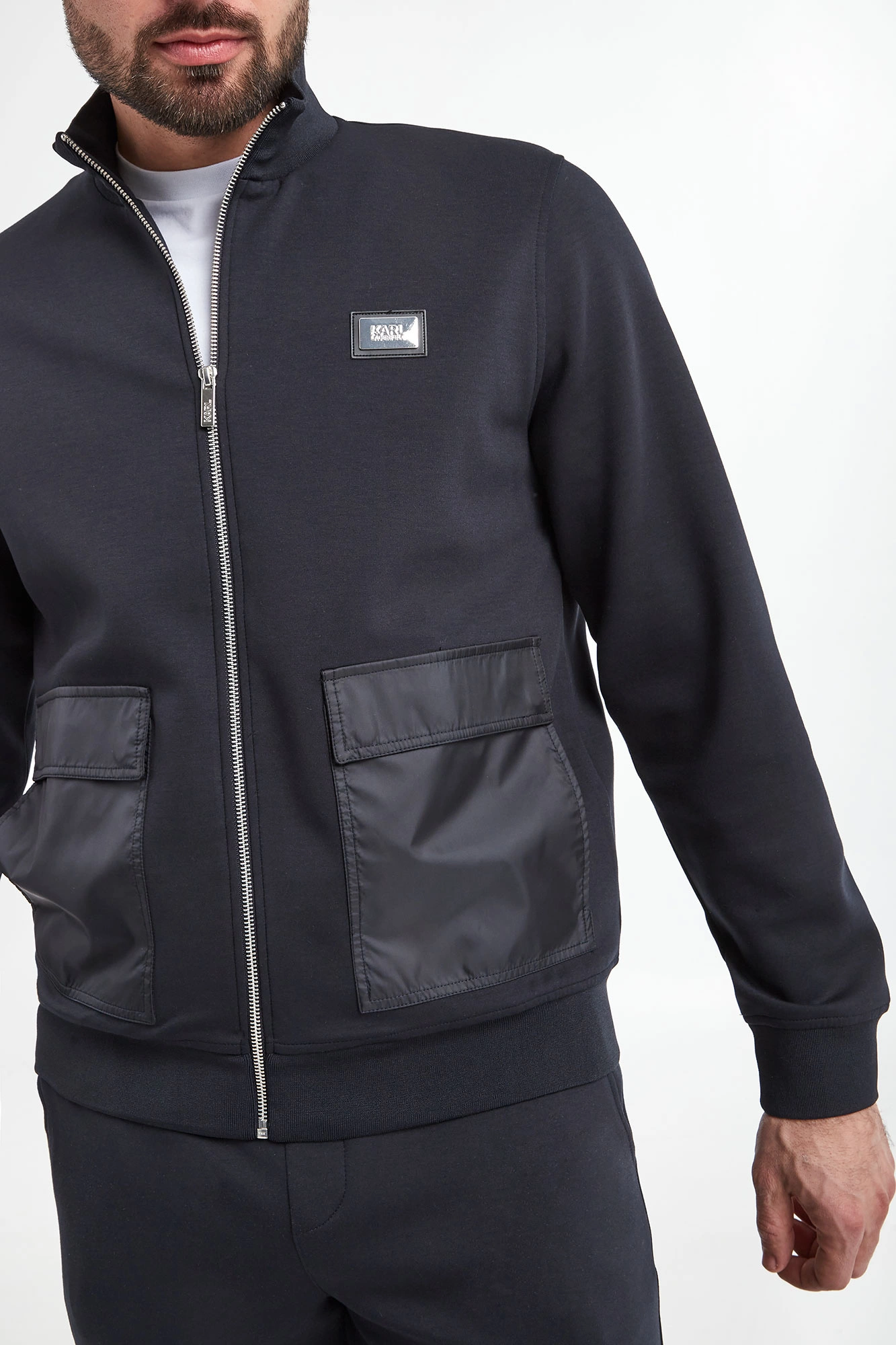 Bluza marki Karl Lagerfeld w kolorze granatowym. Wykonana z gładkiego i przyjemnego w dotyku materiału. Ze stójką. Na piersi skórzana naszywka z metalową logowaną aplikacją. Z przodu dwie nylonowe kieszenie z patkami, zamykane na zatrzaski. Model zapinany za pomocą zamka w srebrnym kolorze. Całość wykończona elastycznym ściągaczem. Fason typu regular.