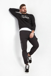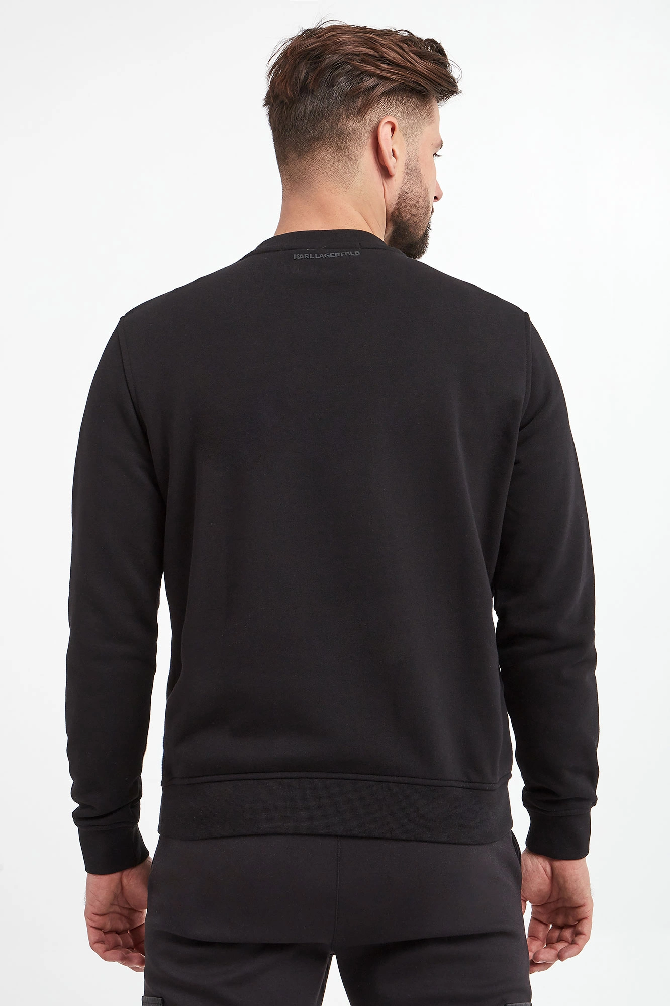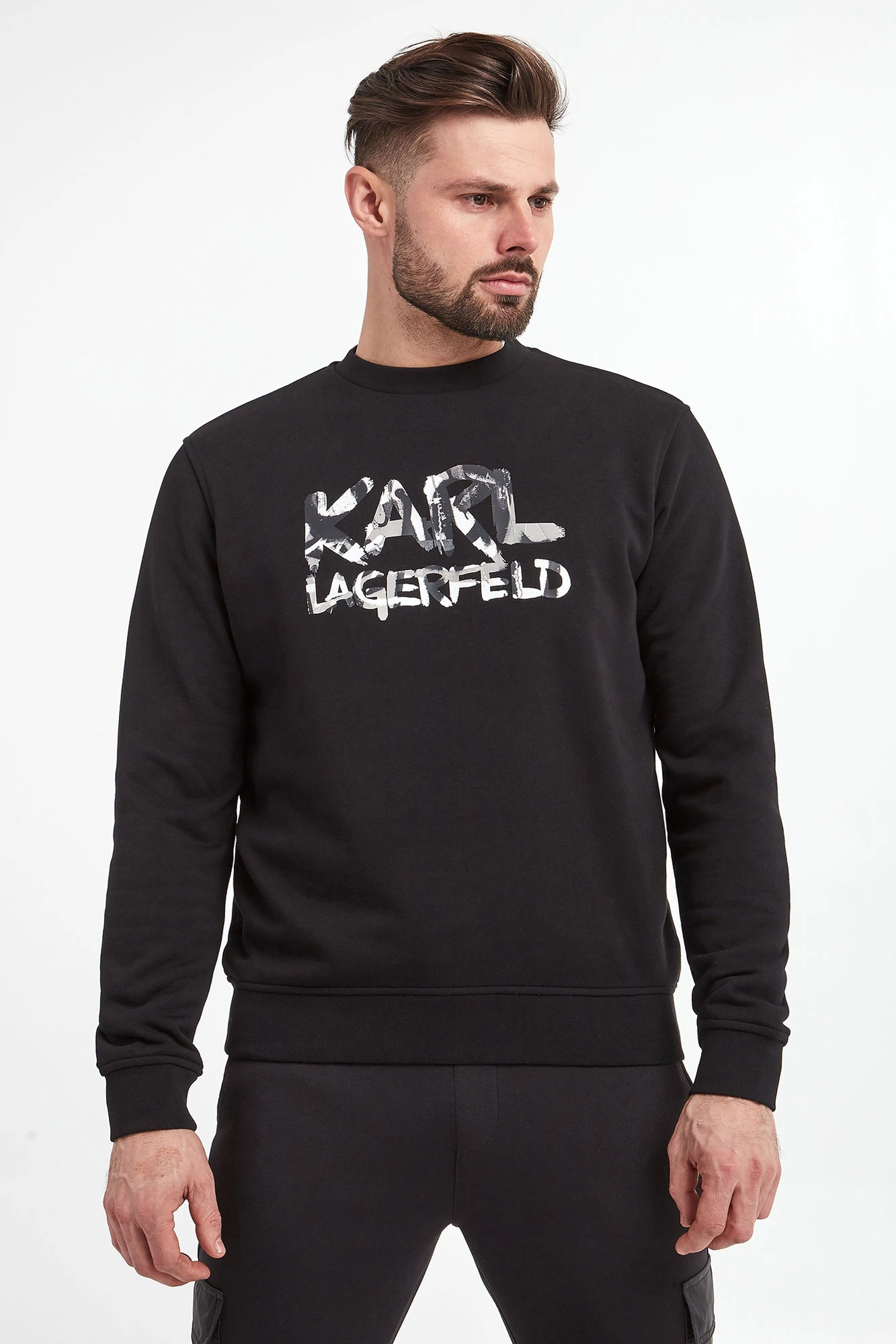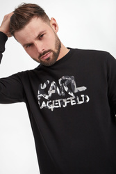 Bluza marki Karl Lagerfeld w czarnym kolorze. Wykonana z miękkiego, bawełnianego materiału z elastycznymi włóknami. Model pochodzi z linii "Karl Cares", która wspiera zrównoważoną modę. Dekolt typu o-neck. Z przodu biało-szary nadruk z nazwą marki. Na linii karku gumowany nadruk w postaci nazwy marki. Całość wykończona elastycznym ściągaczem. Fason typu regular.