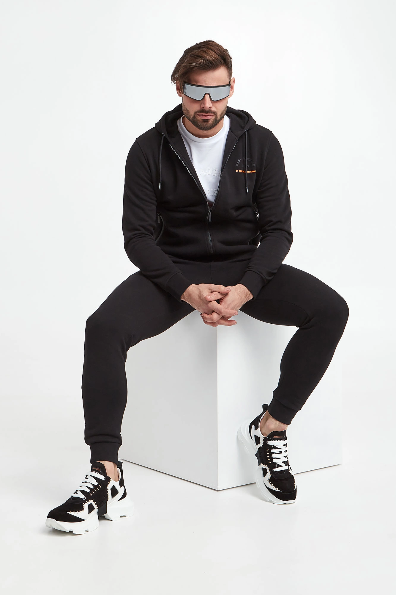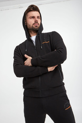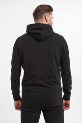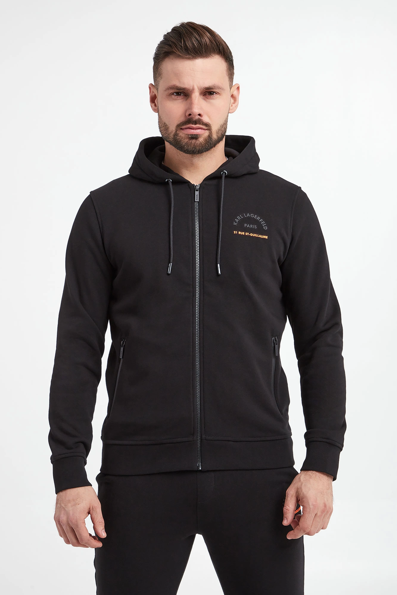 Bluza marki Karl Lagerfeld w kolorze czarnym. Wykonana z mięsistej, bawełnianej tkaniny. Model pochodzi z linii "Karl Cares", która wspiera zrównoważoną modę. Z kapturem regulowanym troczkami. Zapinana na zamek. Z przodu aplikacja w postaci nazwy marki. Dwie boczne kieszenie zapinane na zamek. Dół i rękawy zakończone ściągaczem. Fason regular.