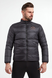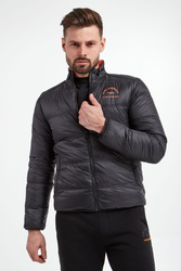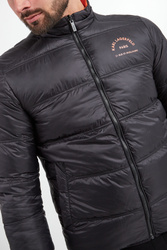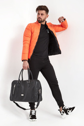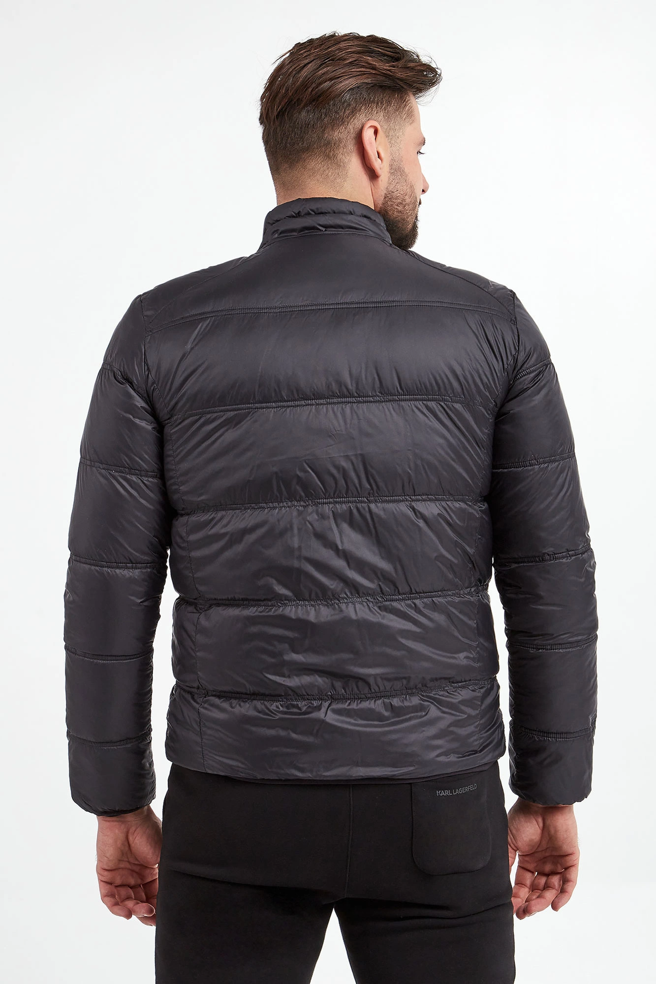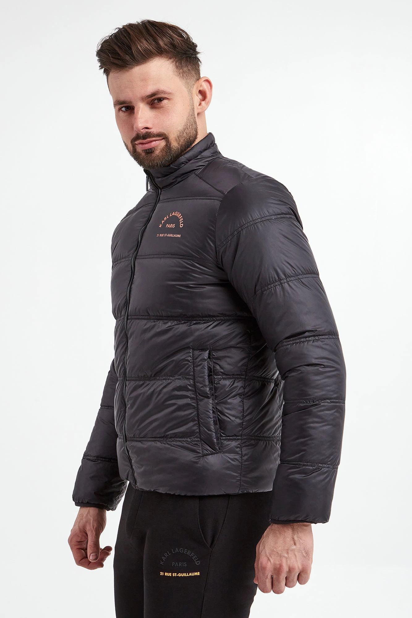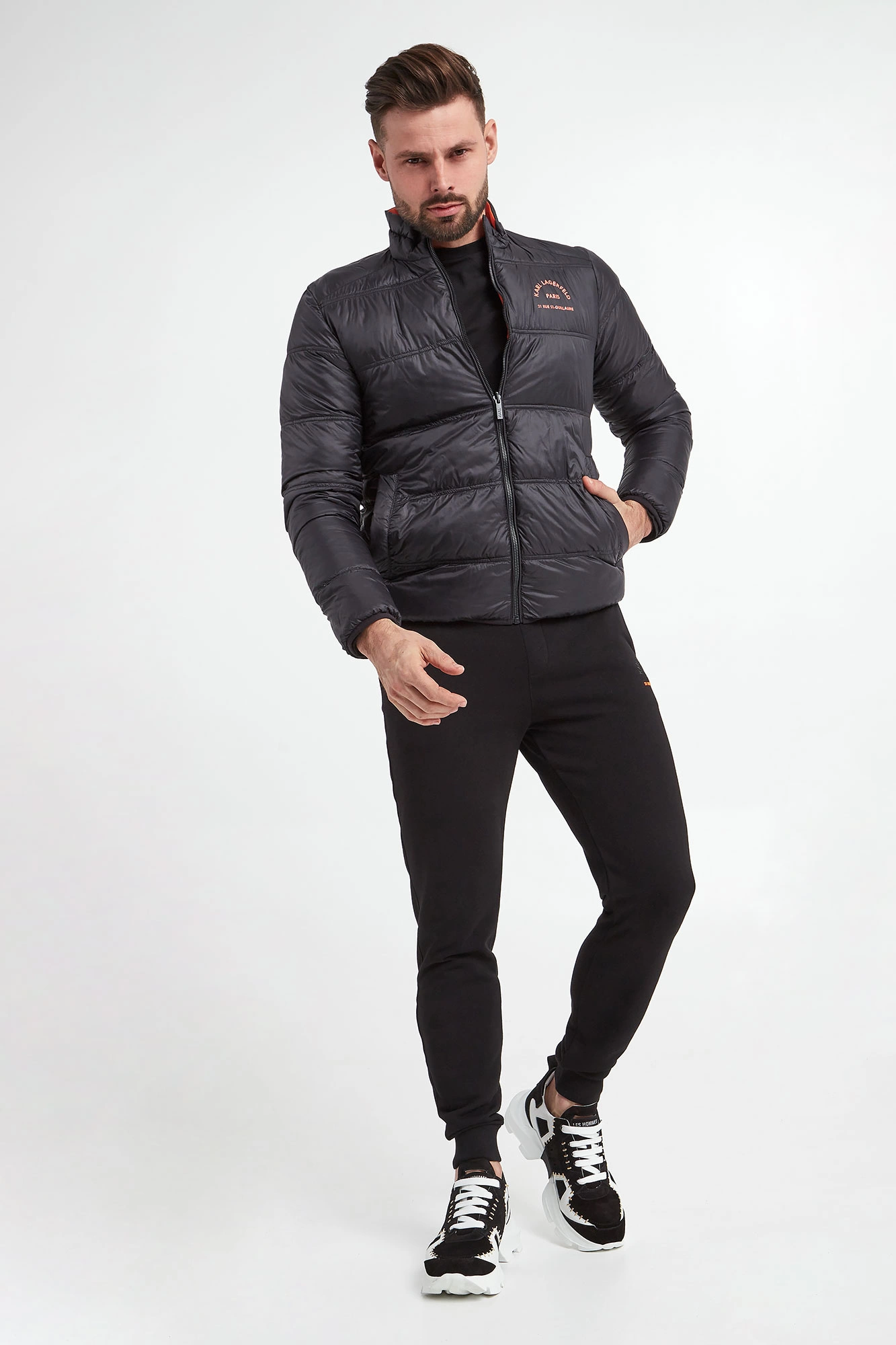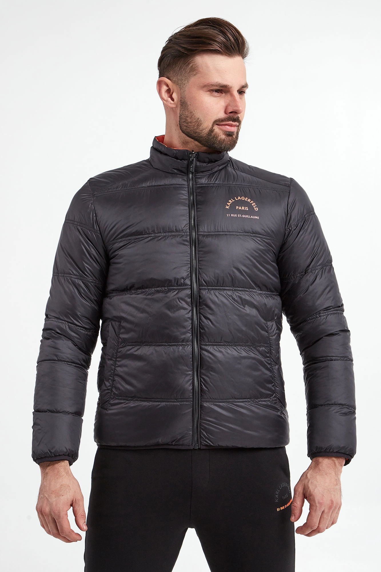 Kurtka puchowa marki Karl Lagerfeld. Dwustronna. Jedna strona czarna, druga pomarańczowa. Na całości poziome pikowania. Syntetyczne wypełnienie. Ze stójką. Na piersi kontrastowy napis z nazwą marki. Model z dwiema zapinanymi na zatrzask kieszeniami na każdej stronie. Zapinana za pomocą dwustronnego zamka z logowanym suwakiem. Rękawy i dół wykończone lamówką. Fason typu slim.