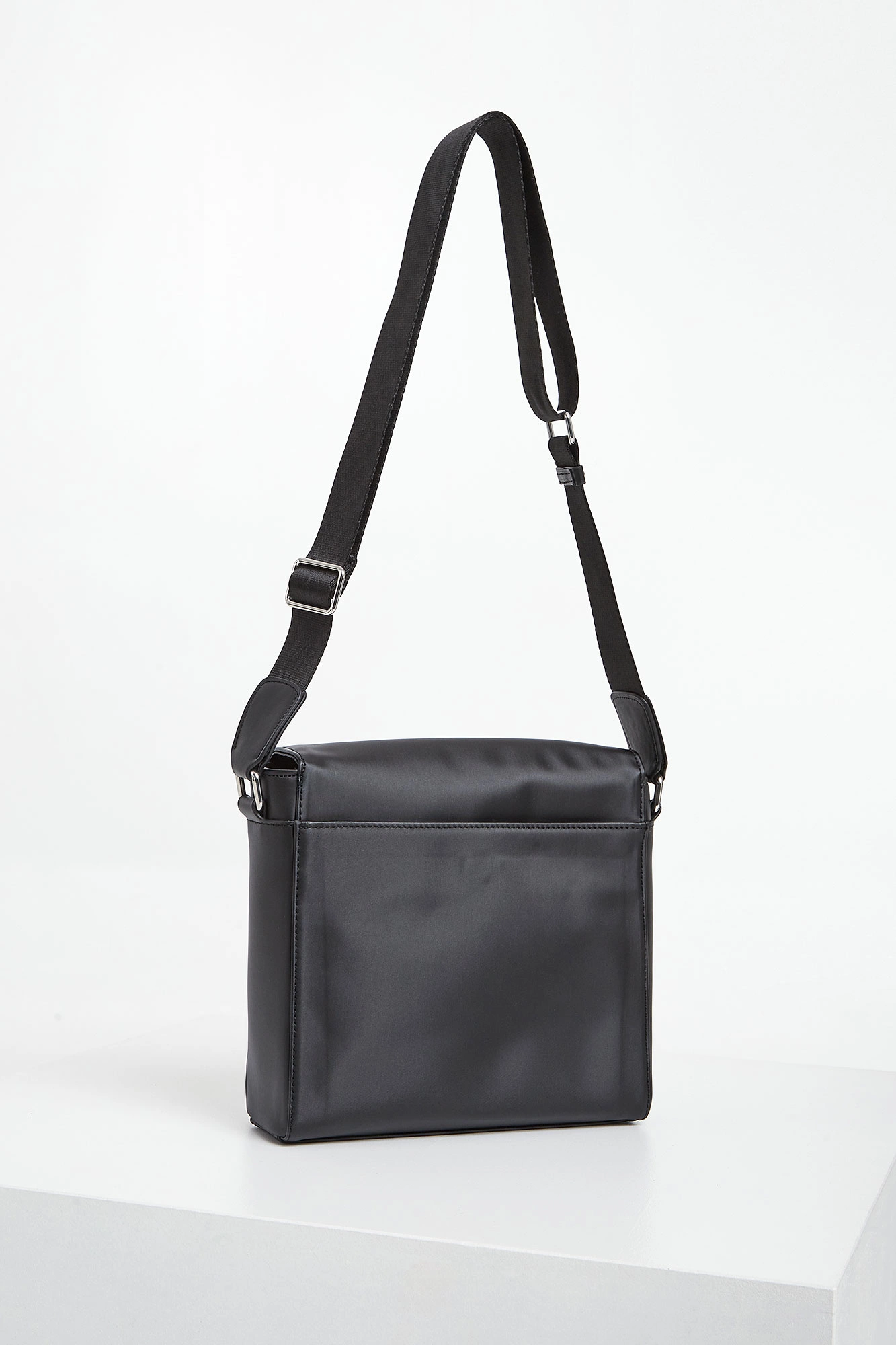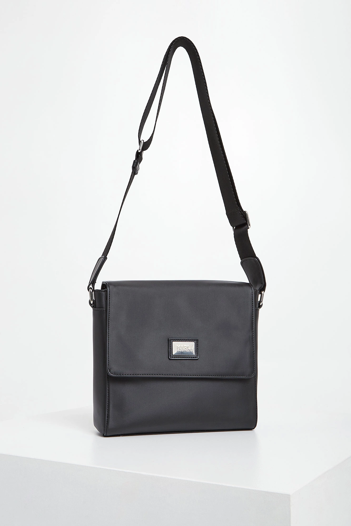 Reporterka marki Karl Lagerfeld w czarnym kolorze. Wykonana z nylonowego materiału. Jednokomorowa. Klapa zapinana na magnesy. Z przodu skórzana naszywka z metalową aplikacją z nazwą marki. Z tyłu kieszeń na zatrzask, a wewnątrz dodatkowa zasuwana. Sygnowana podszewka. Do noszenia na ramię na materiałowym, regulowanym pasku.