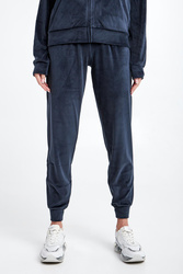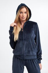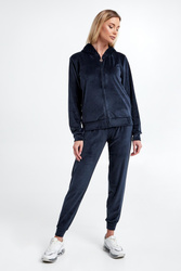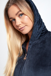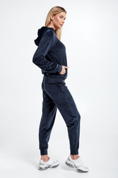 Dres damski marki Emporio Armani Underwear w granatowym kolorze. Całość welurowa. Bluza z pikowanym kapturem. Zapinana za pomocą zamka z sygnowanym suwakiem i zawieszką w kolorze różowego złota. Model z dwoma wpuszczanymi kieszeniami. Długie rękawy i dół wykończone ściągaczem. Spodnie o fasonie typu jogger. Nogawki i pas wykończone szerokim, elastycznym ściągaczem. Z przodu metalowa aplikacja z logo marki w kolorze różowego złota.