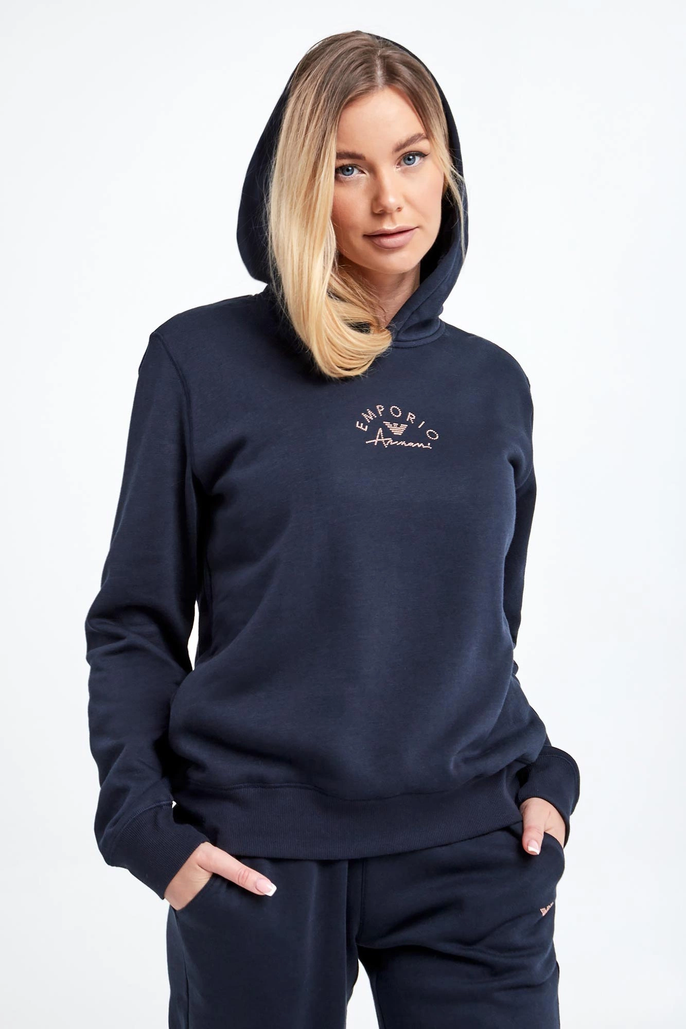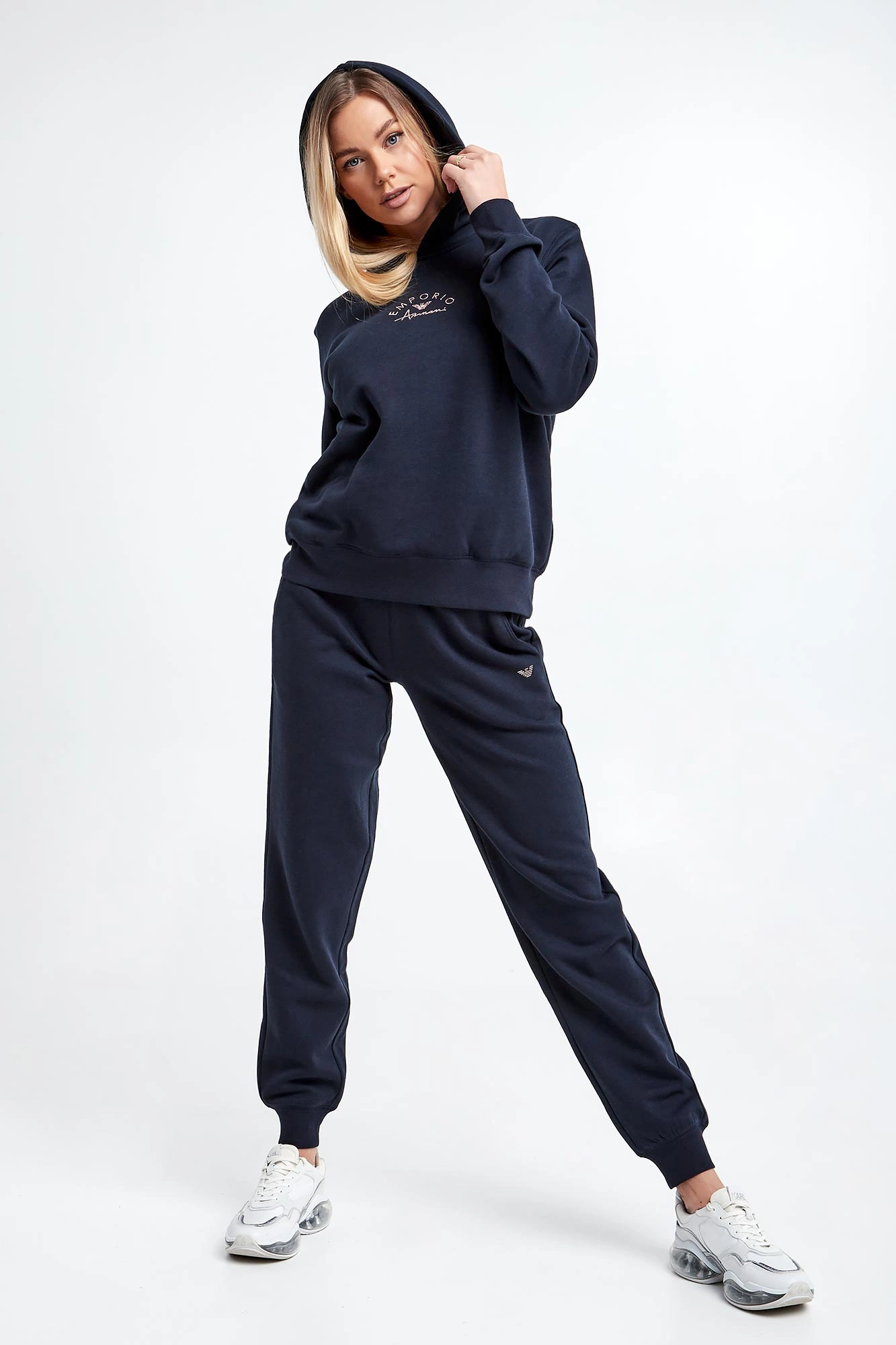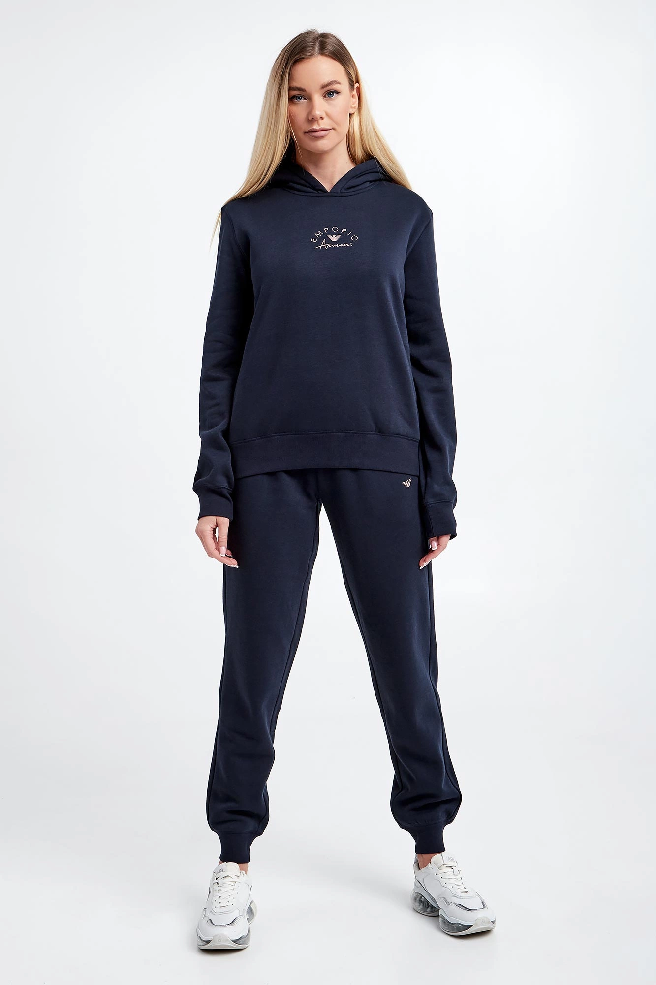 Dres damski marki Emporio Armani Underwear w granatowym kolorze. Wykonany z dresowej dzianiny bawełnianej z dodatkiem elastycznych włókien. Bluza z kapturem. Wewnątrz wykończona materiałem typu miś. Z przodu nazwa marki wykonana z cyrkonii w kolorze różowego złota. Długie rękawy i dół wykończone ściągaczem. Spodnie o fasonie typu jogger. Nogawki i pas wykończone szerokim, elastycznym ściągaczem. Model z dwoma wpuszczanymi kieszeniami. Z przodu logo wykonane z cyrkonii w kolorze różowego złota.