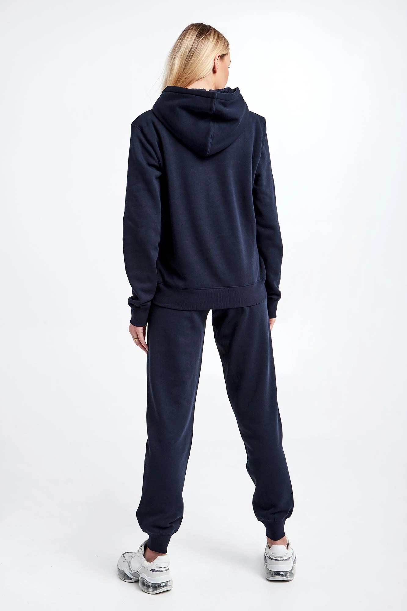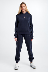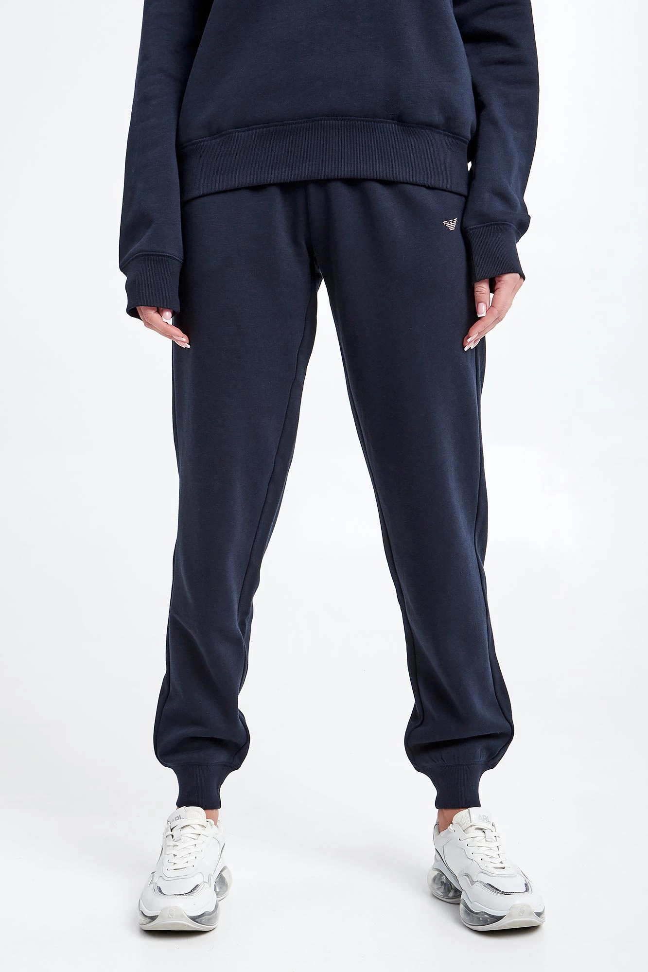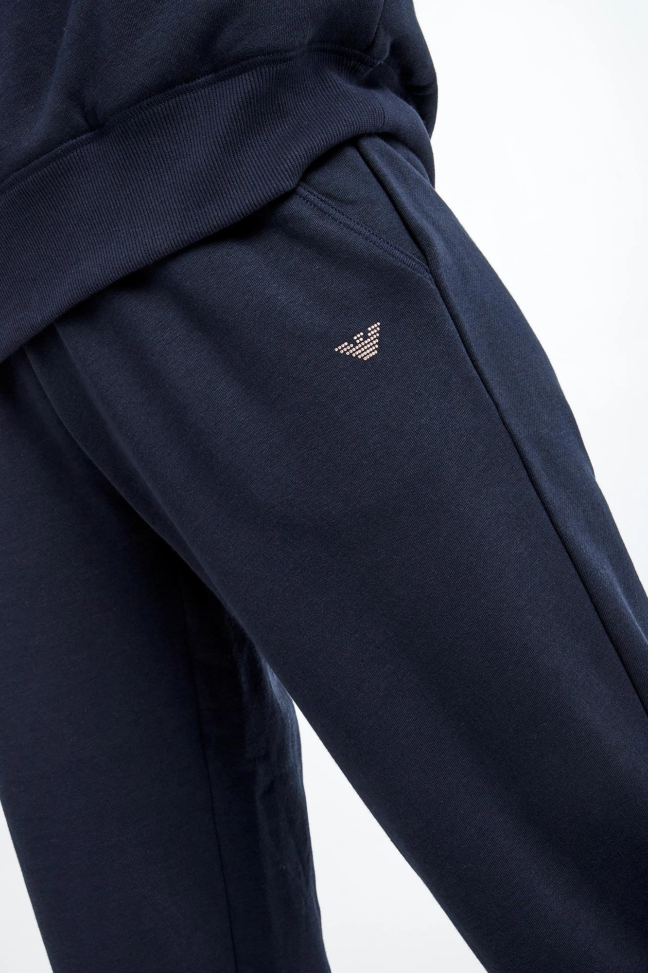 Dres damski marki Emporio Armani Underwear w granatowym kolorze. Wykonany z dresowej dzianiny bawełnianej z dodatkiem elastycznych włókien. Bluza z kapturem. Wewnątrz wykończona materiałem typu miś. Z przodu nazwa marki wykonana z cyrkonii w kolorze różowego złota. Długie rękawy i dół wykończone ściągaczem. Spodnie o fasonie typu jogger. Nogawki i pas wykończone szerokim, elastycznym ściągaczem. Model z dwoma wpuszczanymi kieszeniami. Z przodu logo wykonane z cyrkonii w kolorze różowego złota.