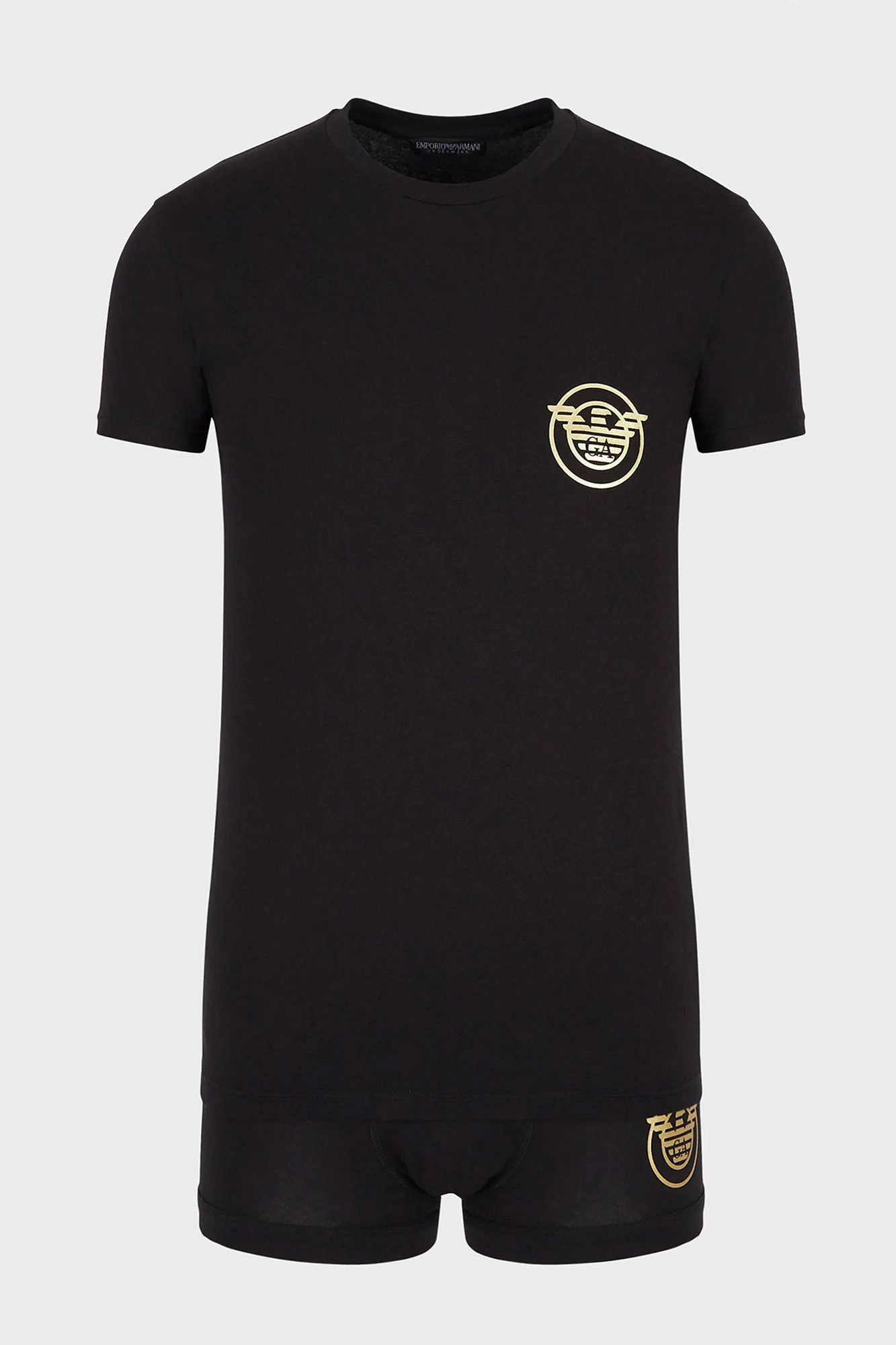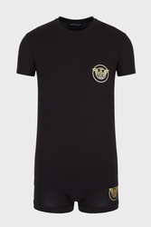 Komplet bielizny marki Emporio Armani w kolorze czarnym. Wykonany z elastycznej bawełny. Koszulka z krótkim rękawem i dekoltem typu o-neck. Na piersi srebrny nadruk z logo marki. Bokserki wykończone logowanym lampasem. Całość wykończona lamówką.