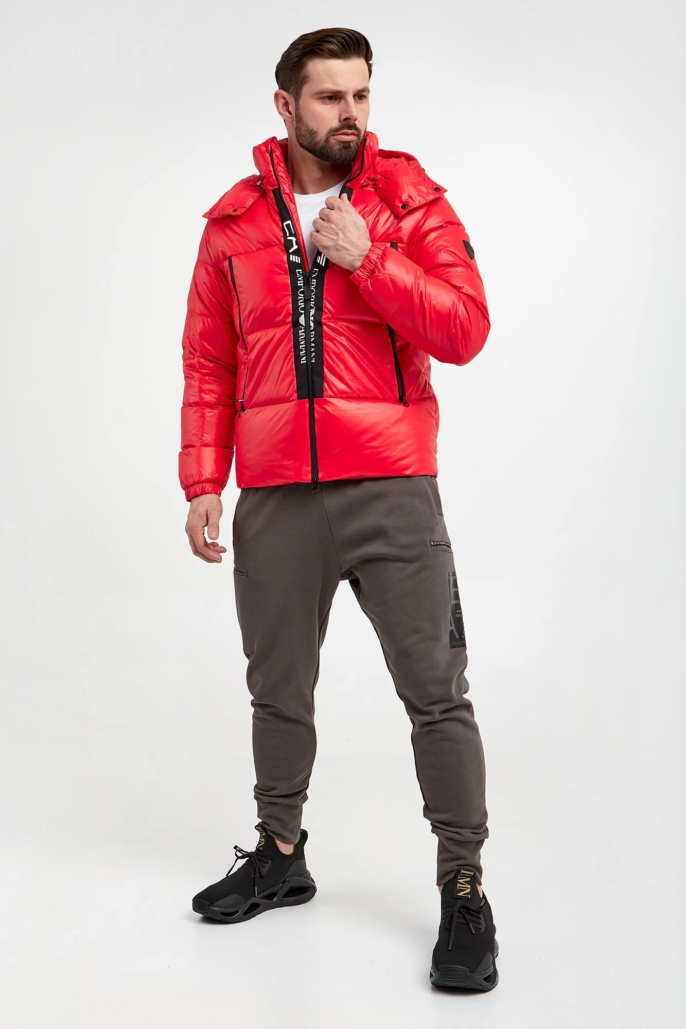 Kurtka puchowa marki EA7 Emporio Armani w kolorze czerwonym. Wypełnienie naturalne. Pikowana. Model ze stójką i odpinanym kapturem regulowanym za pomocą troczków. Zapinana na dwustronny zamek błyskawiczny, ozdobiony wzdłuż krawędzi wstawką z napisem w postaci nazwy marki. Wykonana z tkaniny technicznej z wodoodporną i oddychającą powłoką. Podwójne boczne kieszenie na suwak. Rękawy zakończone ściągaczem. Fason regular.