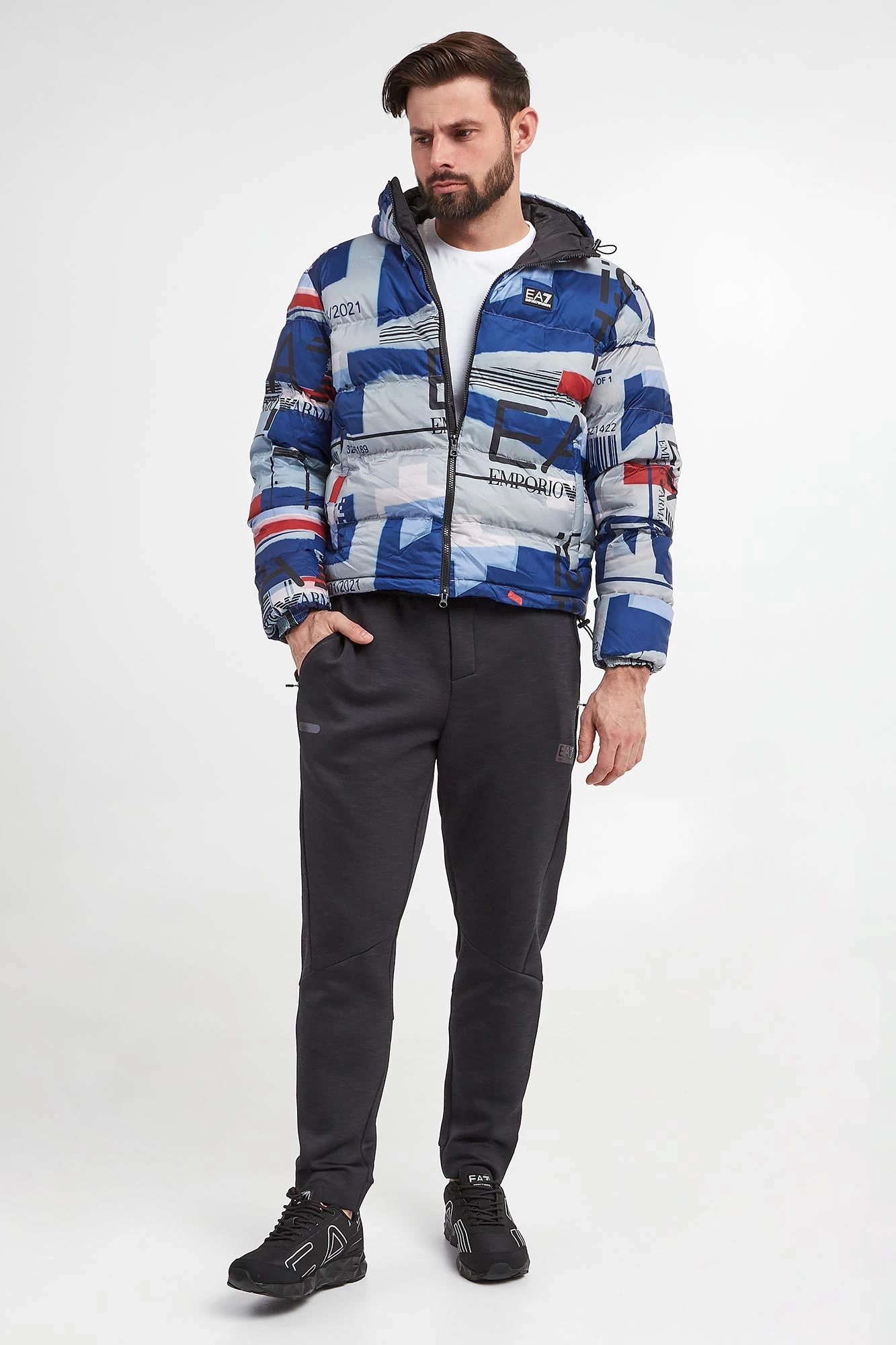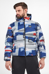 Kurtka marki EA7 Emporio Armani w kolorze niebiesko-szarym. Model ze stójką i kapturem regulowanym za pomocą stoperów. Zapinana na dwustronny zamek błyskawiczny. Ozdobiona bogatym i kolorowym nadrukiem na całej powierzchni. Dwie boczne zasuwane kieszenie. Wyściółka RECYCLED ARDOR7, złożona z innowacyjnego połączenia poliestrowych mikrowłókien o zaawansowanych właściwościach termicznych. Oddychająca i wodoodporna. Na dole ściągacz ze stoperami. Fason regular.
