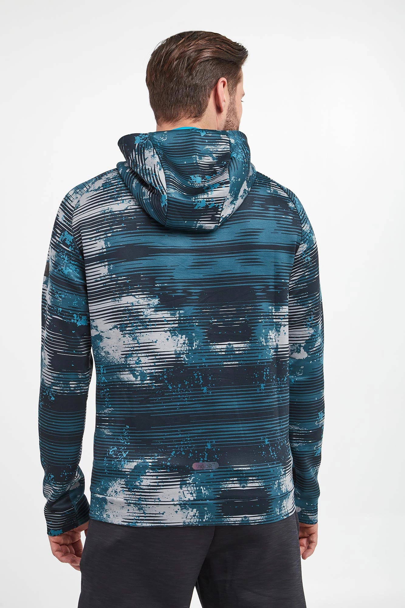 Bluza marki EA7 Emporio Armani w kolorze zielonym. Model z kapturem, regulowanym za pomocą troczków i ozdobionym od wewnątrz kontrastowym kolorem. Zapinana na dwustronny zamek błyskawiczny. Na całości wielokolorowy nadruk. Dwie boczne, zamykane kieszenie. Wykonana w technologii Vigor7, zapewniającej wysoki poziom wydajności podczas intensywnych treningów oraz swobodę ruchów.