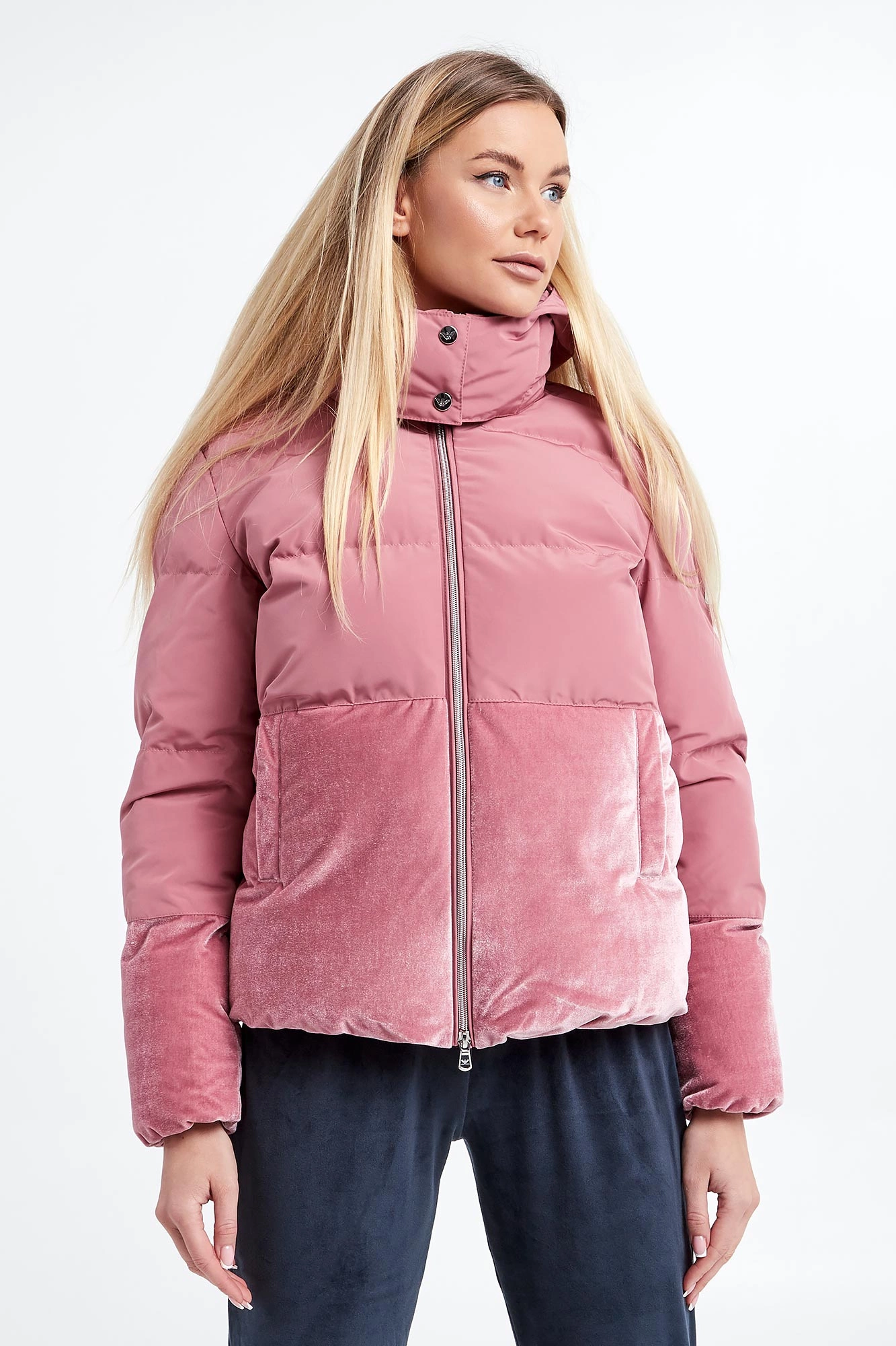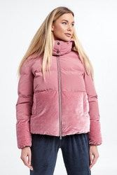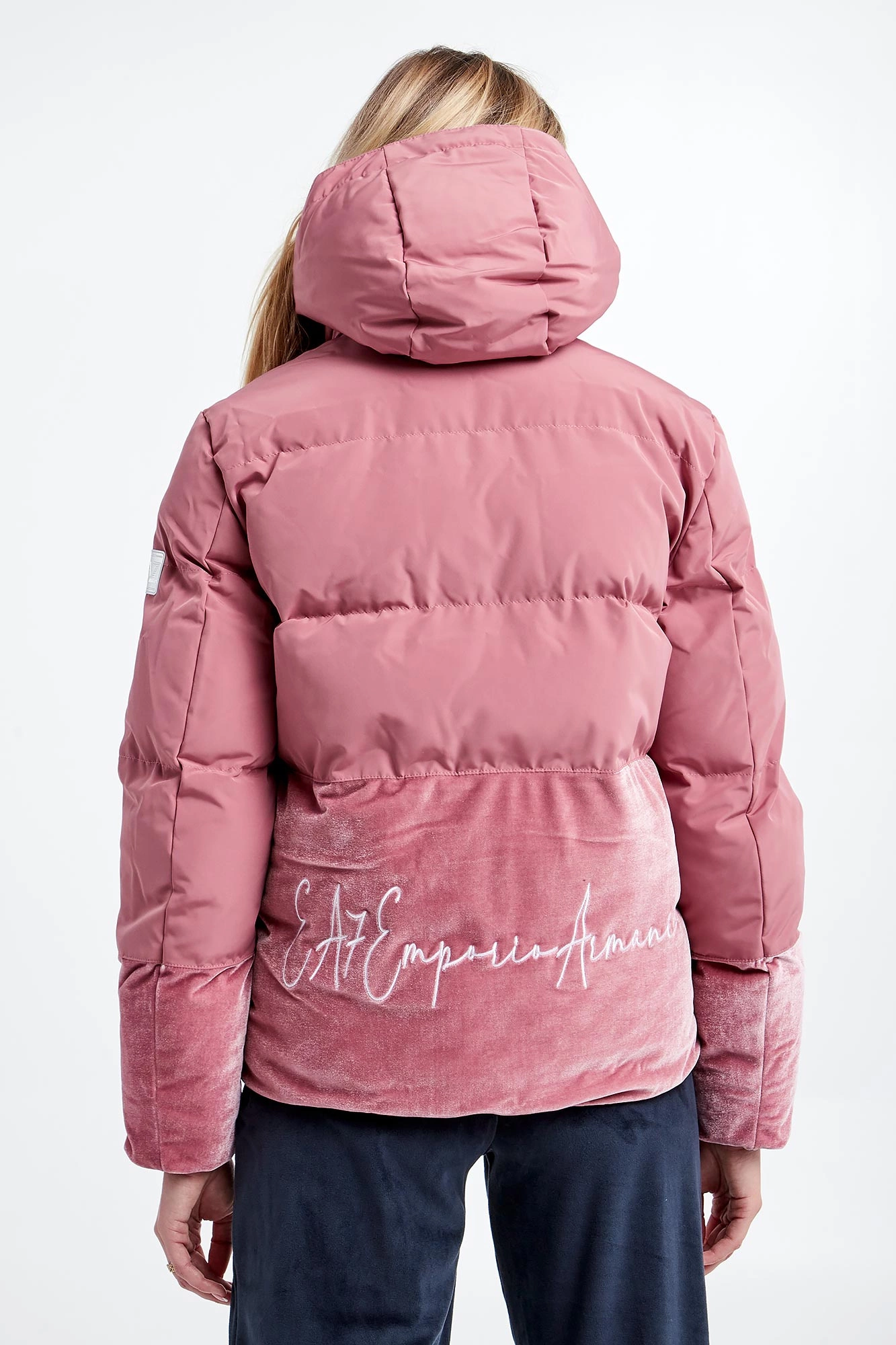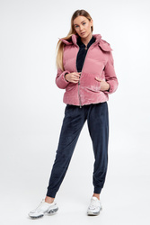 Kurtka marki EA7 Emporio Armani w kolorze różowym. Model ze stójką i odpinanym kapturem. Dół kurtki i rękawów wykonany z weluru. Zapinana na dwustronny, srebrny zamek błyskawiczny z logowaną zawieszką. Rękawy i dół zakończone ściągaczem. Z tyłu haftowany napis w postaci nazwy marki. Fason regular.