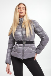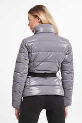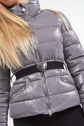 Krótka kurtka pikowana marki EA7 Emporio Armani w kolorze szarym. Wykonana z połyskującego materiału. Wypełniona innowacyjną, pochodzącą z recyklingu tkaniną Thermore EcoDown®, która jest zbliżona do naturalnego puchu, zachowując wysokie parametry izolacyjne i małą wagę. Zapinana na srebrny, dwustronny zamek błyskawiczny z logowaną zawieszką. Model ze stójką i wyciąganym kapturem regulowanym za pomocą stoperów. Dwie zasuwane, boczne kieszenie. Na lewym rękawie metalowa aplikacja w postaci logo marki. Dodatkowo w pasie parciany pasek z dużą, logowaną klamrą. Fason slim.