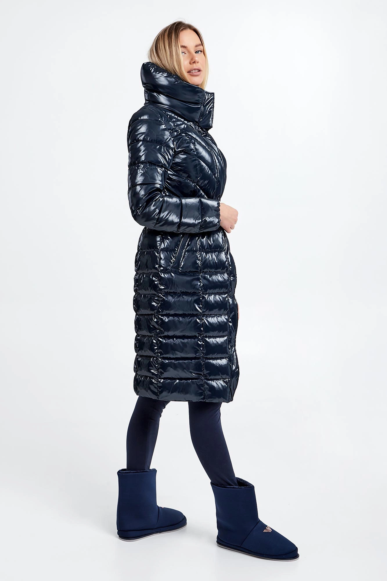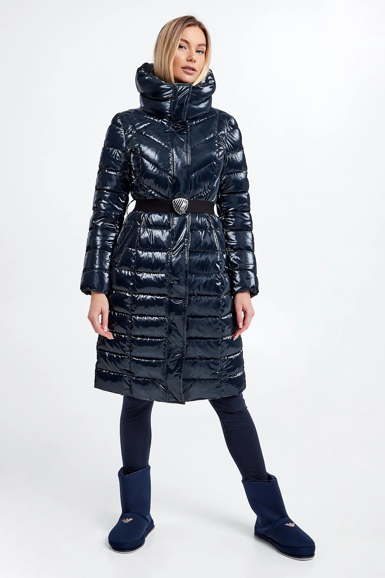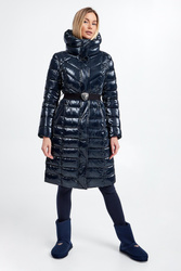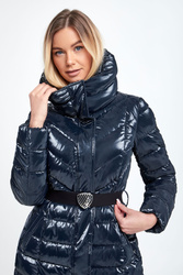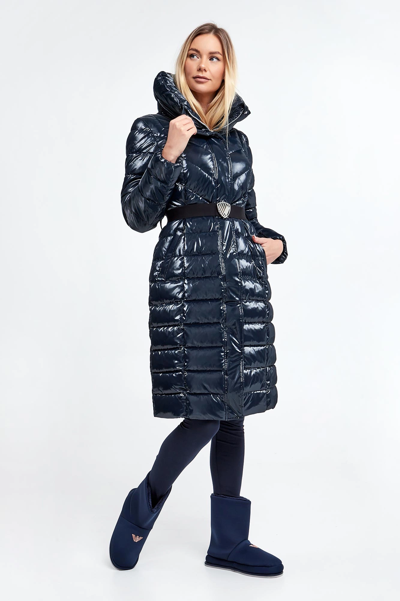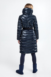 Płaszcz pikowany marki EA7 Emporio Armani w kolorze granatowym. Wykonana z połyskującego materiału. Wypełniona innowacyjną, pochodzącą z recyklingu tkaniną Thermore EcoDown®, która jest zbliżona do naturalnego puchu, zachowując wysokie parametry izolacyjne i małą wagę. Zapinana na srebrny, dwustronny zamek błyskawiczny z patką. Model ze stójką i wyciąganym kapturem regulowanym za pomocą stoperów. Dwie zasuwane, boczne kieszenie. Na lewym rękawie metalowa aplikacja w postaci logo marki. Długie rękawy zakończone ściągaczem. W pasie parciany pasek z dużą, logowaną klamrą. Fason slim.