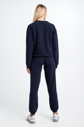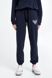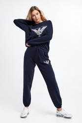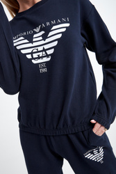 Dres marki Emporio Armani Underwear w granatowym kolorze. Wykonany z elastycznego, bawełnianego materiału. Bluza z długim rękawem, fason regular. Prążkowany dekolt typu o-neck. Na piersi i przodzie spodni kontrastowy, biały nadruk z logo marki. Spodnie z dwiema kieszeniami. Regulacja w pasie za pomocą troczków. Całość wykończona elastycznymi ściągaczami. Fason spodni typu jogger.