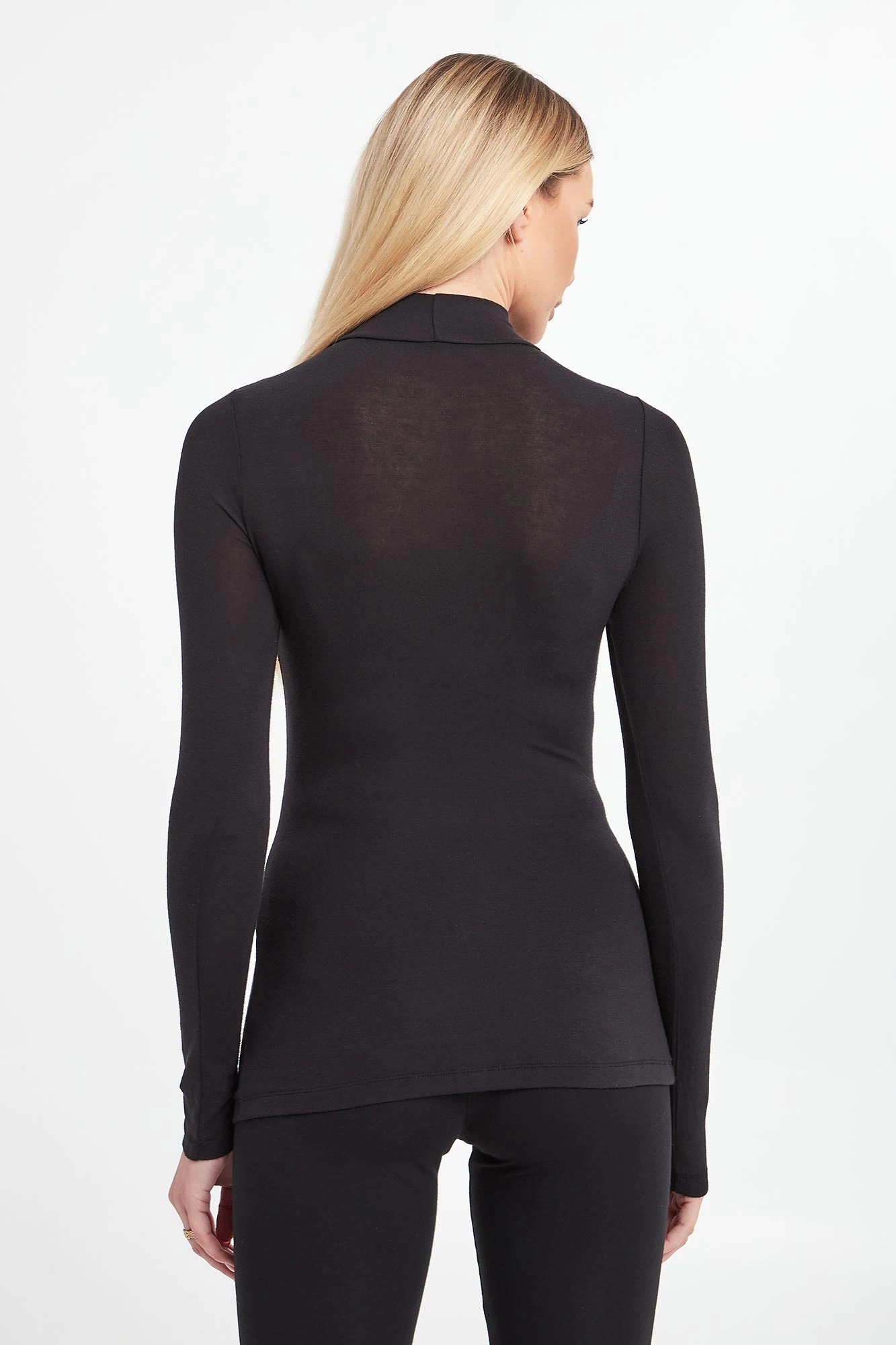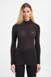 Longsleeve marki Emporio Armani Underwear w kolorze czarnym. Wykonany z przyjemnego w dotyku i elastycznego, wiskozowego materiału. Dekolt wykończony półgolfem. Z przodu kontrastujące, kryształkowe logo w różowym kolorze. Dół i rękawy wykończone lamówką. Fason typu slim. Produkt stworzony zgodnie z zasadami zrównoważonej mody.