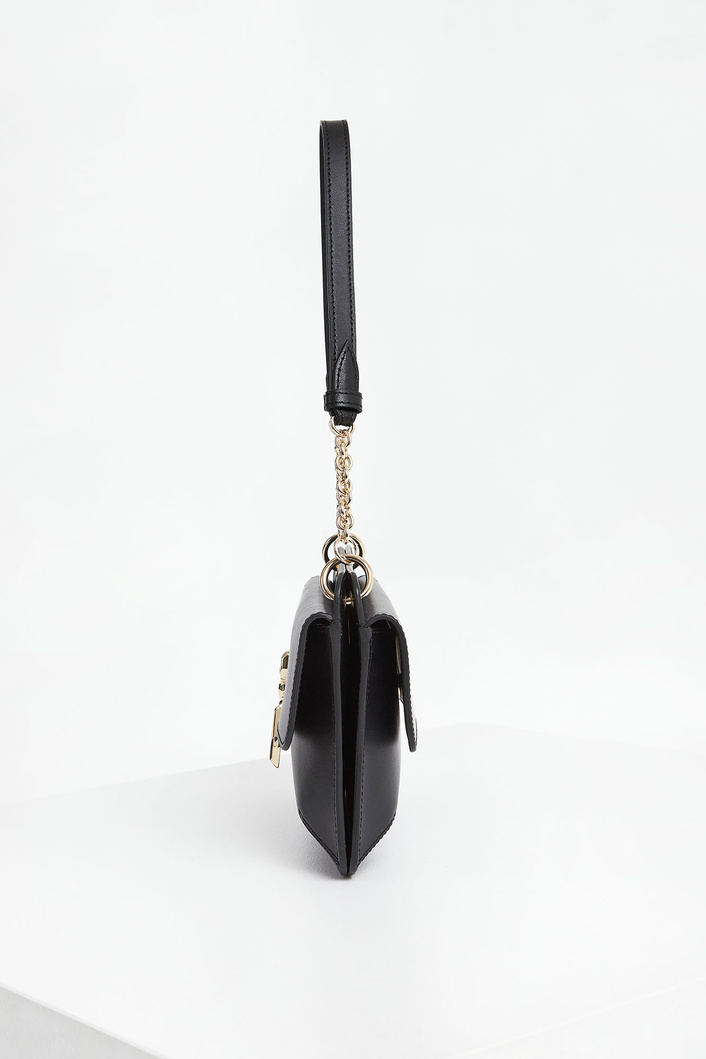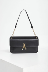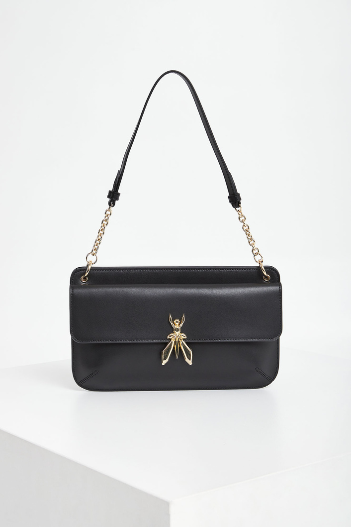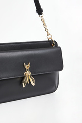 Torebka marki Patrizia Pepe w kolorze czarnym. Duża kopertówka. Wykonana ze skóry licowej. Model dwukomorowy. Pomiędzy komorami dodatkowa wstawka na karty. Po obu stronach klapy zapinane na magnes. Z przodu duże, złote logo marki ważka-FLY. Do noszenia na ramię za pomocą krótkiego paska z łańcuszkiem.