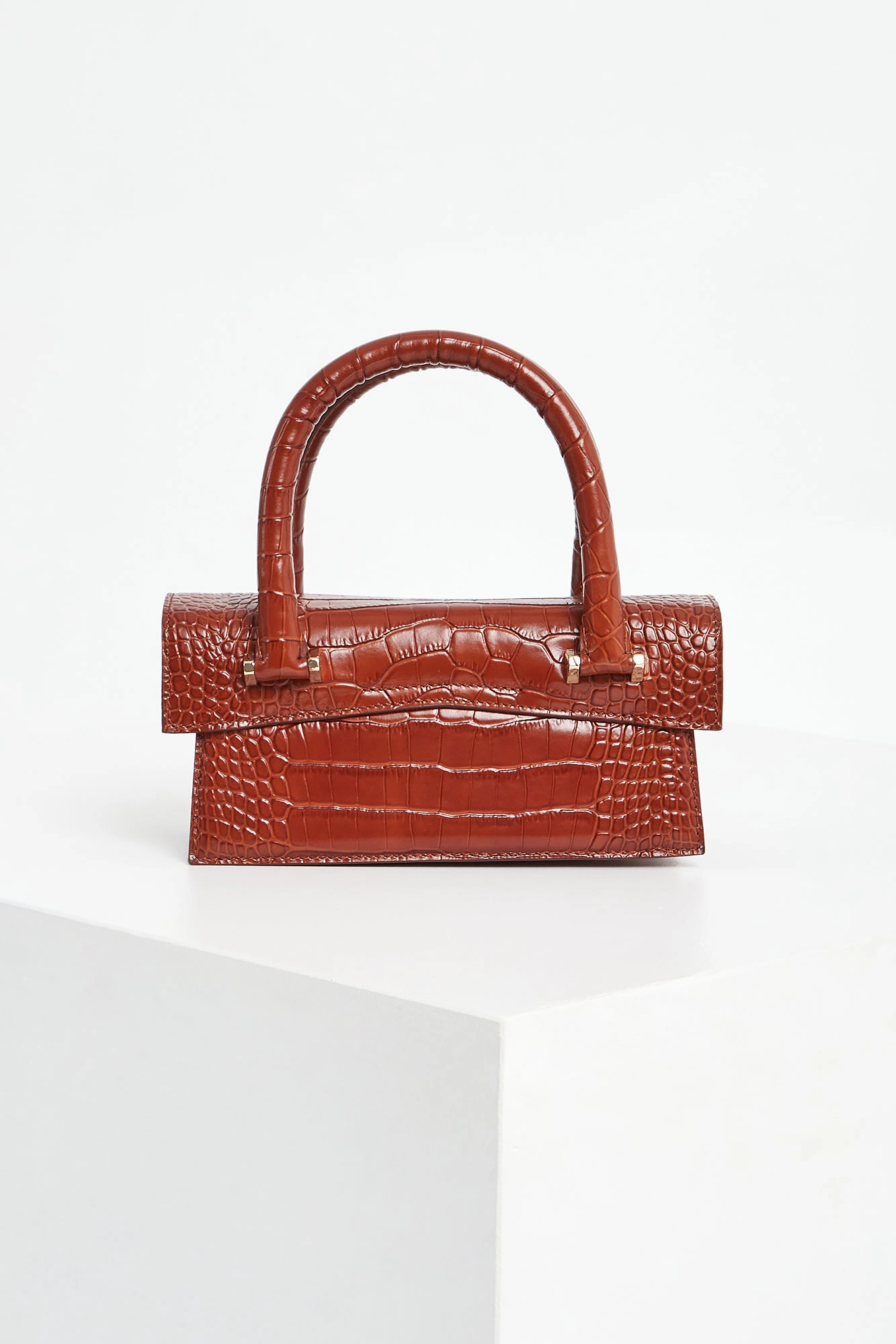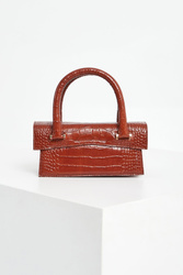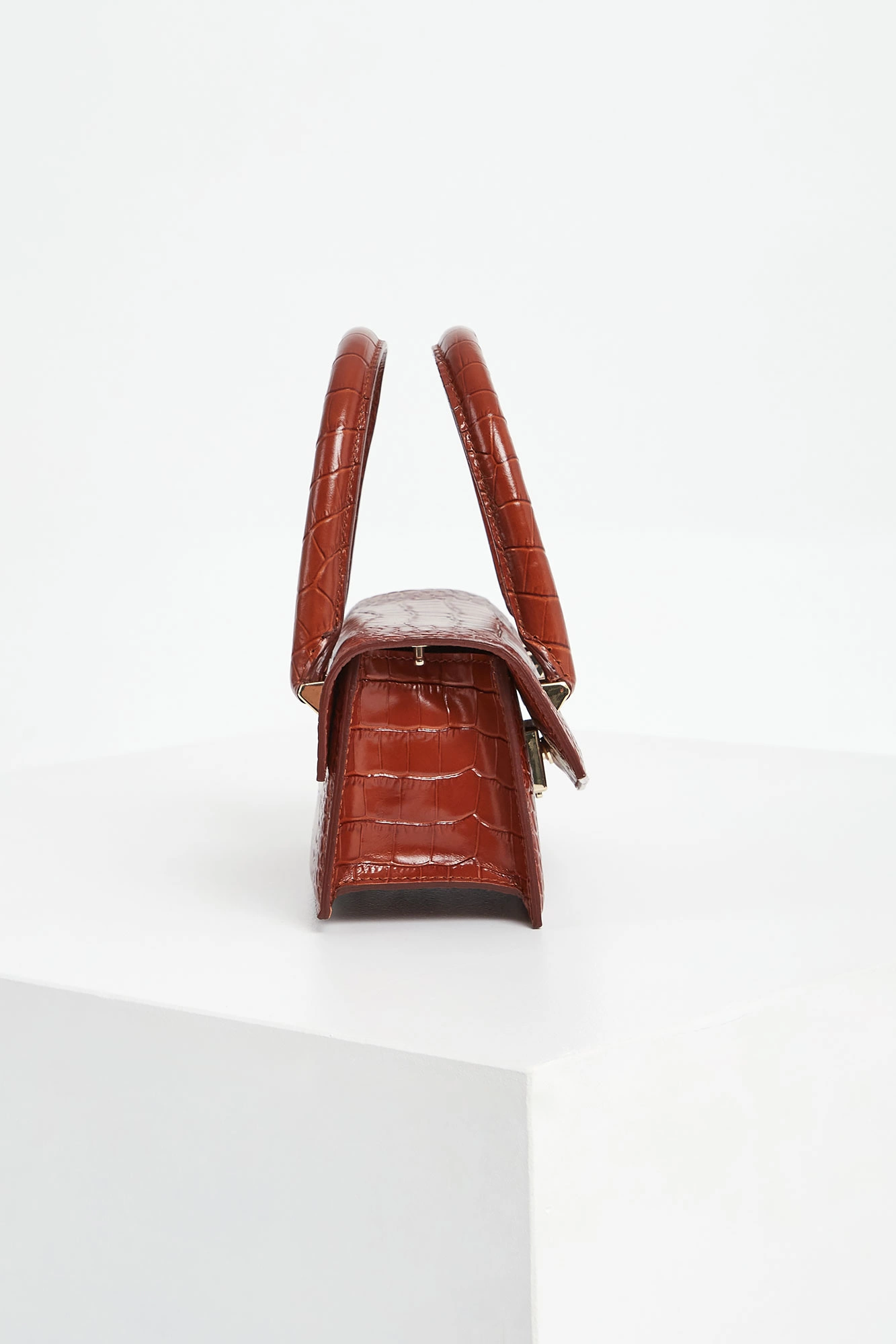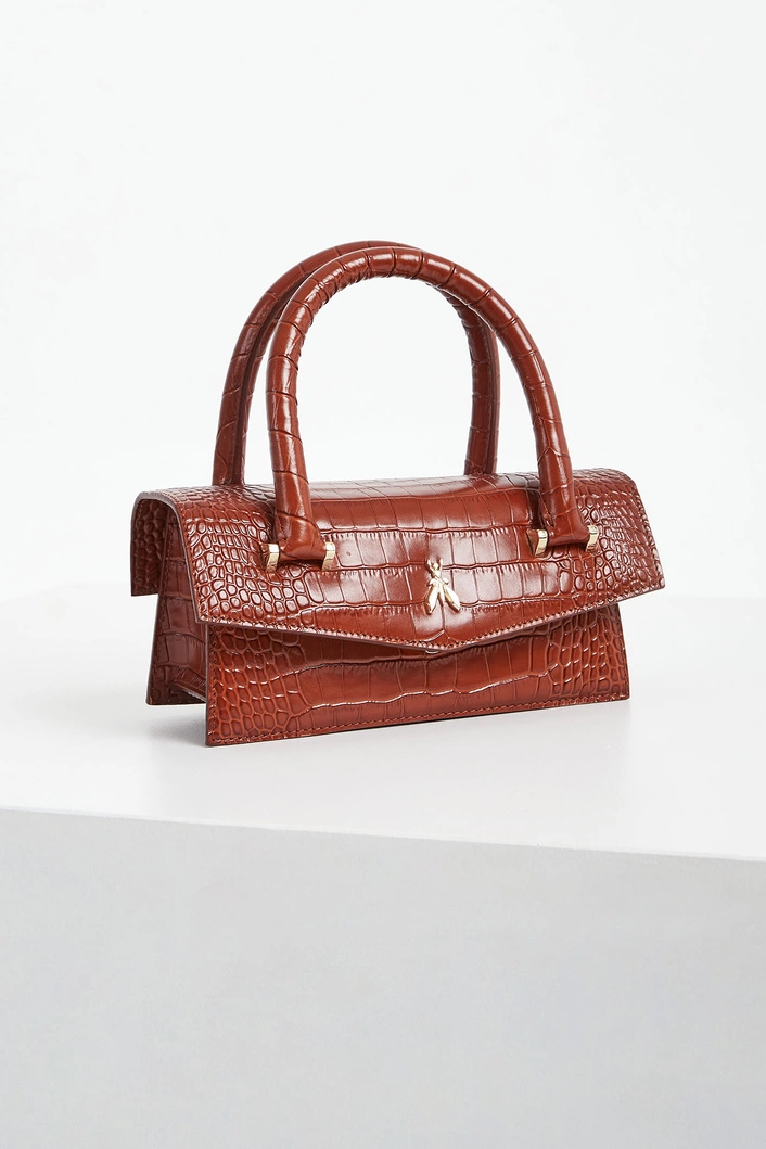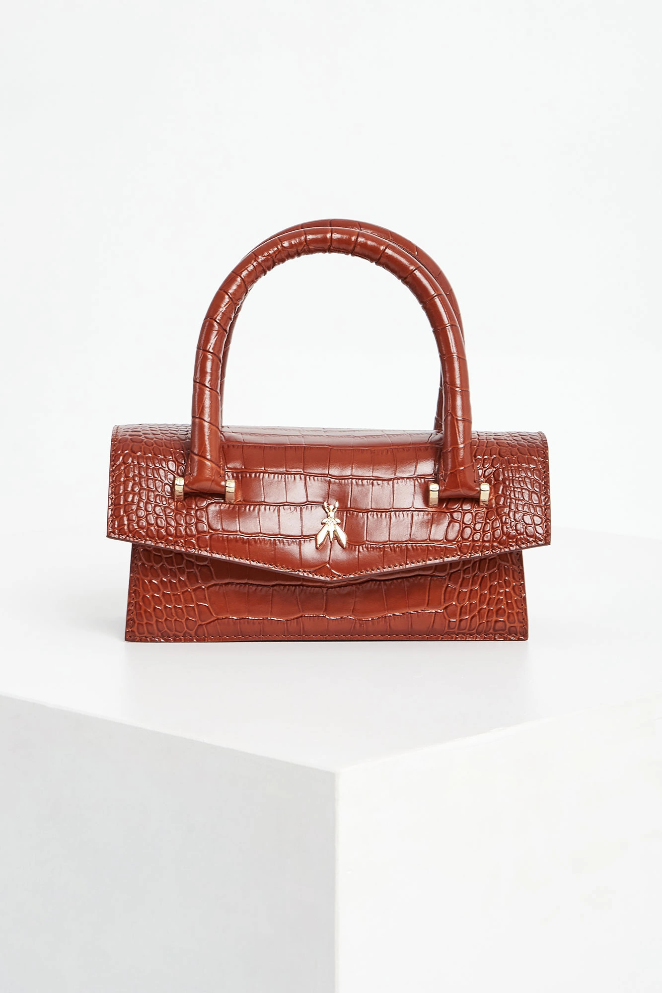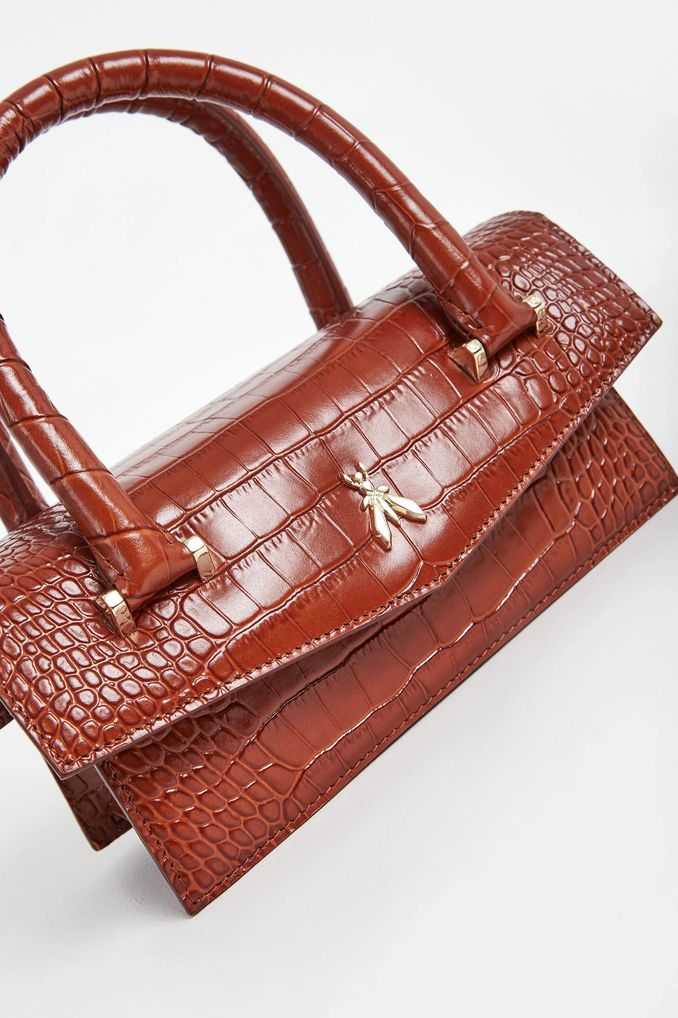 Torebka skórzana marki Patrizia Pepe w karmelowym kolorze. Typu kuferek. Wykonana z naturalnej skóry z tłoczonym wzorem skóry krokodyla. Jednokomorowa. Z klapą zapinaną za pomocą krytego zapięcia i ozdobiona owadzim logo w złotym kolorze. Do noszenia na podwójnych krótkich rączkach lub długim, regulowanym pasku, z możliwością odczepienia. Wewnątrz dodatkowa kieszeń.