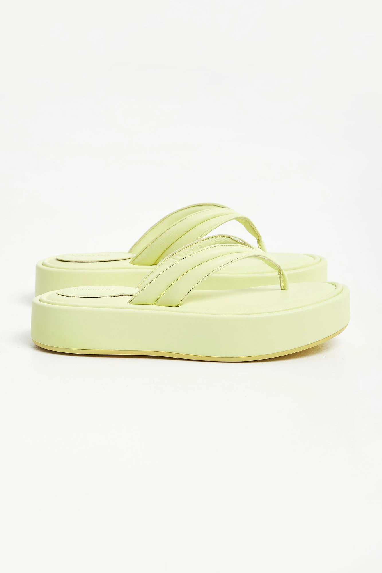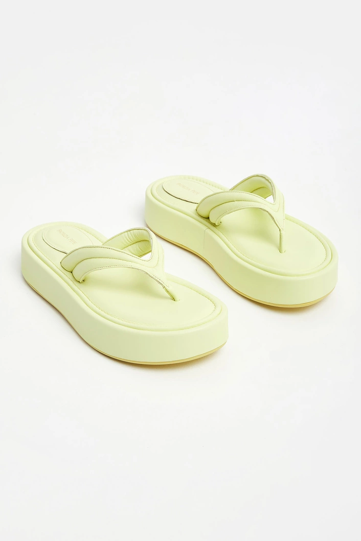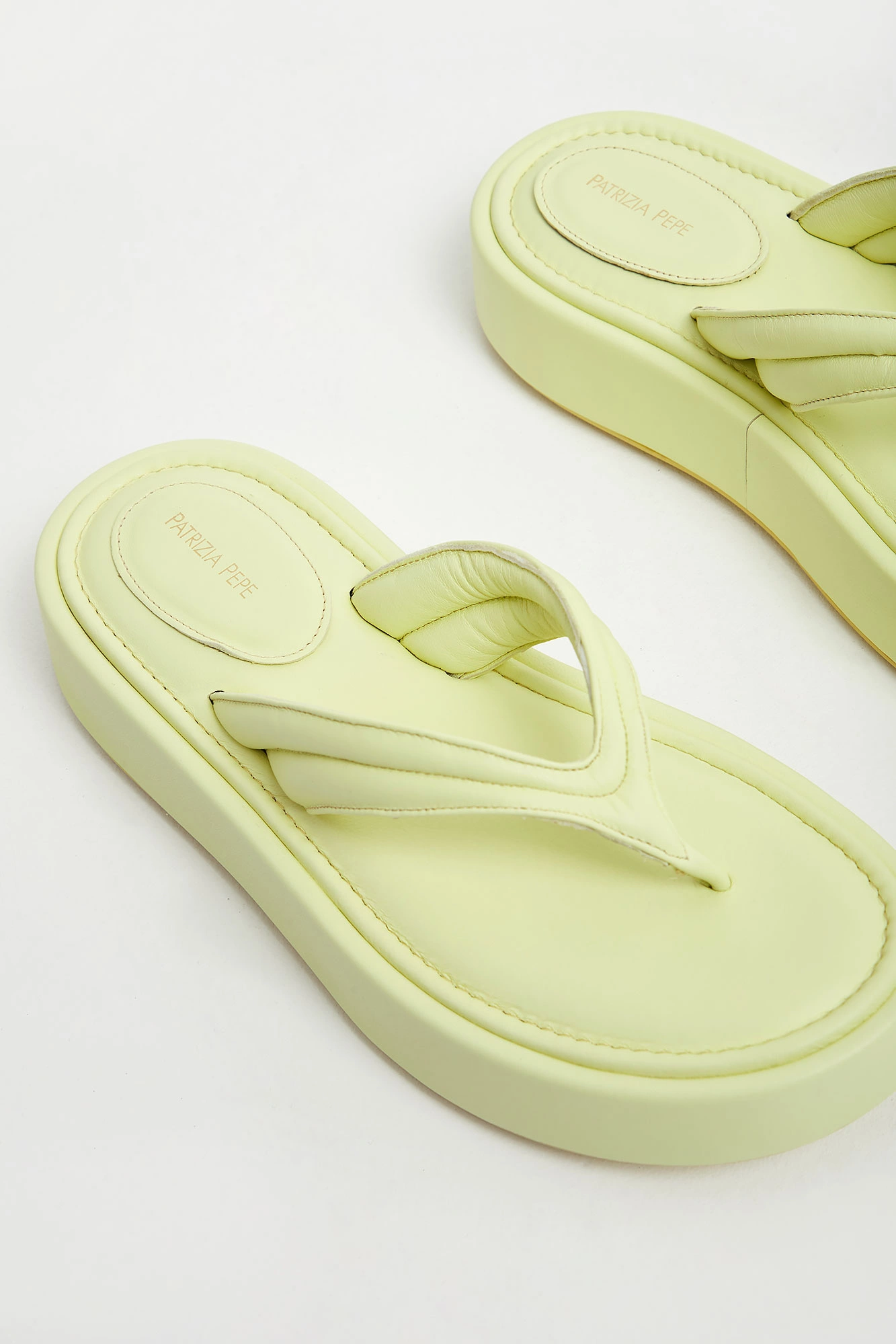 Japonki na płaskiej podeszwie marki Patrizia Pepe w kolorze limonkowym. Wykonane z miękkiej skóry nappy. Skórzana, logowana wyściółka. Gumowa podeszwa z logo.