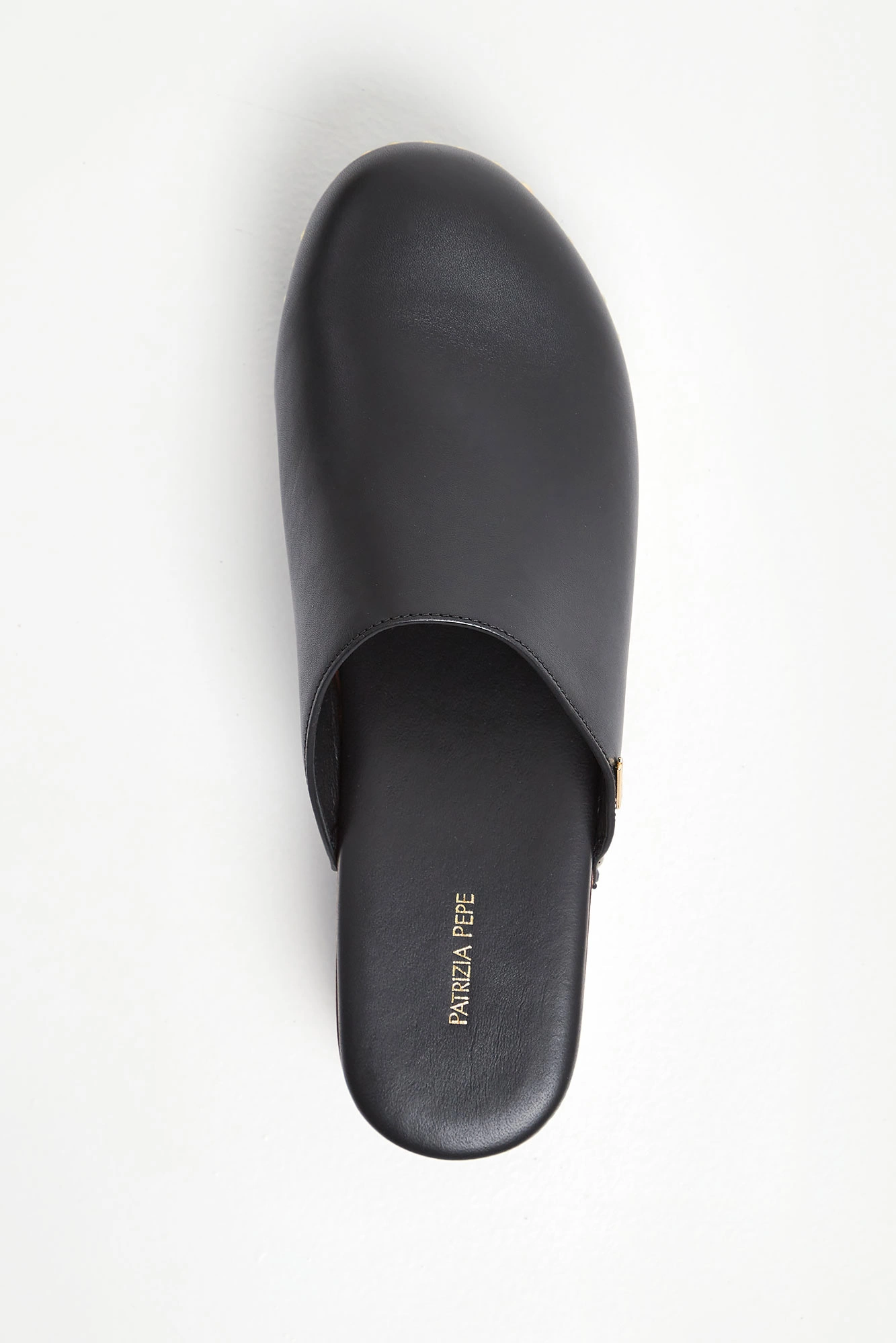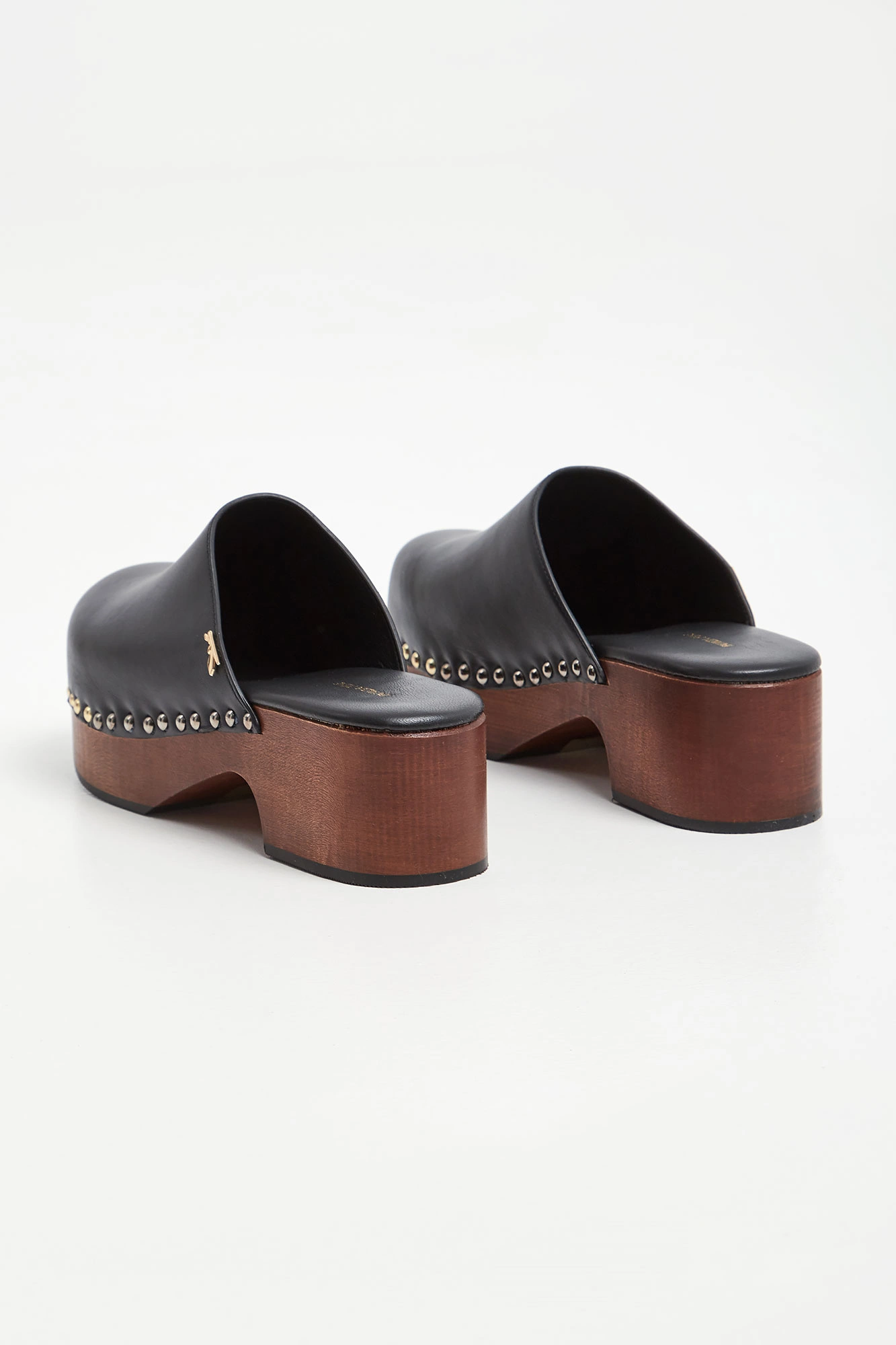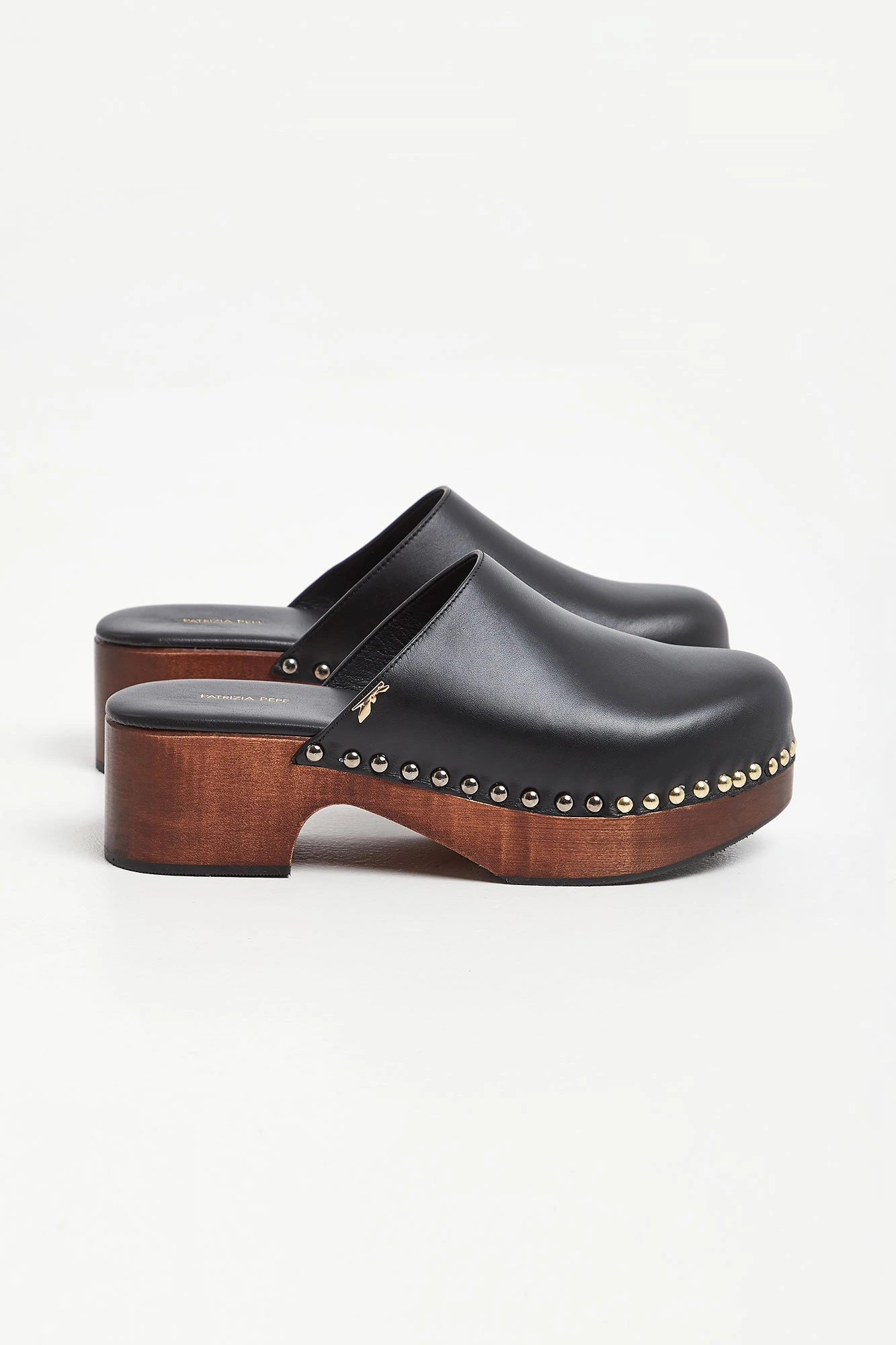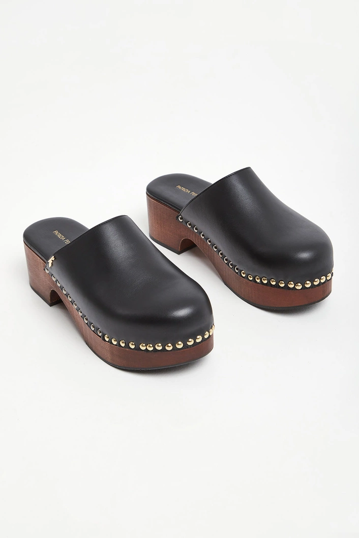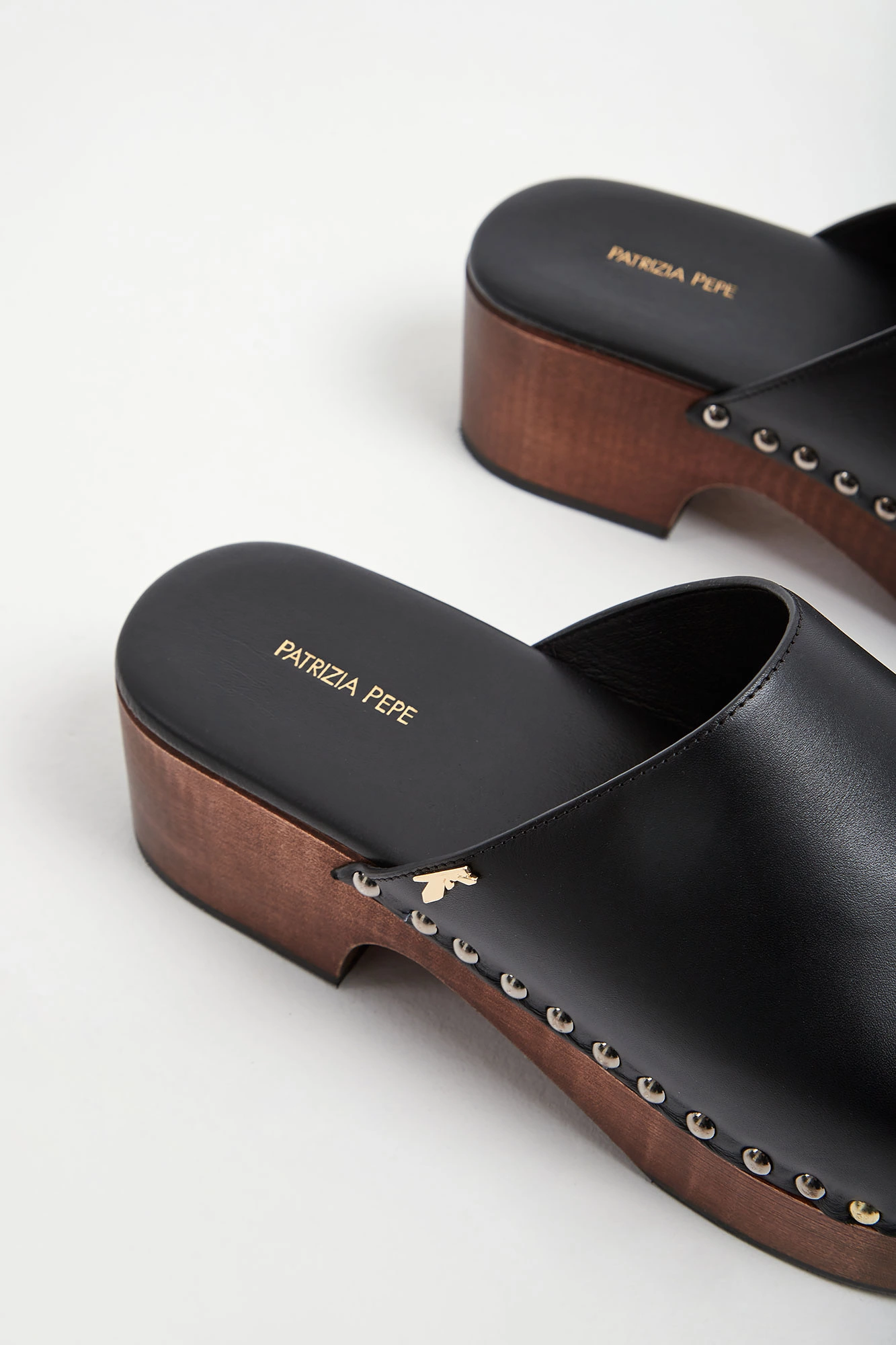 Chodaki marki Patrizia Pepe w kolorze czarnym. Wykonane ze skóry cielęcej. Model typu Sabot. Od zewnętrznej strony aplikacja z logo FLY. Drewniana podeszwa i przyszwa ze skóry ozdobione złotymi ćwiekami. Czarna wyściółka z nazwą marki.