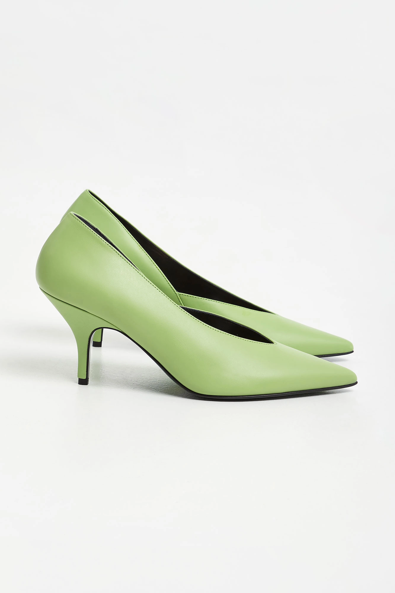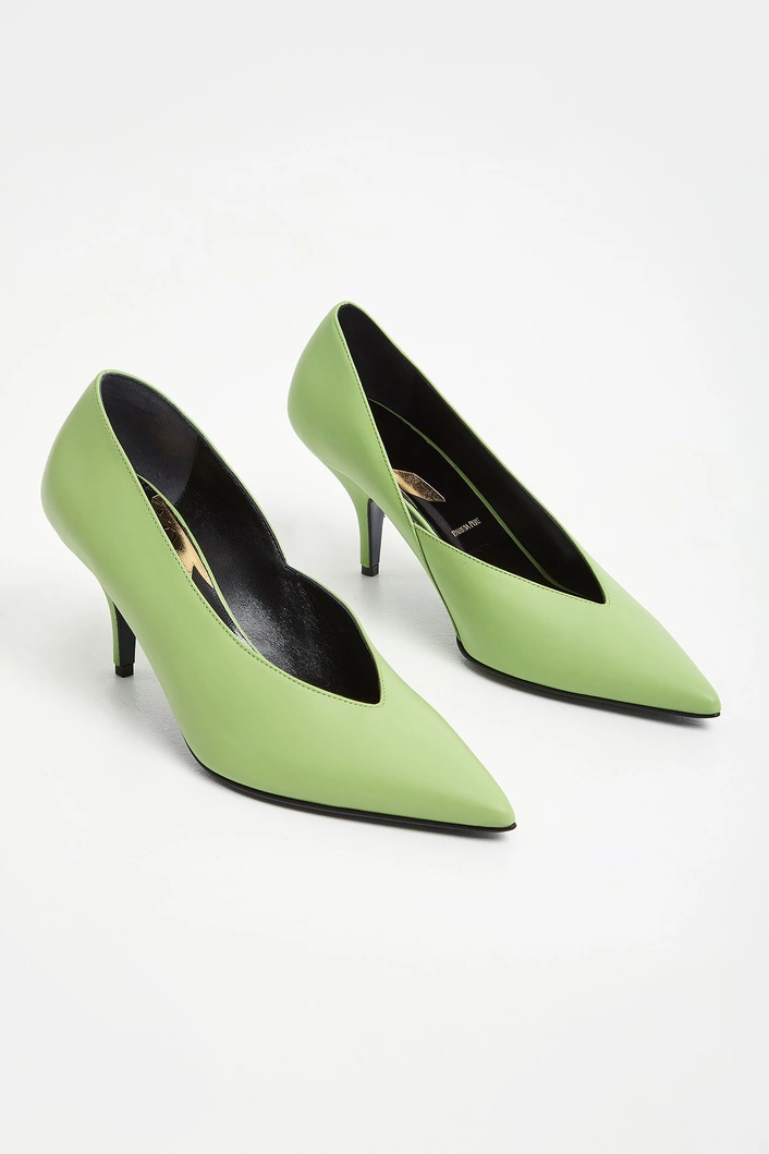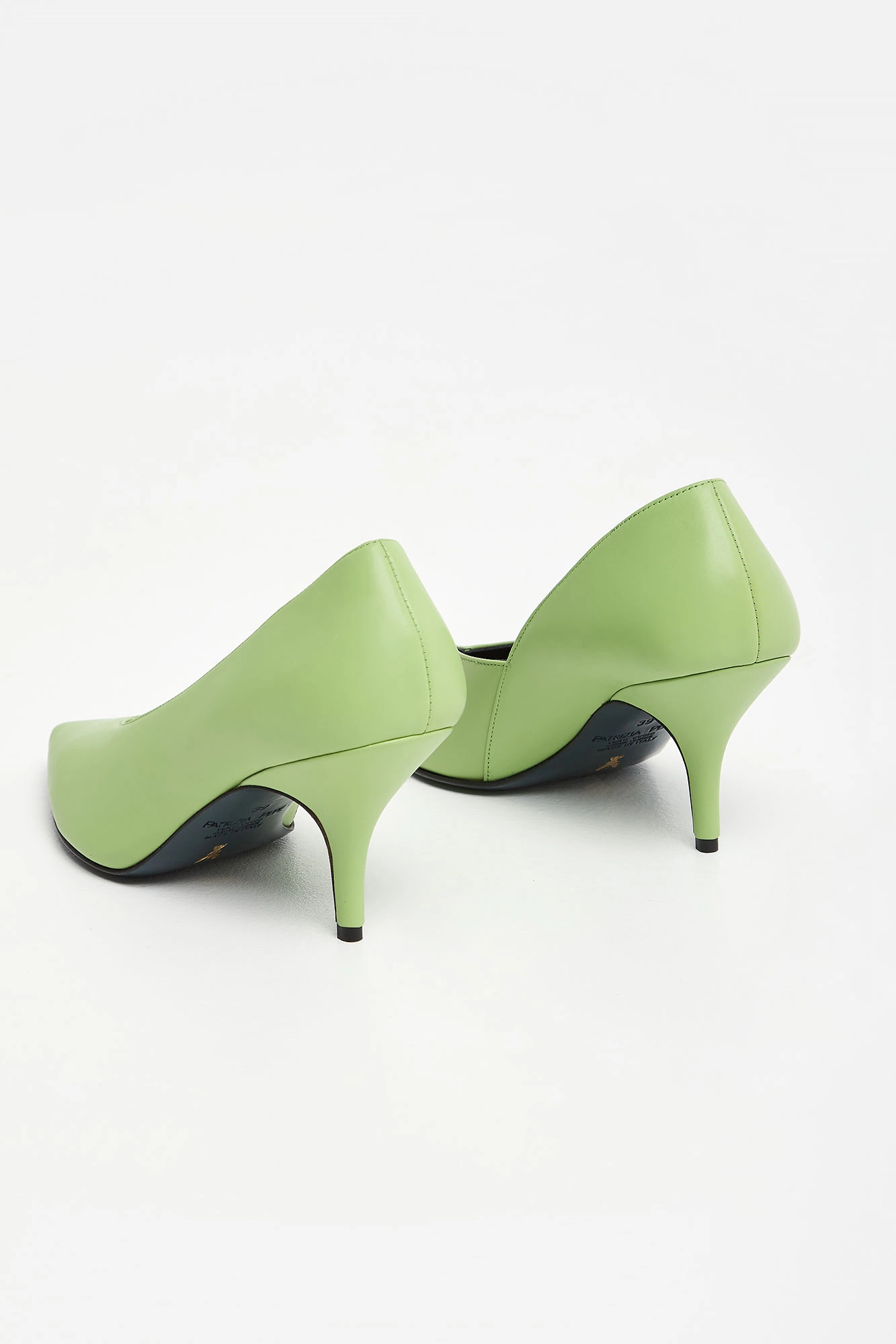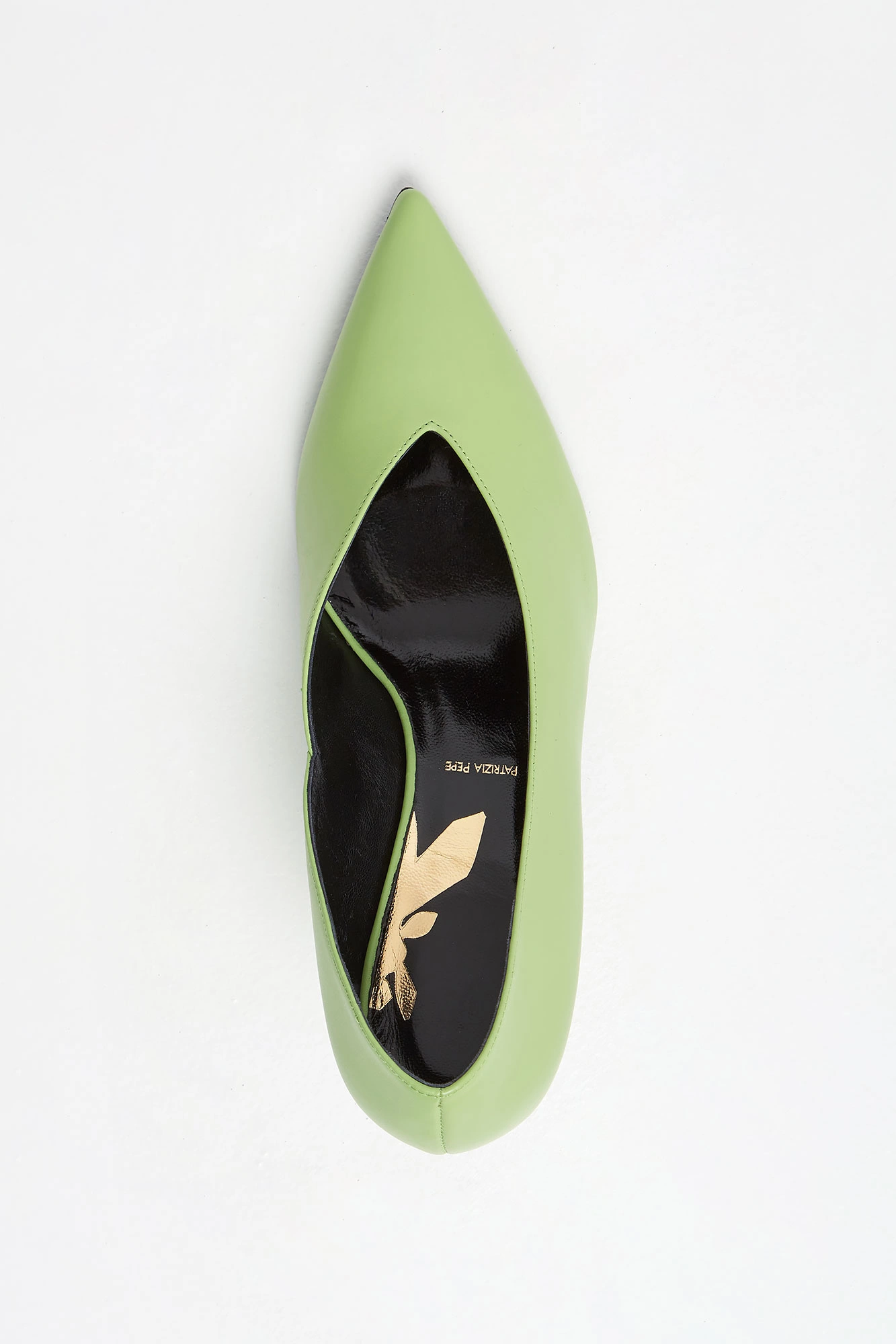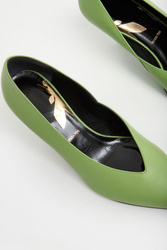 Szpilki marki Patrizia Pepe w kolorze zielonym. Wykonane z cielęcej skóry. Spiczasty nosek. Skórzana czarna podszewka i spersonalizowana wkładka z logo FLY.