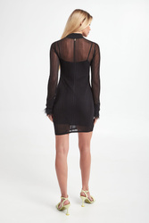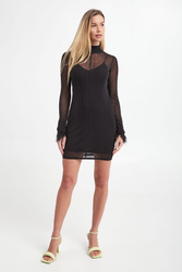 Sukienka ołówkowa z półgolfem marki Patrizia Pepe w kolorze czarnym. Model z halką, wykonany z elastycznego, pół-przeźroczystego materiału. Prążkowana. Długie rękawy wykończone szerokim ściągaczem i odpinanymi na guziki, strusimi piórami. Na karku ozdobna aplikacja logo marki w złotym kolorze. Fason typu slim, długość mini.
