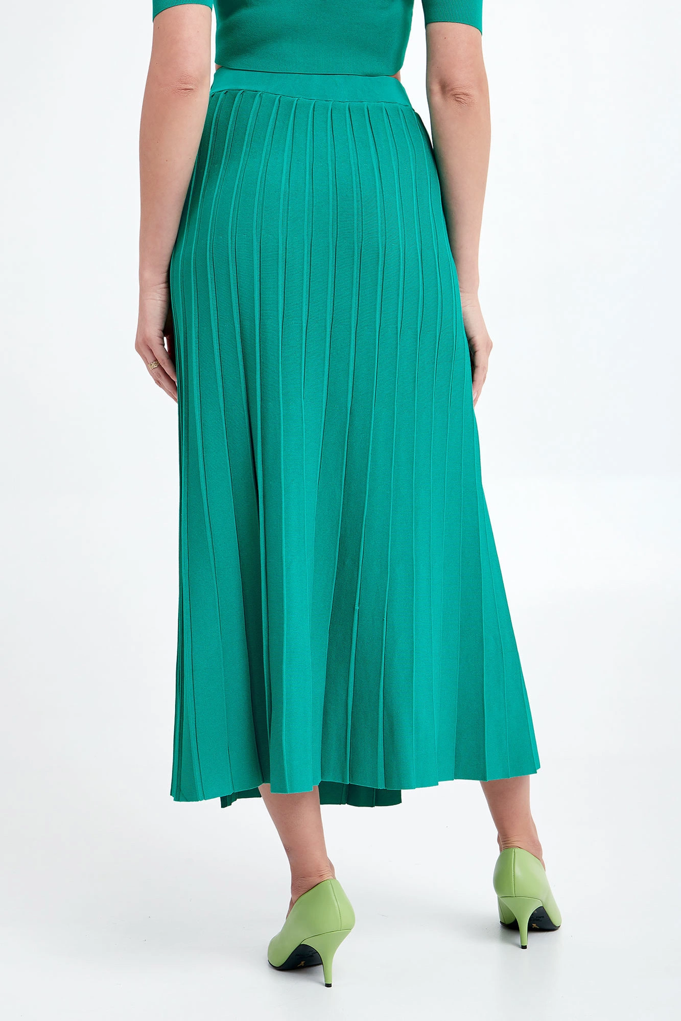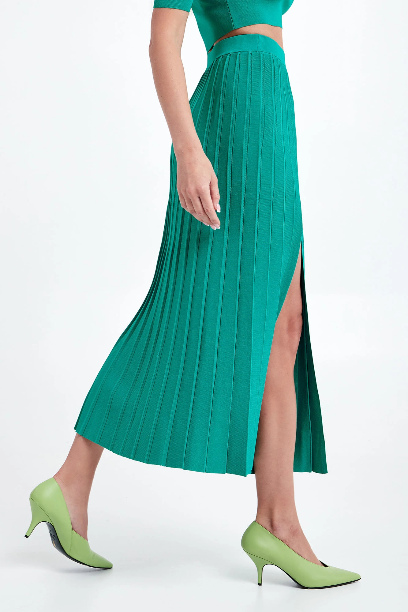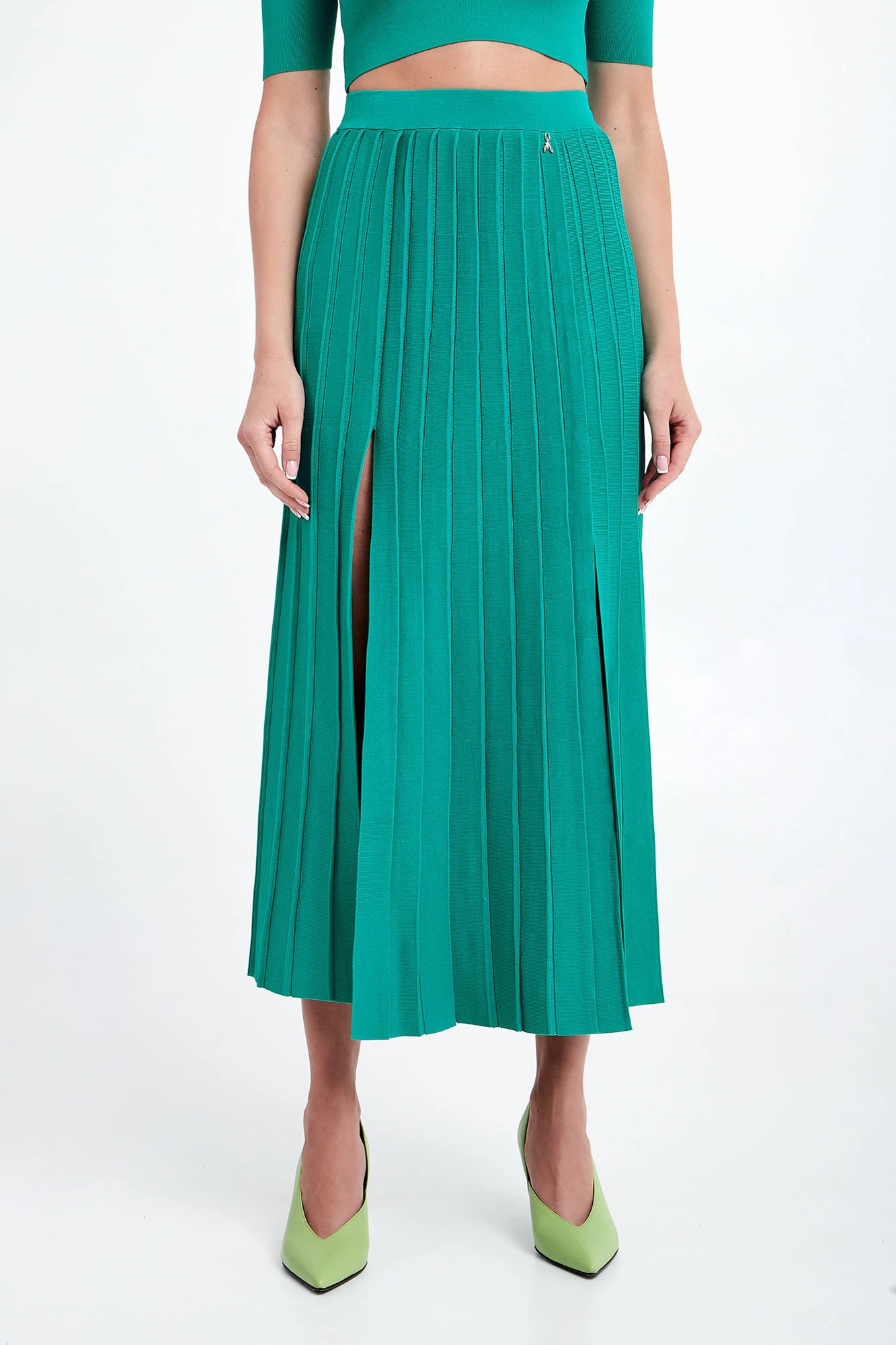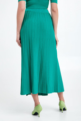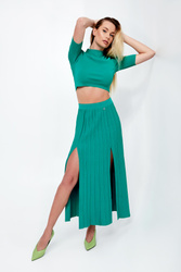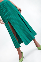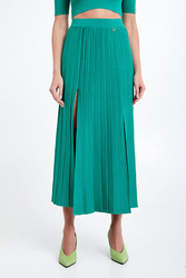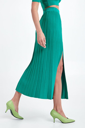 Spódnica marki Patrizia Pepe w kolorze zielonym. Wykonana z wiskozowej dzianiny o delikatnym splocie. Całość plisowana. W pasie elastyczny prążkowany ściągacz. Model z dwoma rozcięciami na przodzie. Fason typu regular, długość midi.