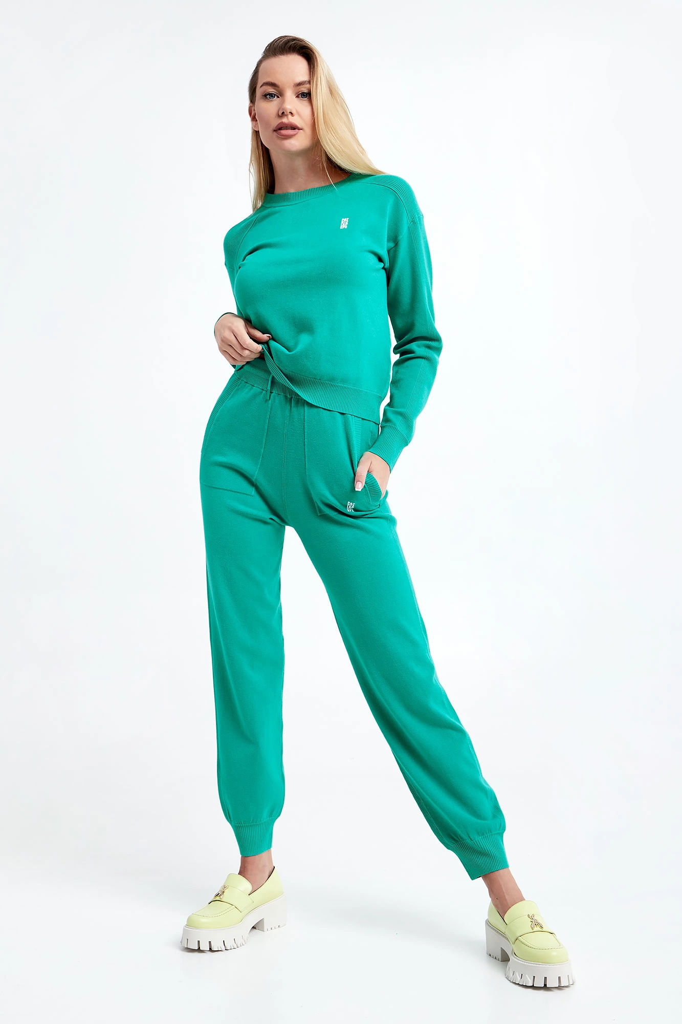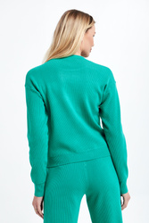 Sweter marki Patrizia Pepe w zielonym kolorze. Wykonany z elastycznej, swetrowej dzianiny o drobnym splocie. Model z linii Go Green, wspierającej zrównoważone procesy produkcyjne. Przód gładki, tył prążkowany. Dekolt typu o-neck. Na klatce piersiowej minimalistyczny, wypukły nadruk tworzący nazwę marki. Całość wykończona prążkowanymi ściągaczami.
