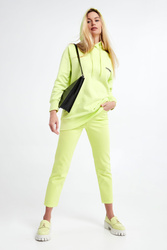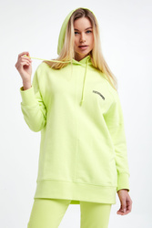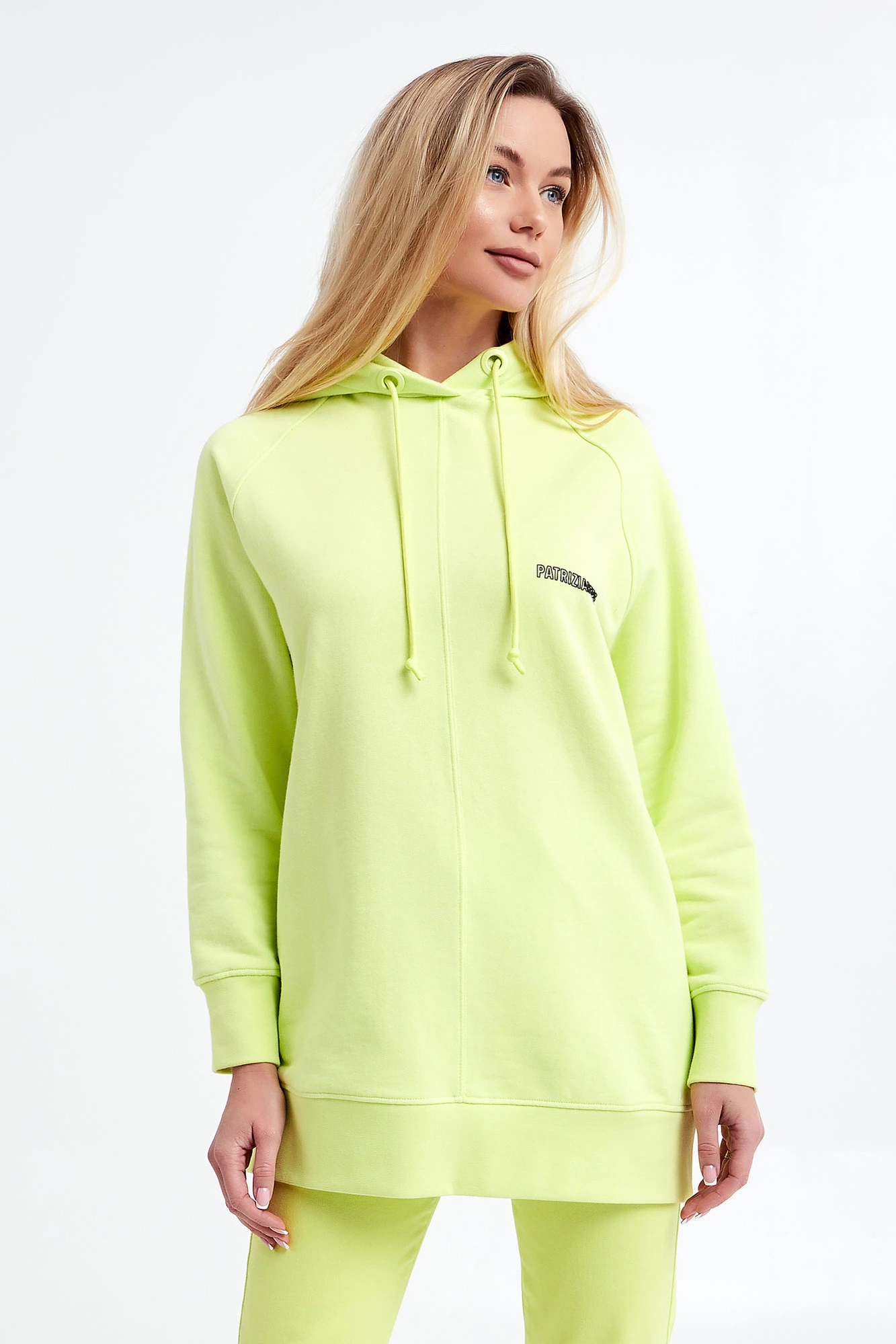 Długa bluza marki Patrizia Pepe w kolorze limonkowym. Model z kapturem z troczkami z gumową końcówką. Z przodu czarne, gumowane logo z nazwą marki. Rękawy i dół wykończone prążkowanym ściągaczem. Fason oversize. Wykonana z czystej bawełny szmerglowanej na zewnątrz.