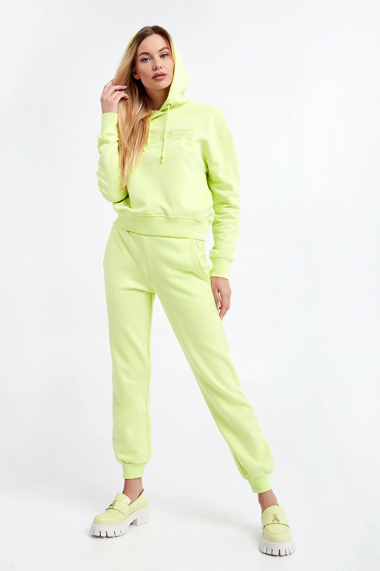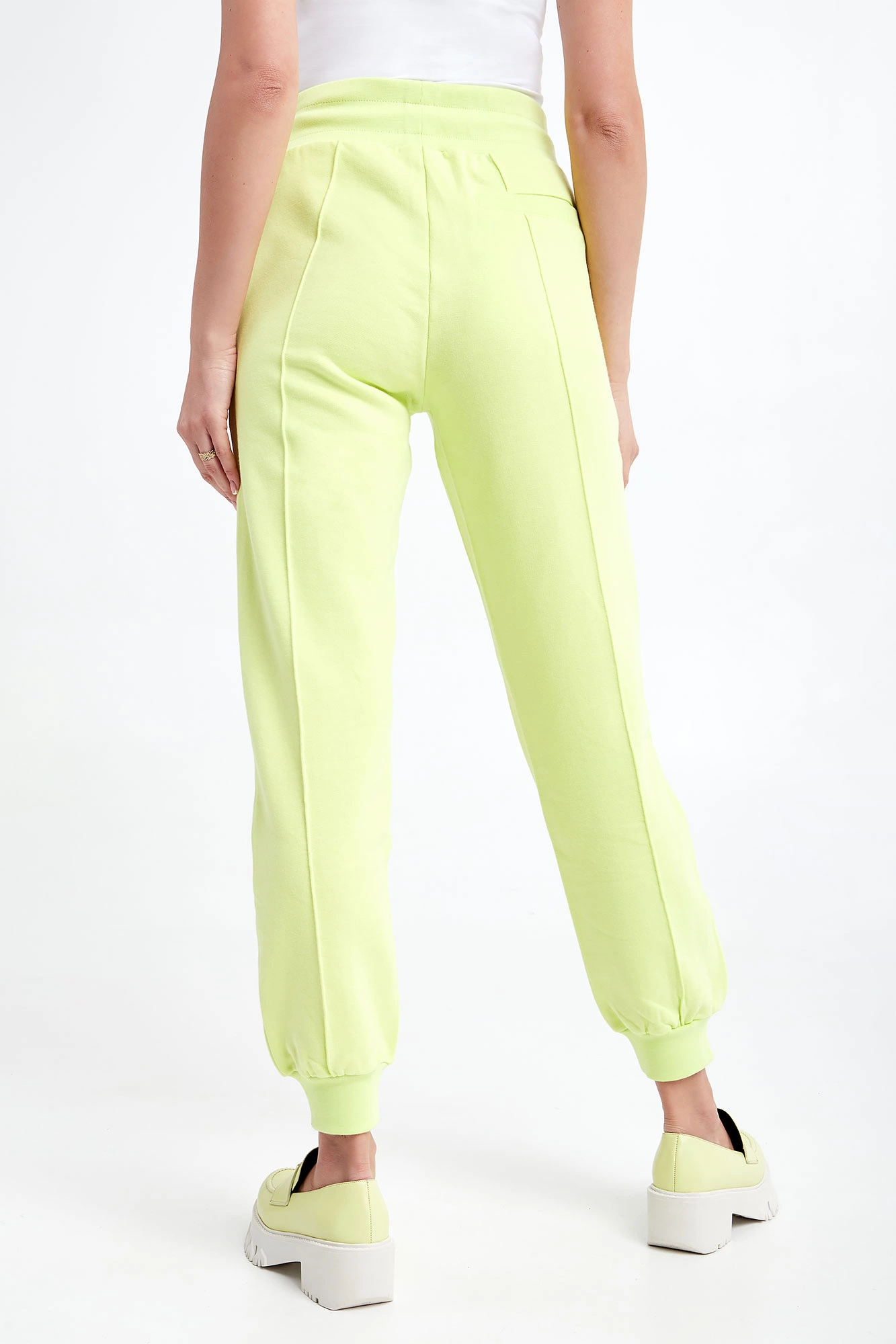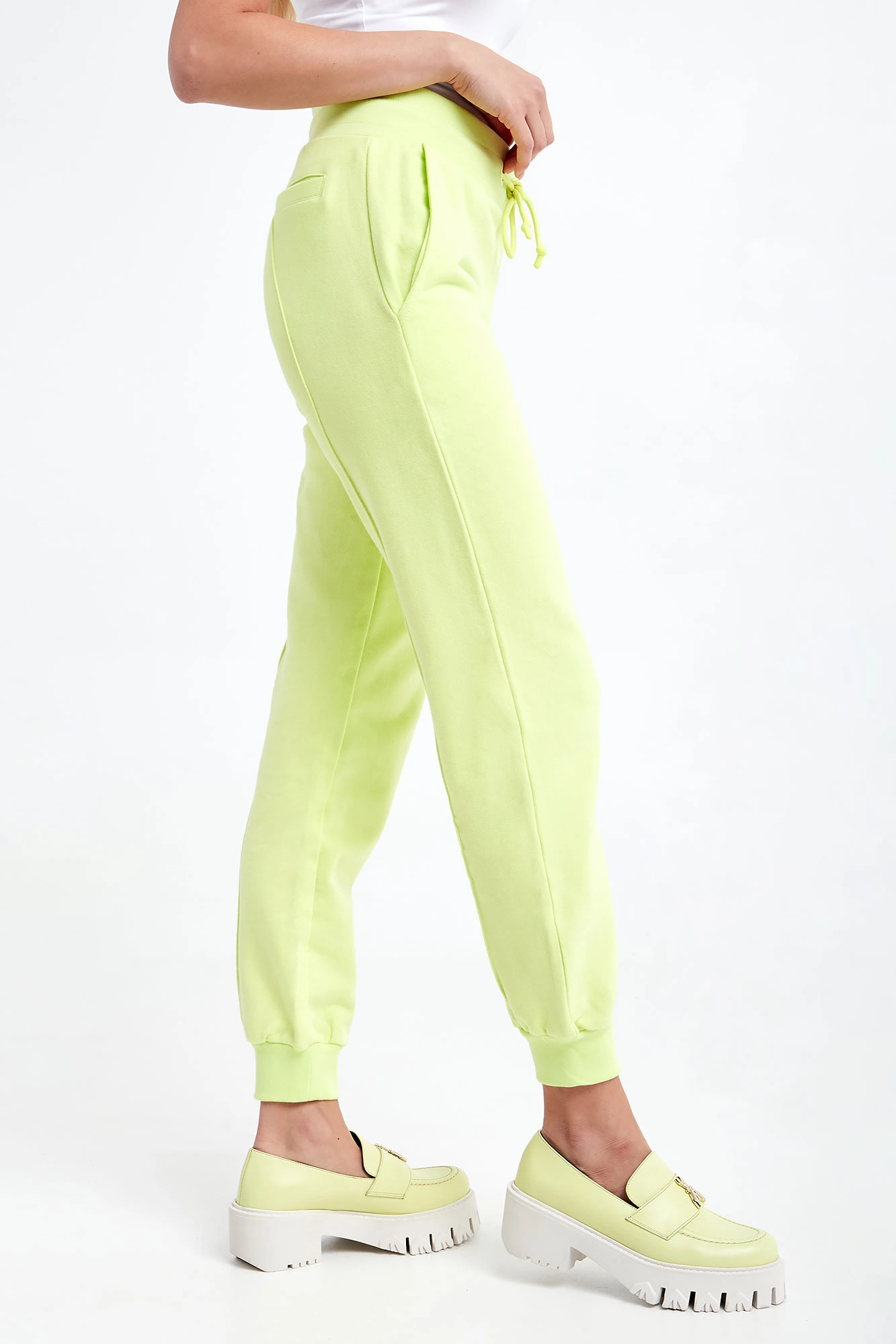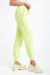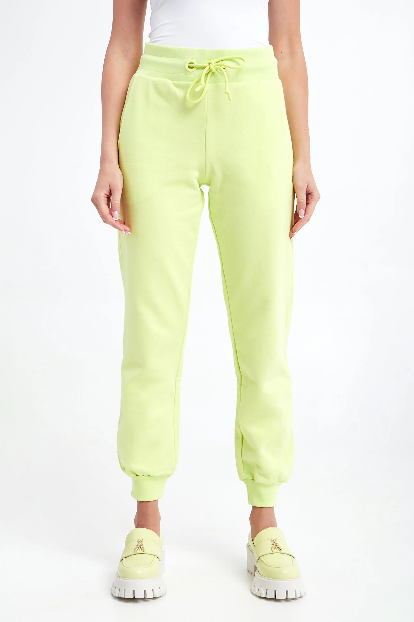 Spodnie dresowe marki Patrizia Pepe w kolorze limonkowym. Wykonane z dzianiny dresowej ze stuprocentowej bawełny. Model z linii Go Green, wspierającej zrównoważone procesy produkcyjne. Na przodzie dwie wpuszczane kieszenie. Przy kieszeni haft z nazwą marki. Regulacja w pasie za pomocą troczków z gumowym wykończeniem. Całość wykończona elastycznymi ściągaczami. Fason typu regular.
