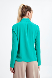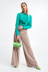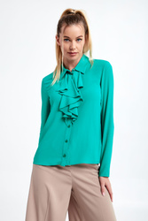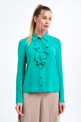 Koszula z żabotem marki Patrizia Pepe w kolorze zielonym. Wykonana z wiskozowej krepy. Model z klasycznym kołnierzykiem i ozdobną falbaną. Zapinana na sygnowane guziki. Fason regular.