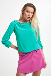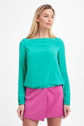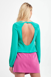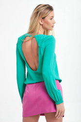 Bluzka z krepy marki Patrizia Pepe w kolorze zielonym. Dekolt typu łódka. Na plecach duże wycięcie, zapinane na dwa sygnowane guziki. Długie rękawy i dół zakończone ściągaczem. Wykonana z wiskozy.