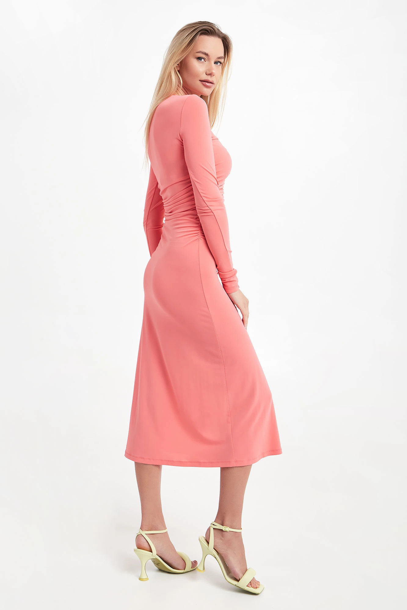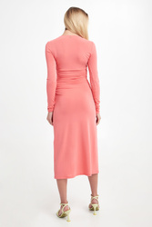 Sukienka marki Patrizia Pepe w kolorze koralowym. Dopasowany model wykonany z gładkiej, elastycznej dzianiny. Dekolt w kształcie V. Od biustu do talii ozdobne marszczenia podkreślające talię. Model z rozcięciem z przodu i długimi, wąskimi rękawami. Dołączona cielista halka. Fason slim, długość midi.