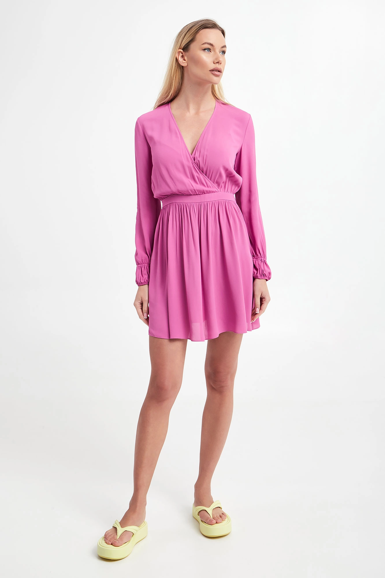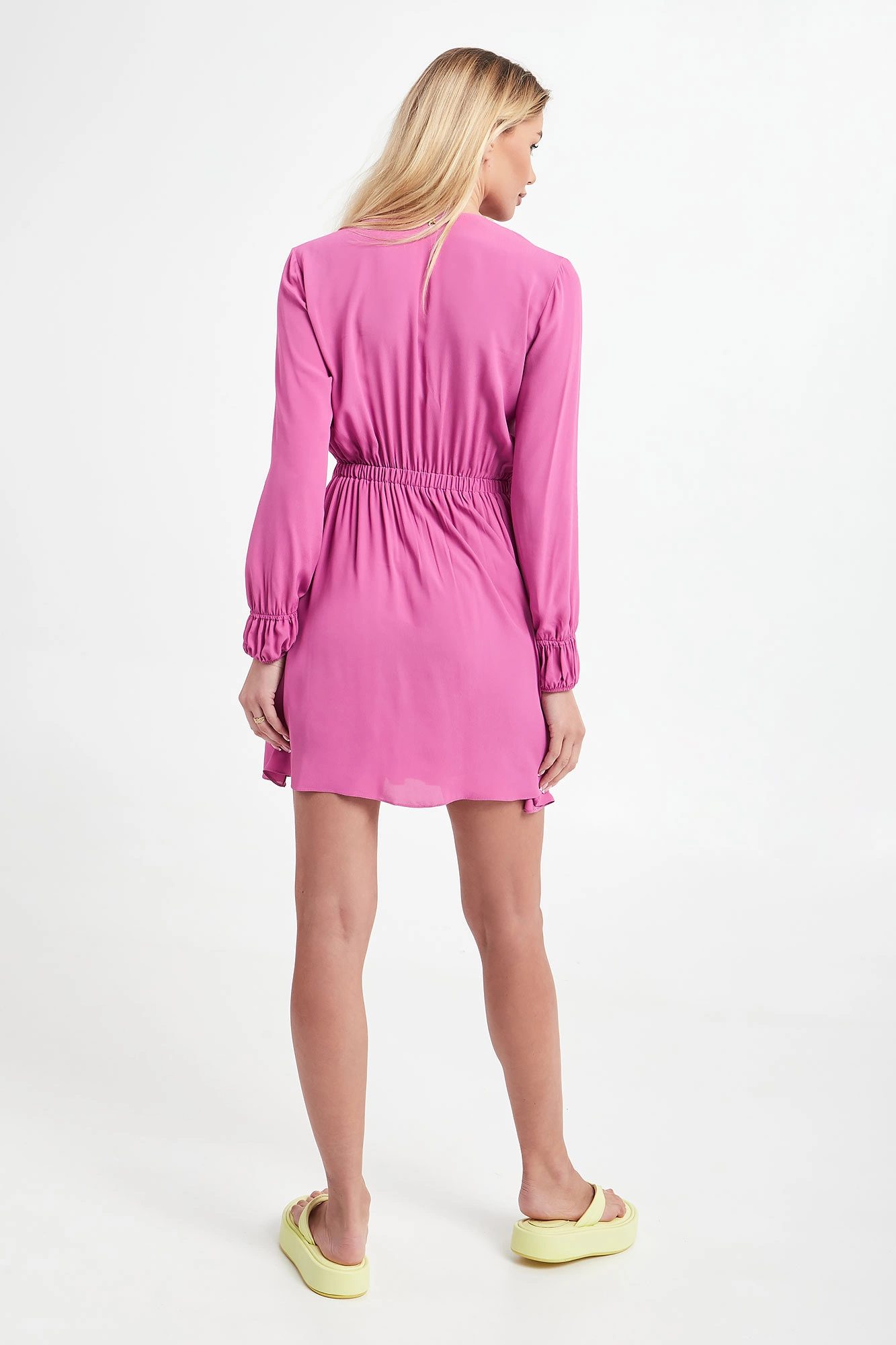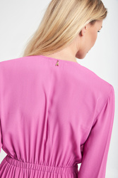 Sukienka marki Patrizia Pepe w kolorze fuksjowym. Wykonana z wiskozowej krepy. Kopertowy dekolt. Długie bufiaste rękawy zakończone podwójnym elastycznym ściągaczem. Odcięcie w pasie. Fason typu regular, długość mini.