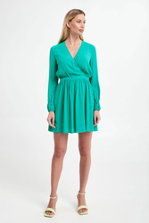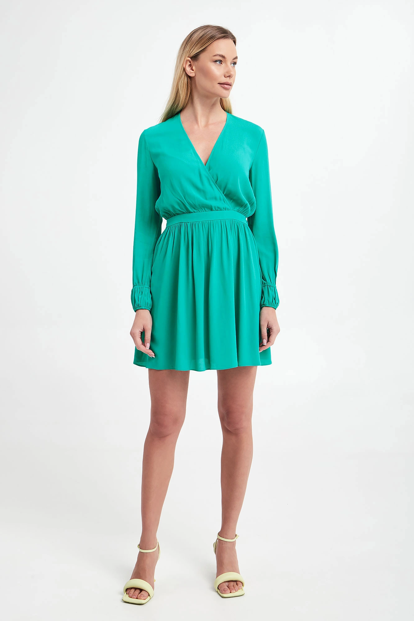Sukienka marki Patrizia Pepe w zielonym kolorze. Wykonana z wiskozowej krepy. Kopertowy dekolt. Długie bufiaste rękawy zakończone podwójnym elastycznym ściągaczem. Odcięcie w pasie. Fason typu regular, długość mini.