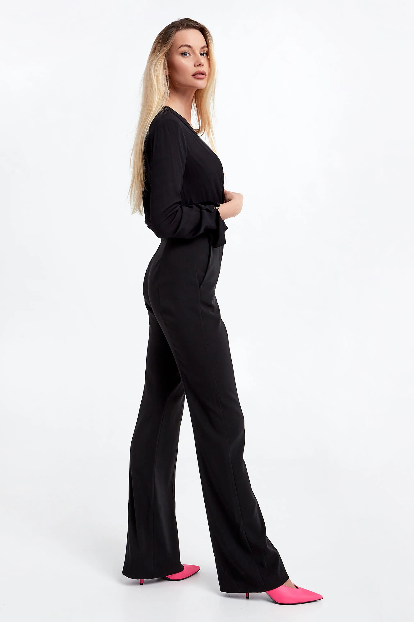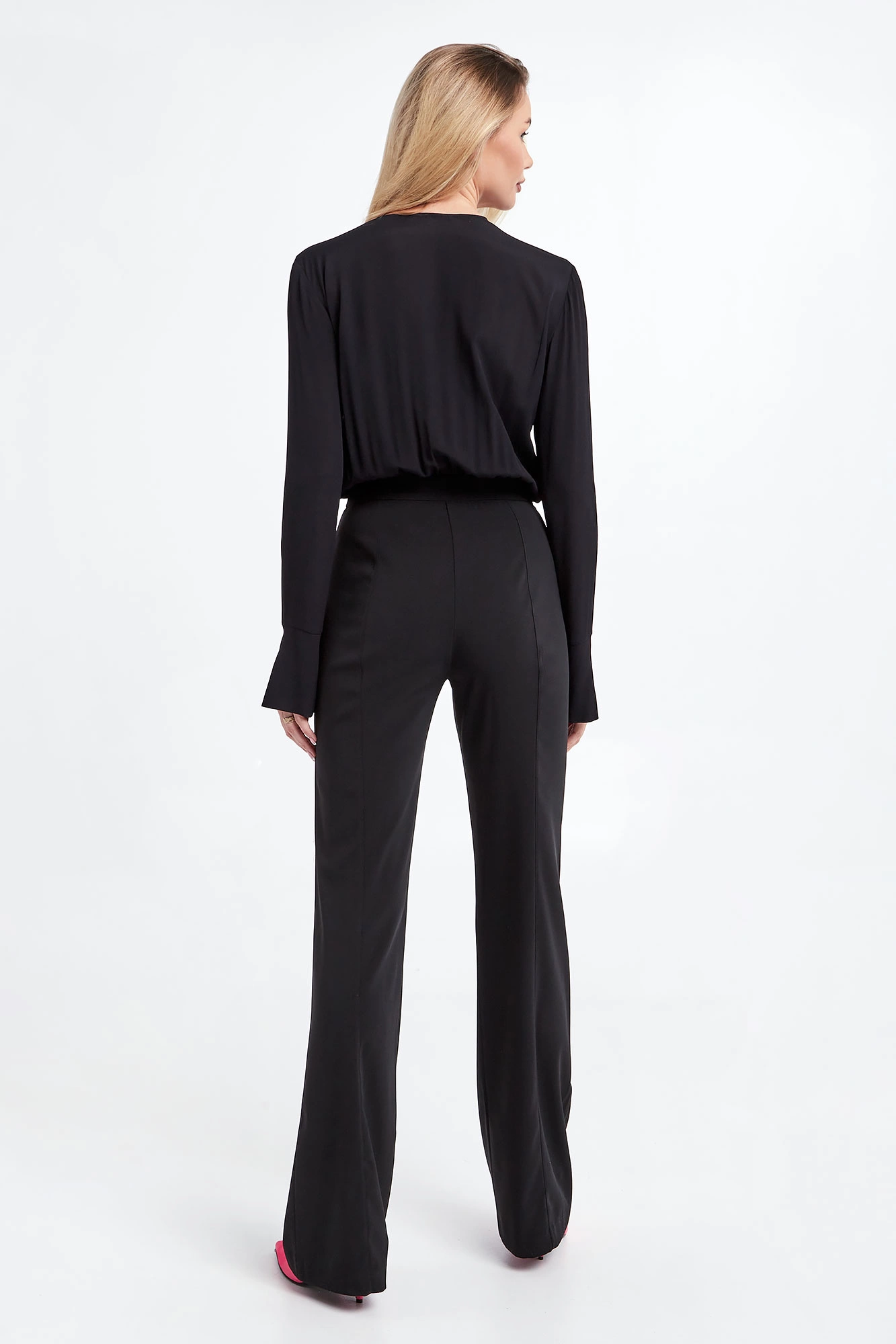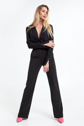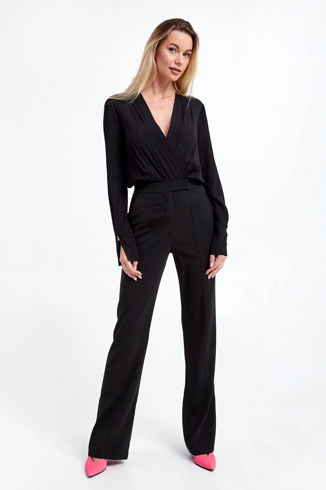 Kombinezon kopertowy marki Patrizia Pepe w kolorze czarnym. Wykonany z połączenia dwóch tkanin z krepy wiskozowej o różnej strukturze. Zapinany na guzik, haftkę w talii i zamek. Model z długim rękawem i dekoltem w kształcie litery V. Długie rękawy zakończone mankietem z rozcięciem ozdobiony złotą zawieszką z logo FLY. Dwie, wsuwane kieszenie. Proste długie nogawki z przeszyciem imitującym kant. Fason regular.