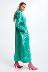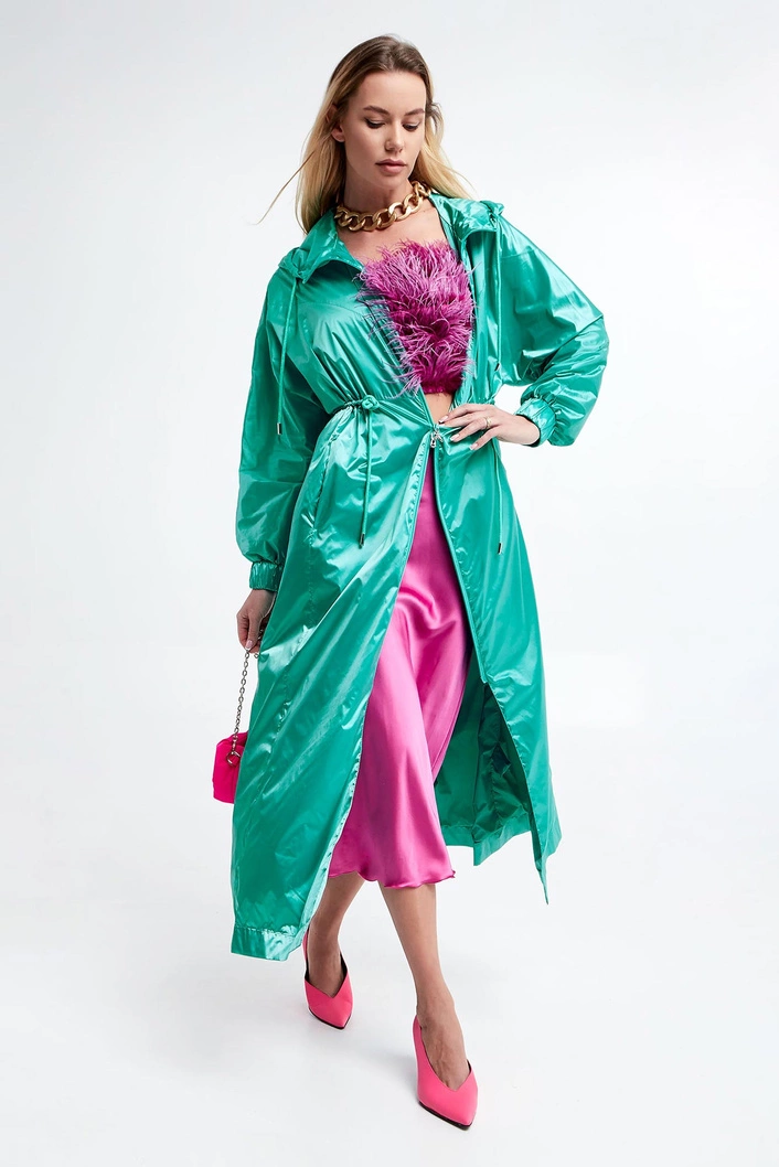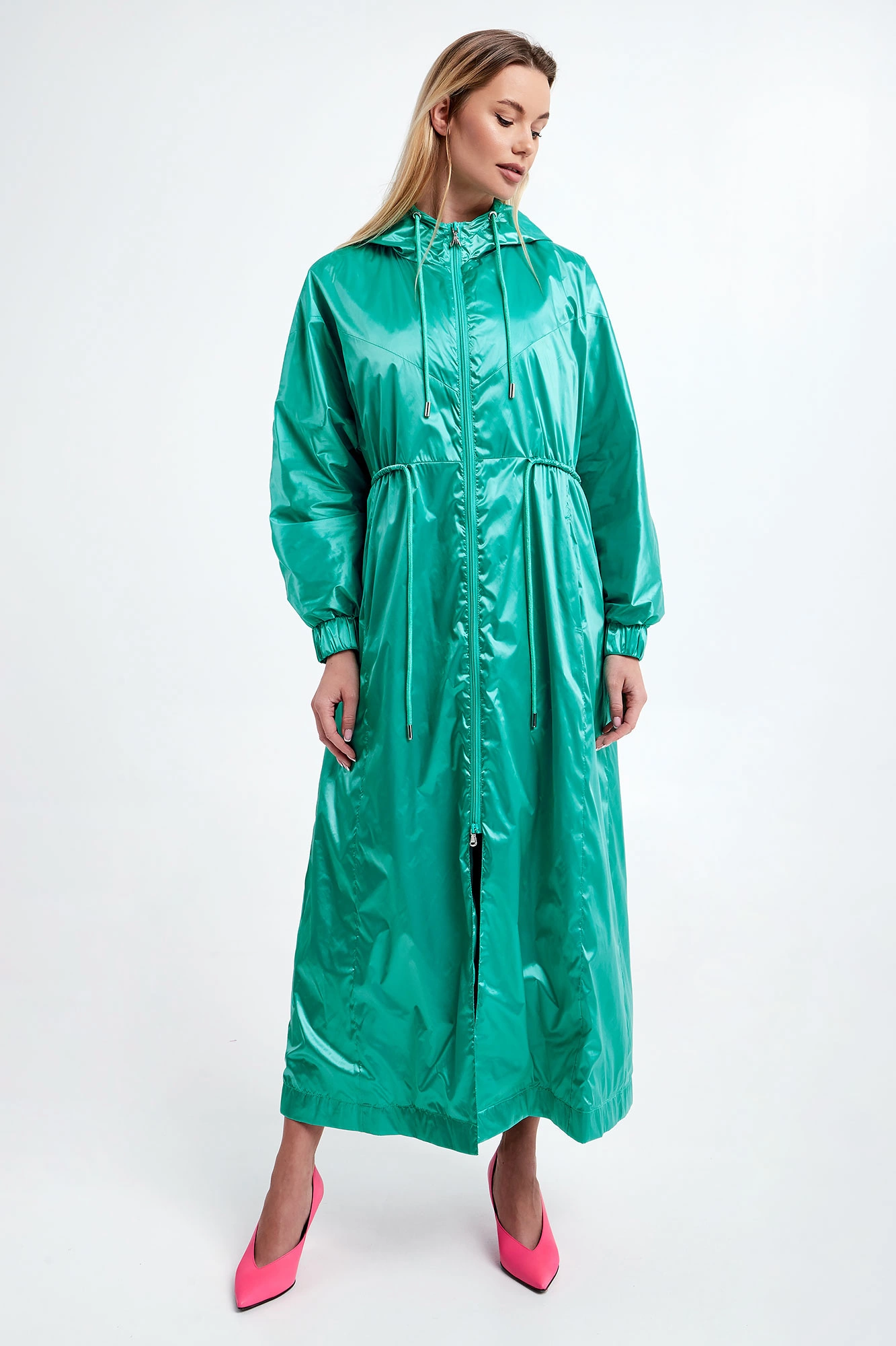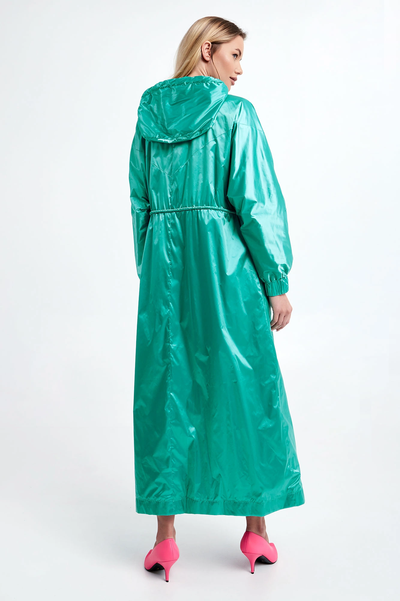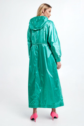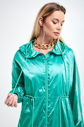 Długa parka marki Patrizia Pepe w kolorze zielonym. Wykonana z połyskującego nylonu. Zapinana na dwukierunkowy zamek błyskawiczny z zawieszką z logo FLY. Model z kołnierzem i kapturem z troczkami. W talii ściagana za pomocą troczków. Dwie boczne, wsuwane kieszenie. Rękawy zakończone ściągaczami. Fason relaxed.