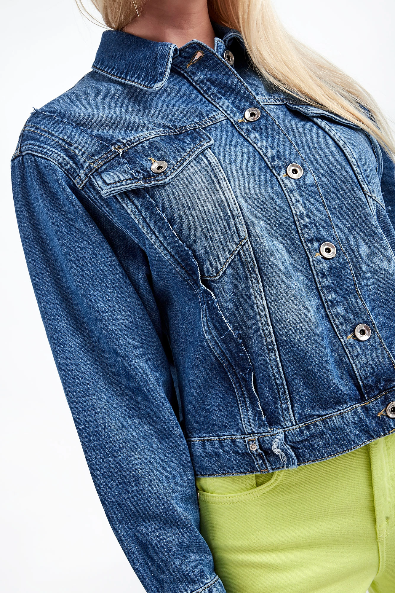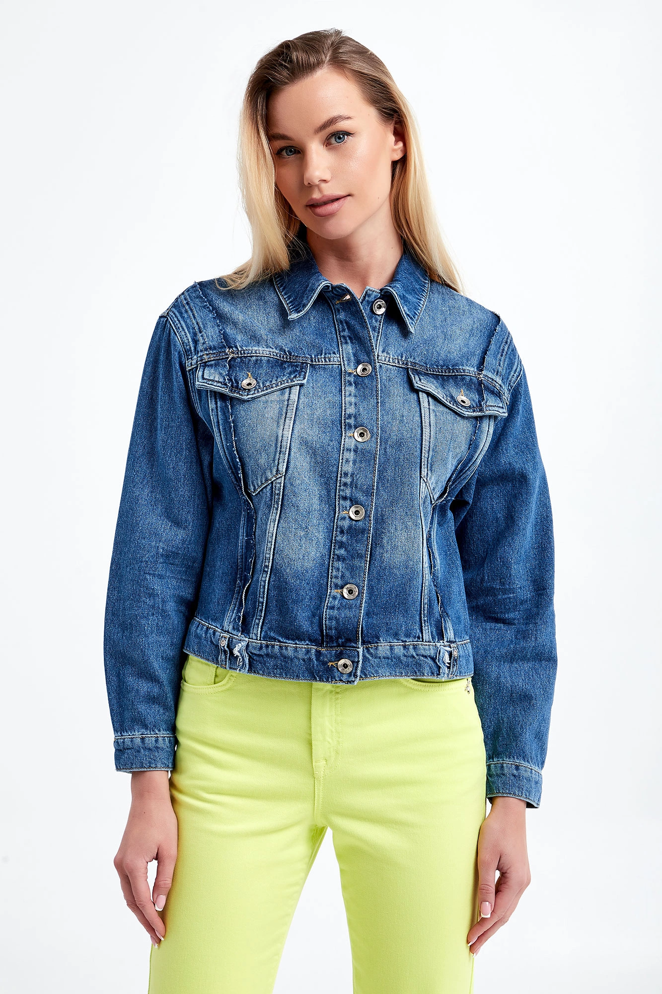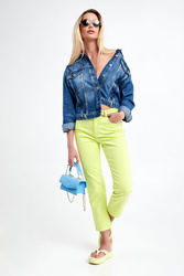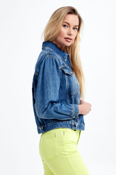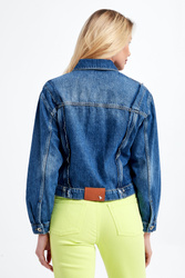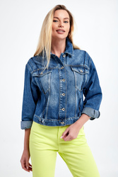Kurtka jeansowa marki Patrizia Pepe w kolorze niebieskim. Model z linii Go Green, wykonany z włókien, wyprodukowanych przy użyciu zrównoważonych procesów produkcyjnych, zmniejszających tym samym ich wpływ na środowisko. Wzdłuż kurtki ozdobne przeszycia. Zapinana na srebrne guziki. Z przodu dwie kieszenie z patką. Szeroki rękaw wykończony mankietami. Wykonana z bawełny. Fason regular.