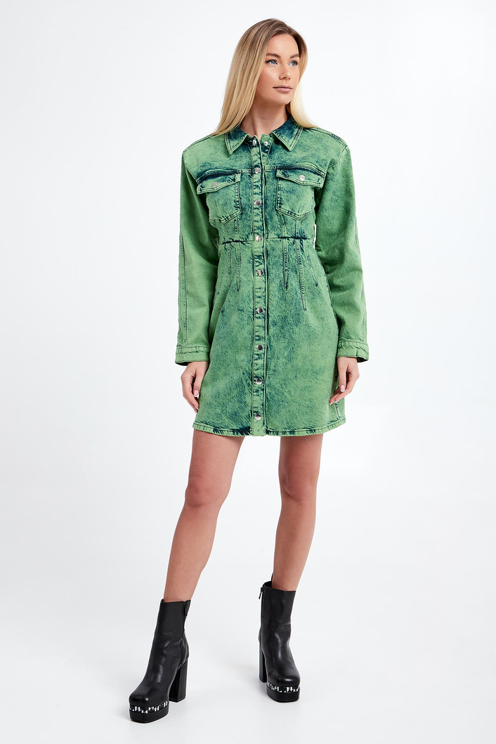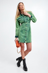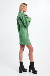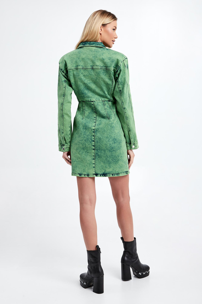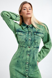 Sukienka jeansowa marki Gestuz w zielonym kolorze. Wykonana z nieco elastycznej mieszanki bawełny pochodzącej z ekologicznych upraw i lyocellu. Na całości efekt sprania. Fason typu relaxed o długości mini. Zapinana za pomocą nap w srebrnym kolorze. Model z dwoma kieszeniami z patkami zapinanymi za pomocą nap. Długie rękawy zakończone zapinanymi mankietami. Dekolt wykończony kołnierzem. Na całości ozdobne przeszycia.