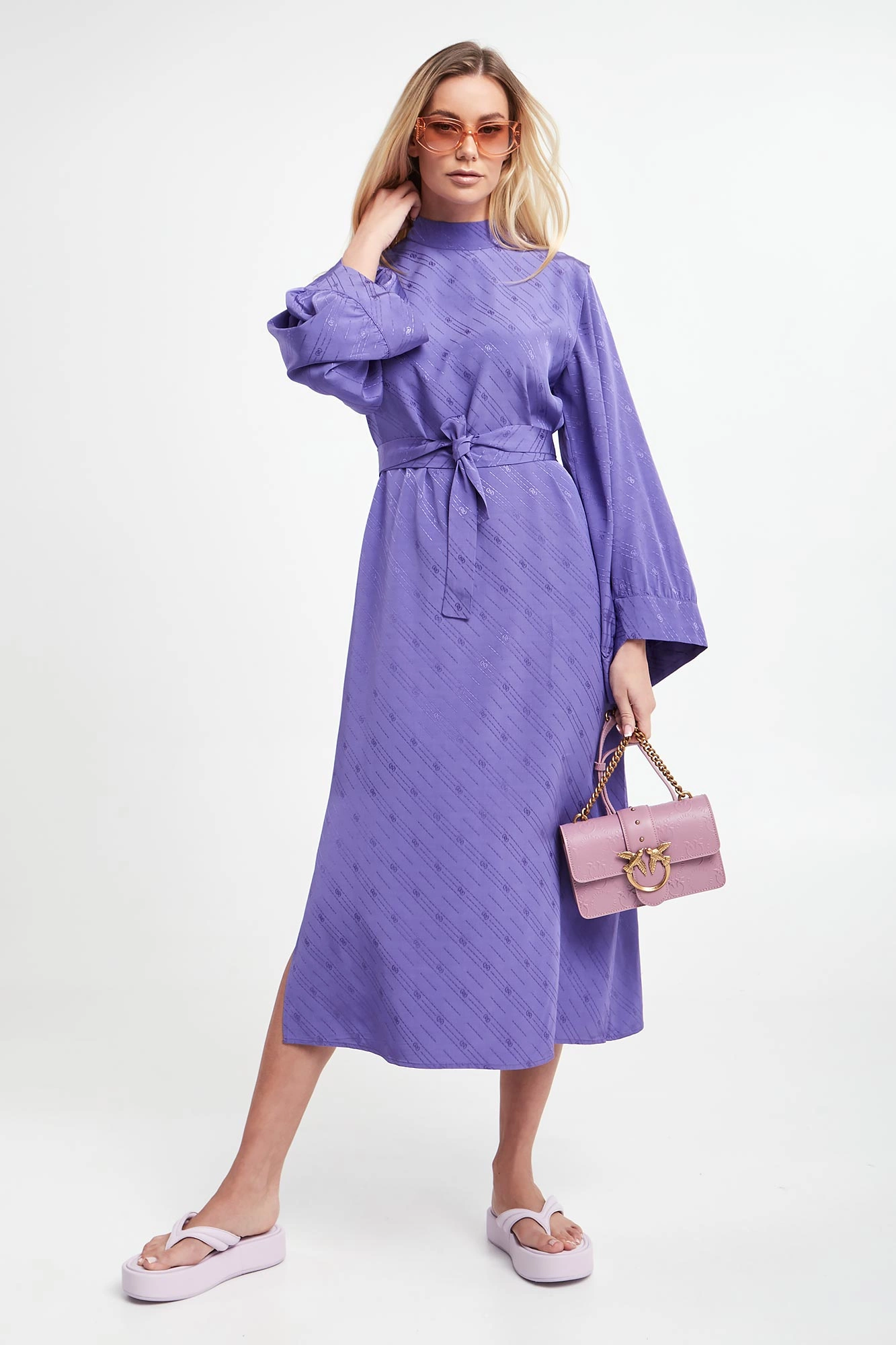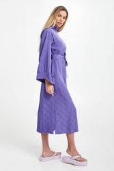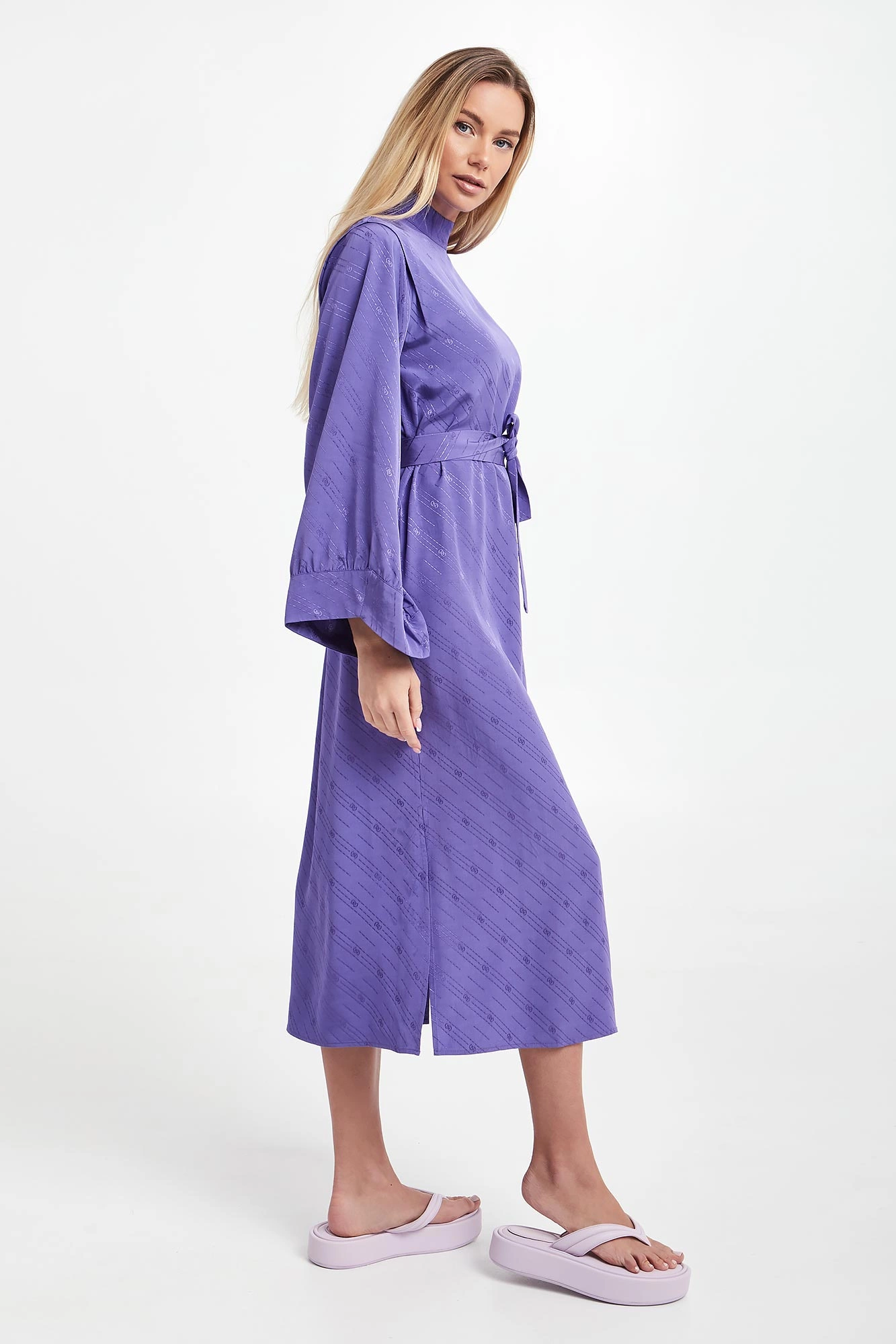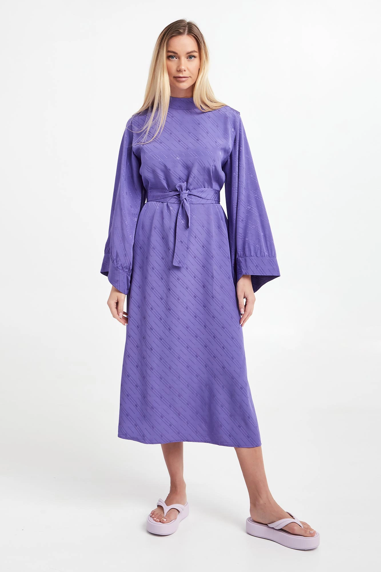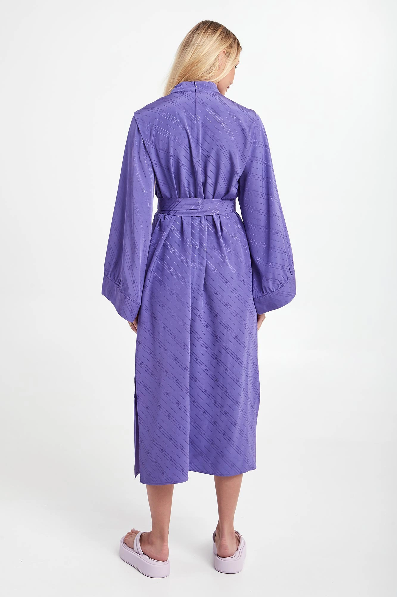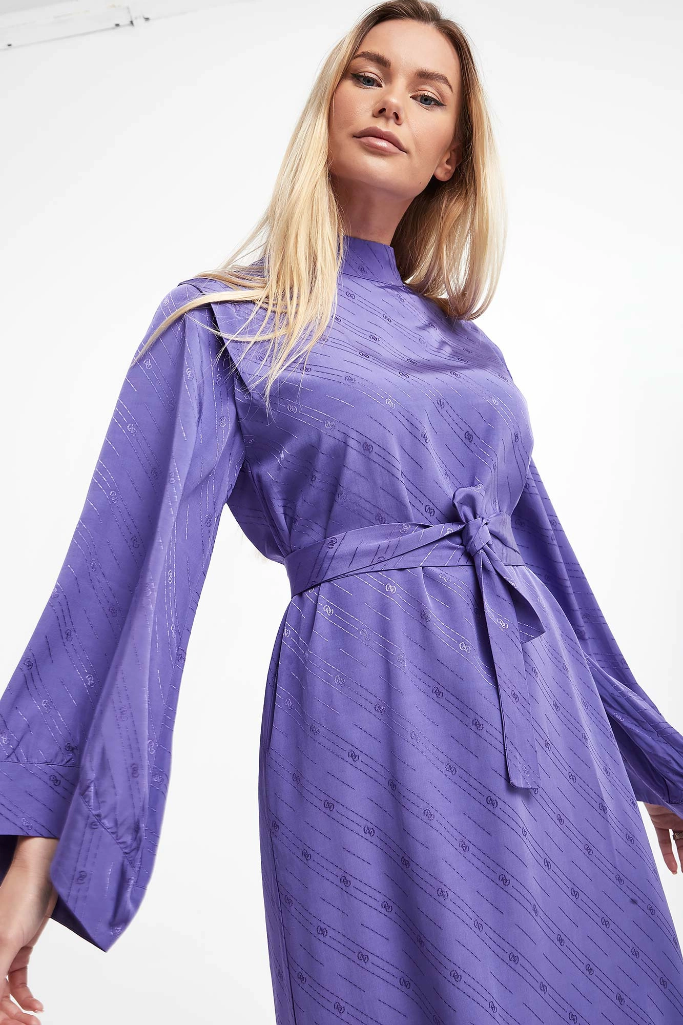 Sukienka żakardowa marki Gestuz w kolorze fioletowym. Na całości multiplikacja logo marki. Model ze stójką, zapinany na kryty suwak z tyłu. Na ramionach zaszewki. Dodatkowo w talii pasek. Ukośne, szerokie rękawy zakończone lamówką, inspirowane kimonem. Fason relaxed, długość midi. Wykonane z odpowiedzialnej mieszanki z włóknami EcoVero™ Lenzing.