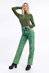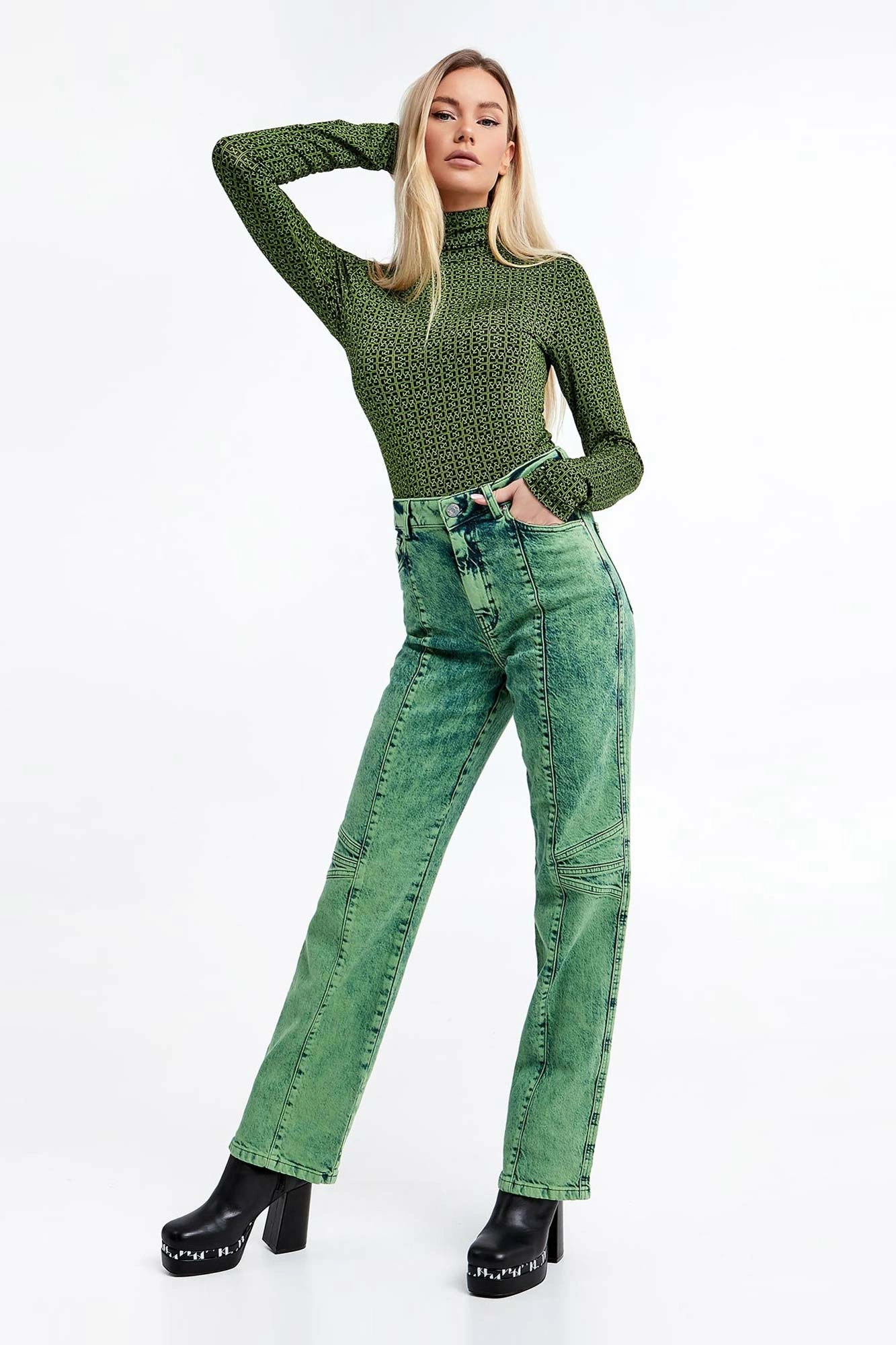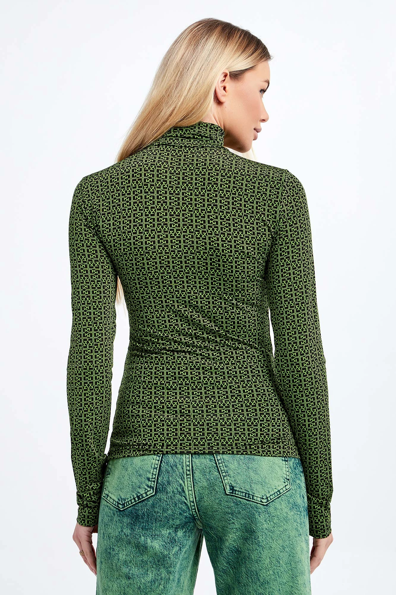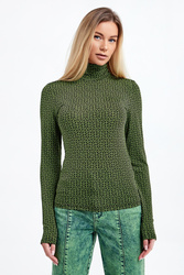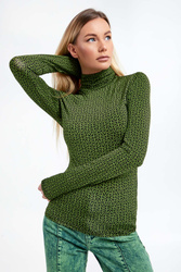 Bluzka z golfem marki Gestuz w czarnym kolorze. Na całości zielony wzór w postaci multiplikacji logo marki. Wykonany z wiskozowej, elastycznej tkaniny. Długie rękawy. Dopasowany fason typu slim. Idealnie sprawdzi się jako baza wielu wiosennych stylizacji.