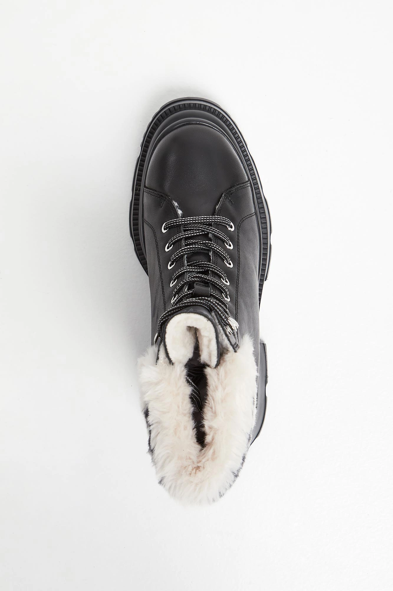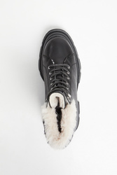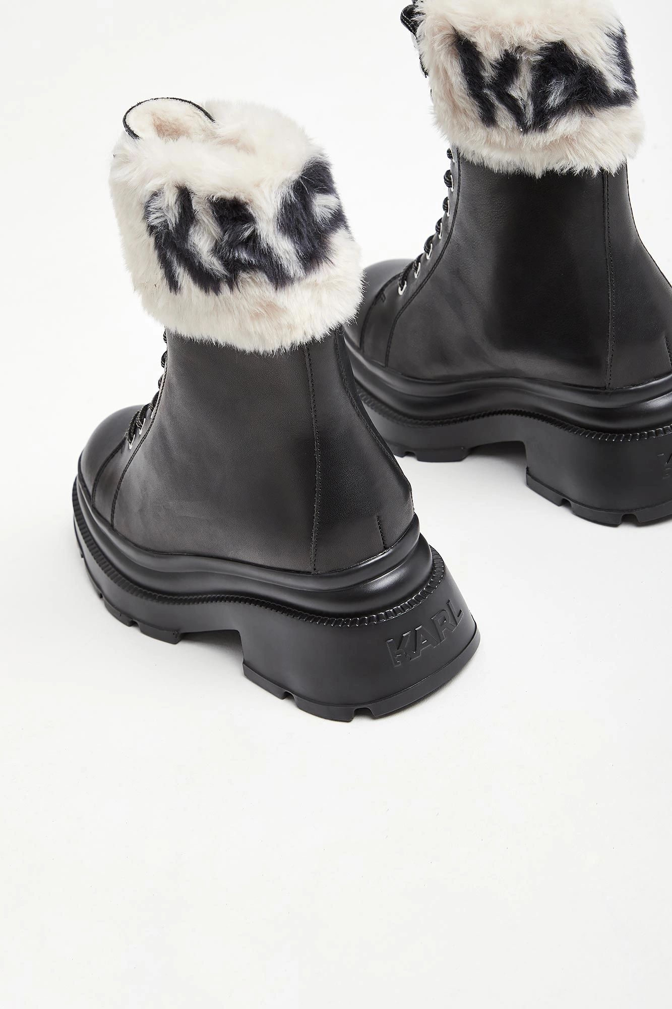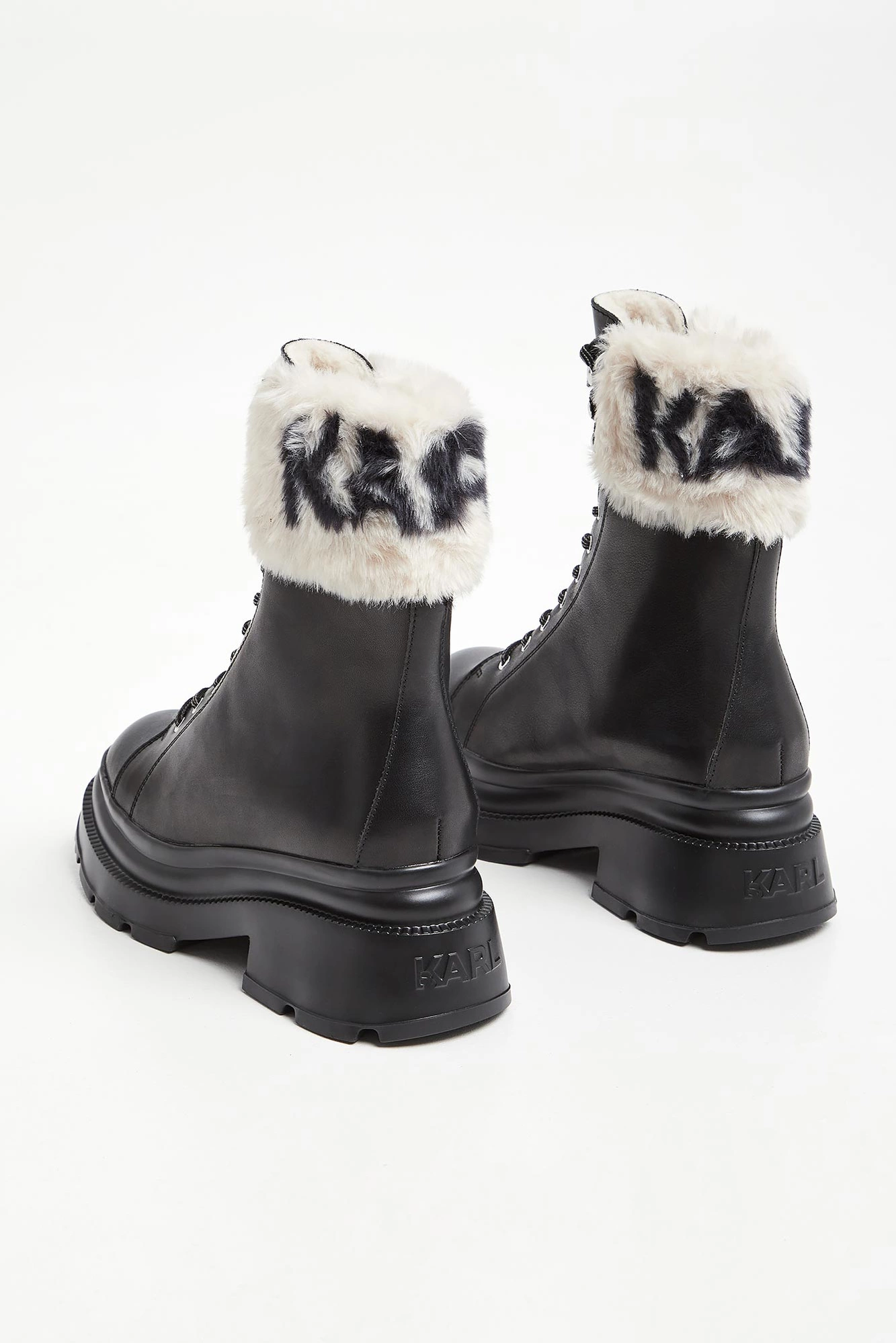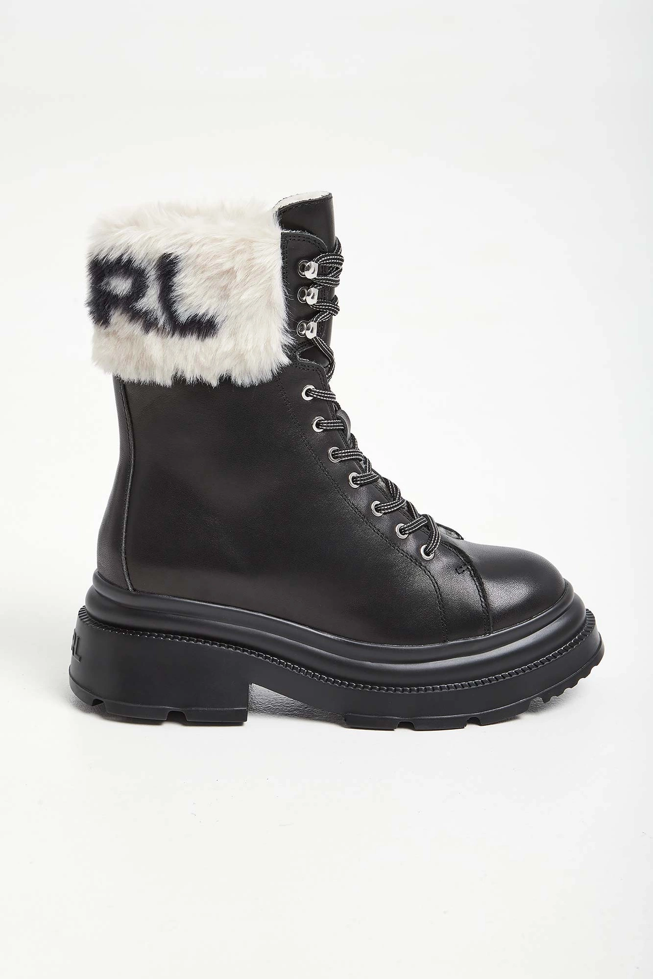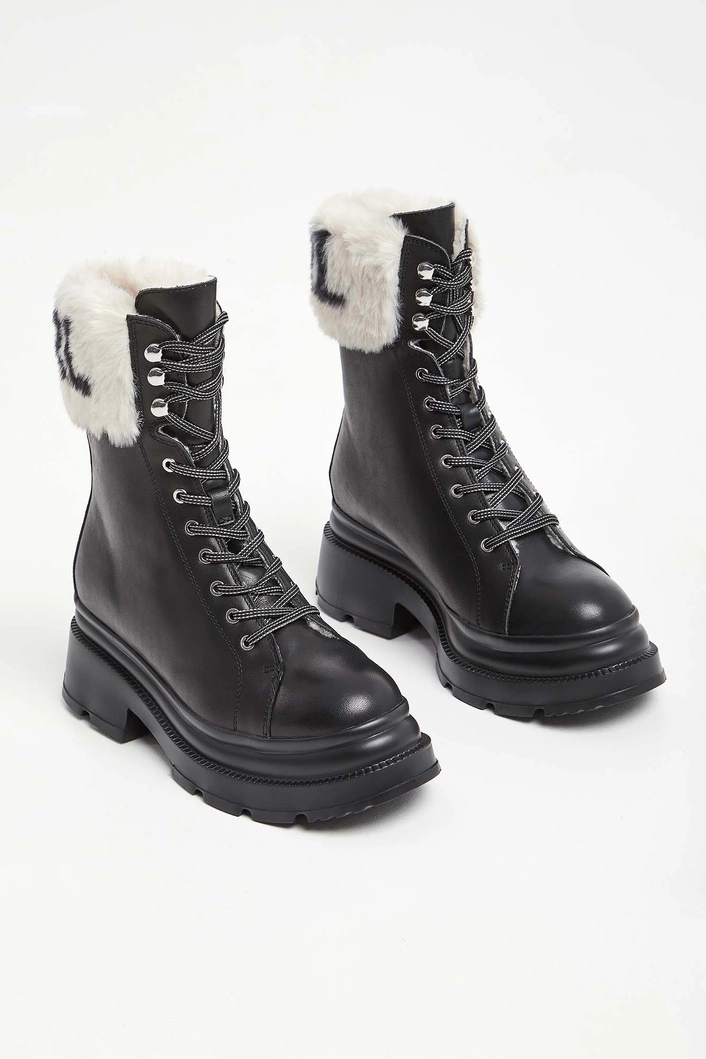 Trapery marki Karl Lagerfeld w czarnym kolorze. Wykonane z gładkiej, naturalnej skóry. Wyższa cholewka wykończona u góry futerkiem z nazwą marki w kontrastowym kolorze. Wiązane za pomocą biało-czarnych sznurówek. Podeszwa sygnowana. Wyściółka wykończona futerkiem.