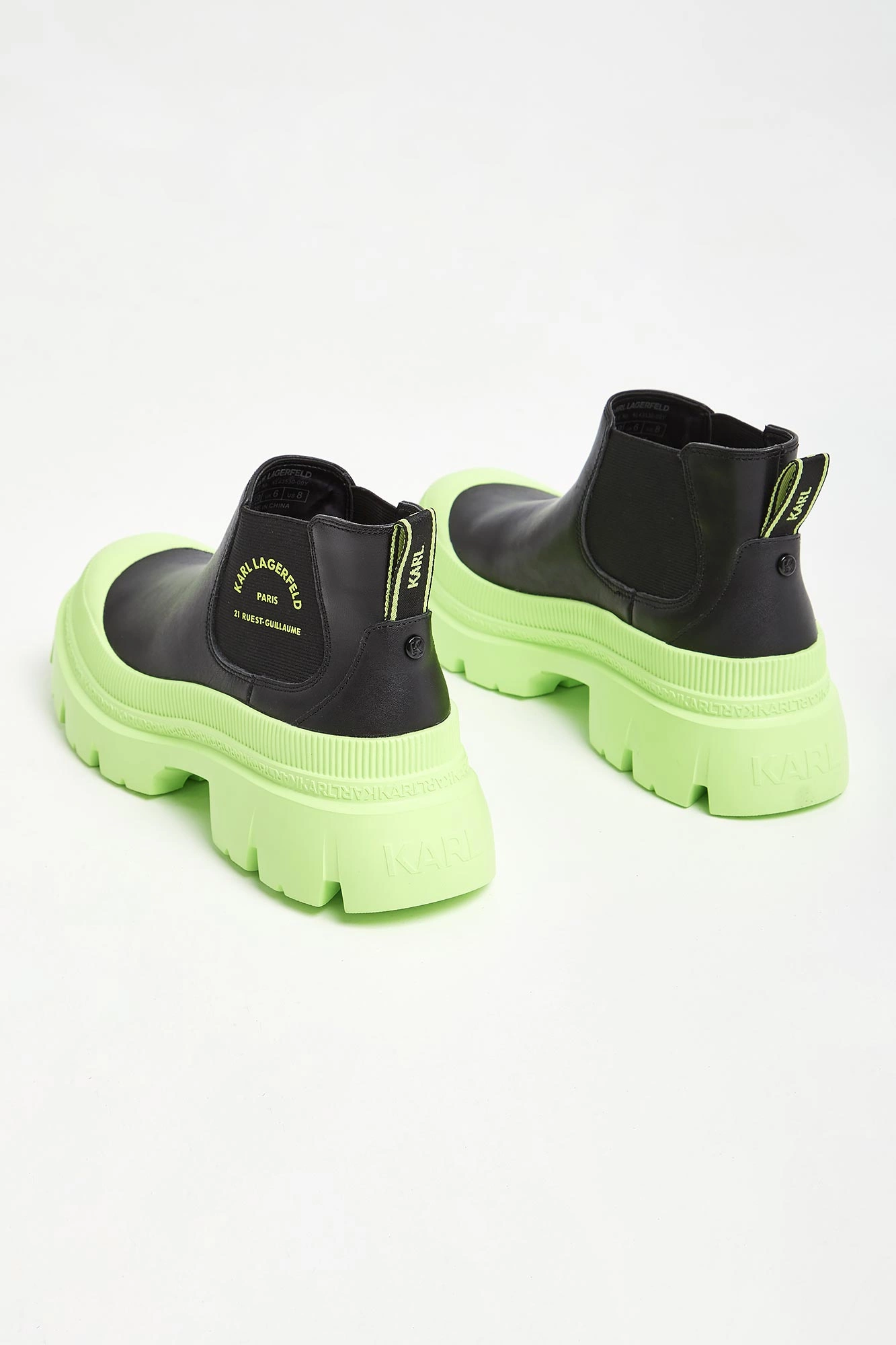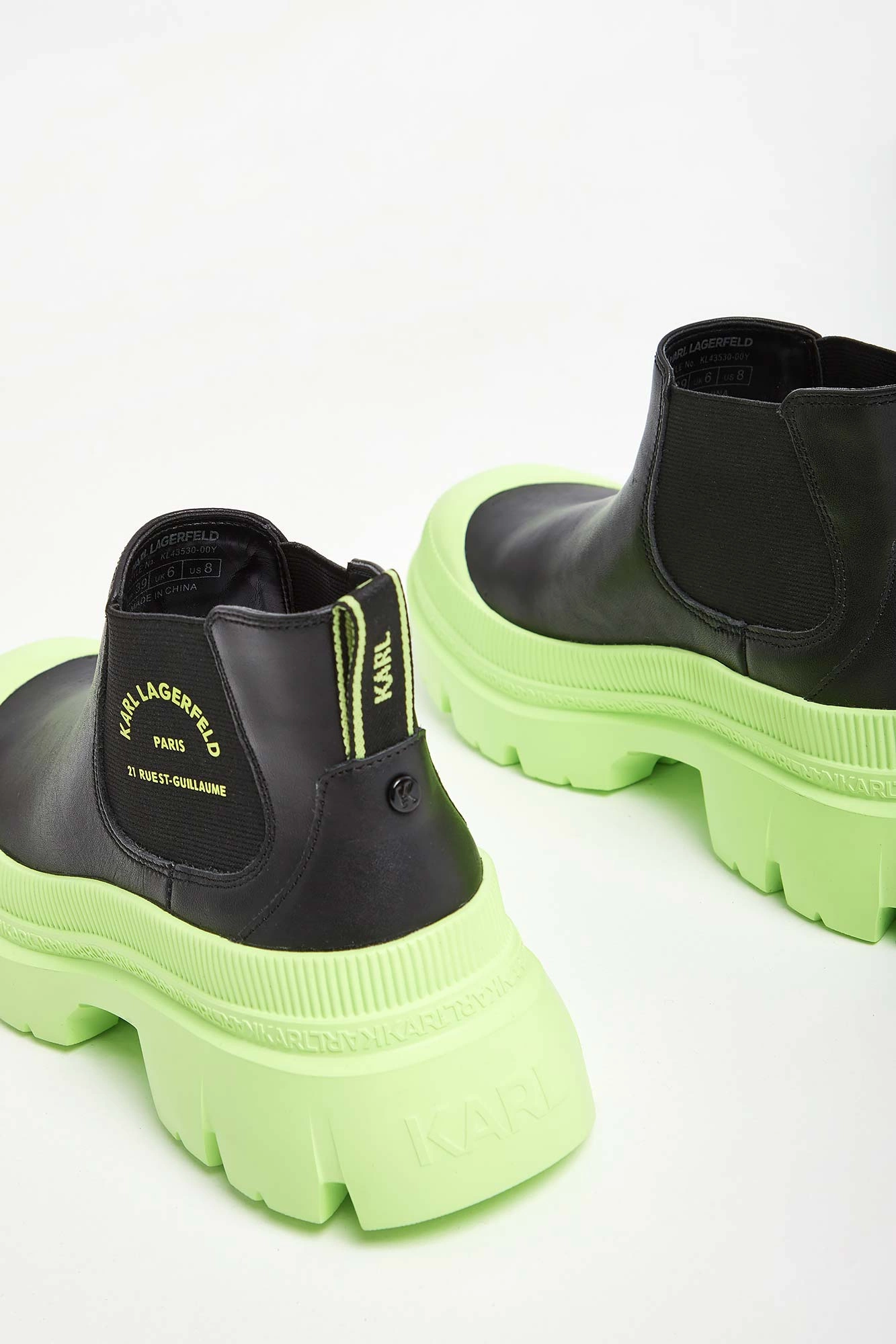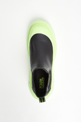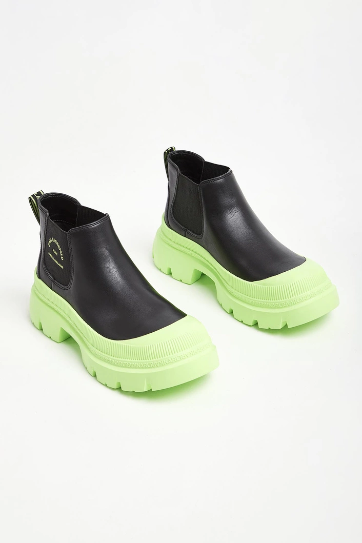 Sztyblety marki Karl Lagerfeld w czarno-limonkowym kolorze. Wysoka, sygnowana, traperowa podeszwa. Po boku wstawka elastycznej gumy z nadrukiem nazwy marki w limonkowym kolorze. Z tyłu pętelka ułatwiająca zakładanie. Wsuwane.
